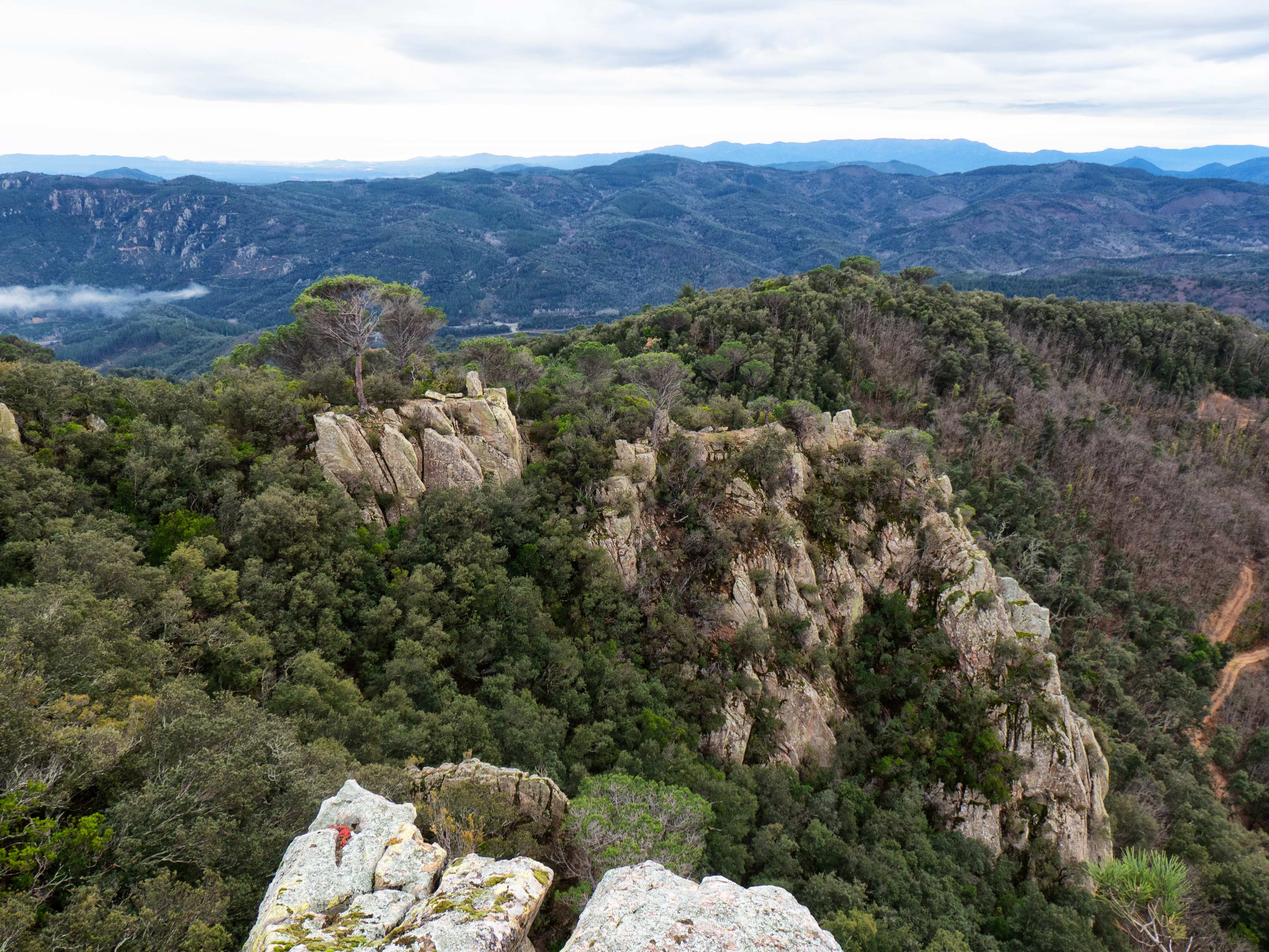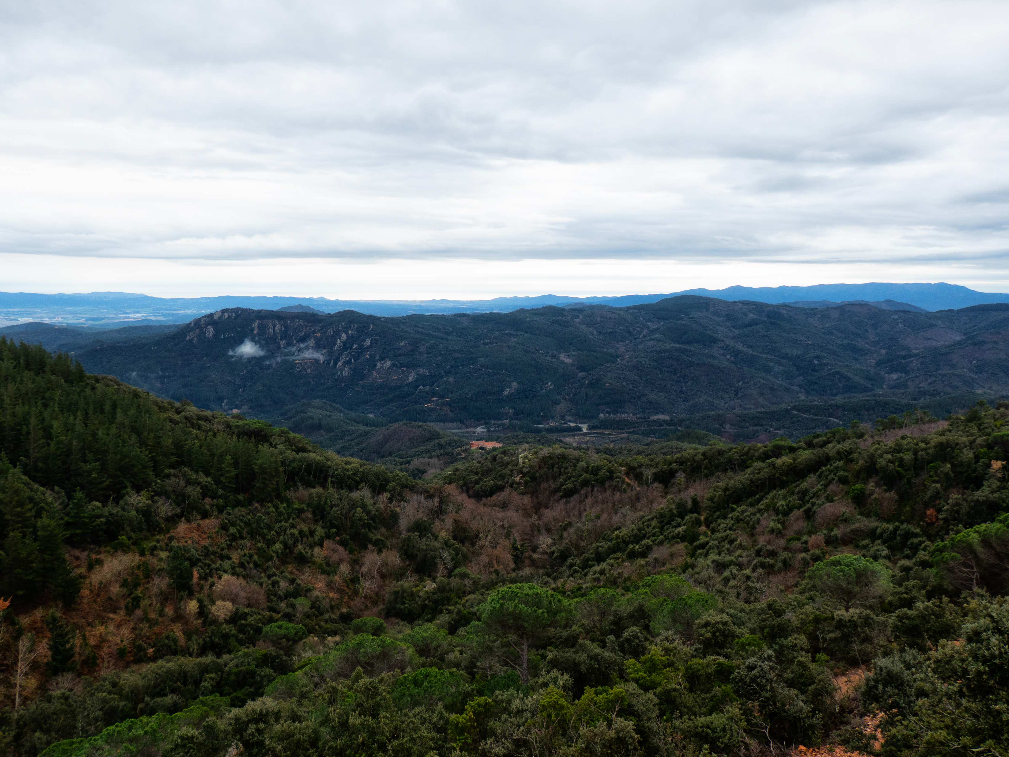 Al estar en la parte más exterior de les Guilleries, tenemos una perspectiva clara de todo el panorama meridional. Más allá del monasterio de Sant Salvi de Cladells, donde hemos dejado el coche, vemos el valle de la Riera de Santa Coloma, tras el cual la Prelitoral se vuelve a levantar brevemente antes de precipitarse sobre la Plana de Girona. En el horizonte, la Cordillera Litoral cierra el paisaje, con su punto más alto, el Montnegre, claramente destacado a la derecha.