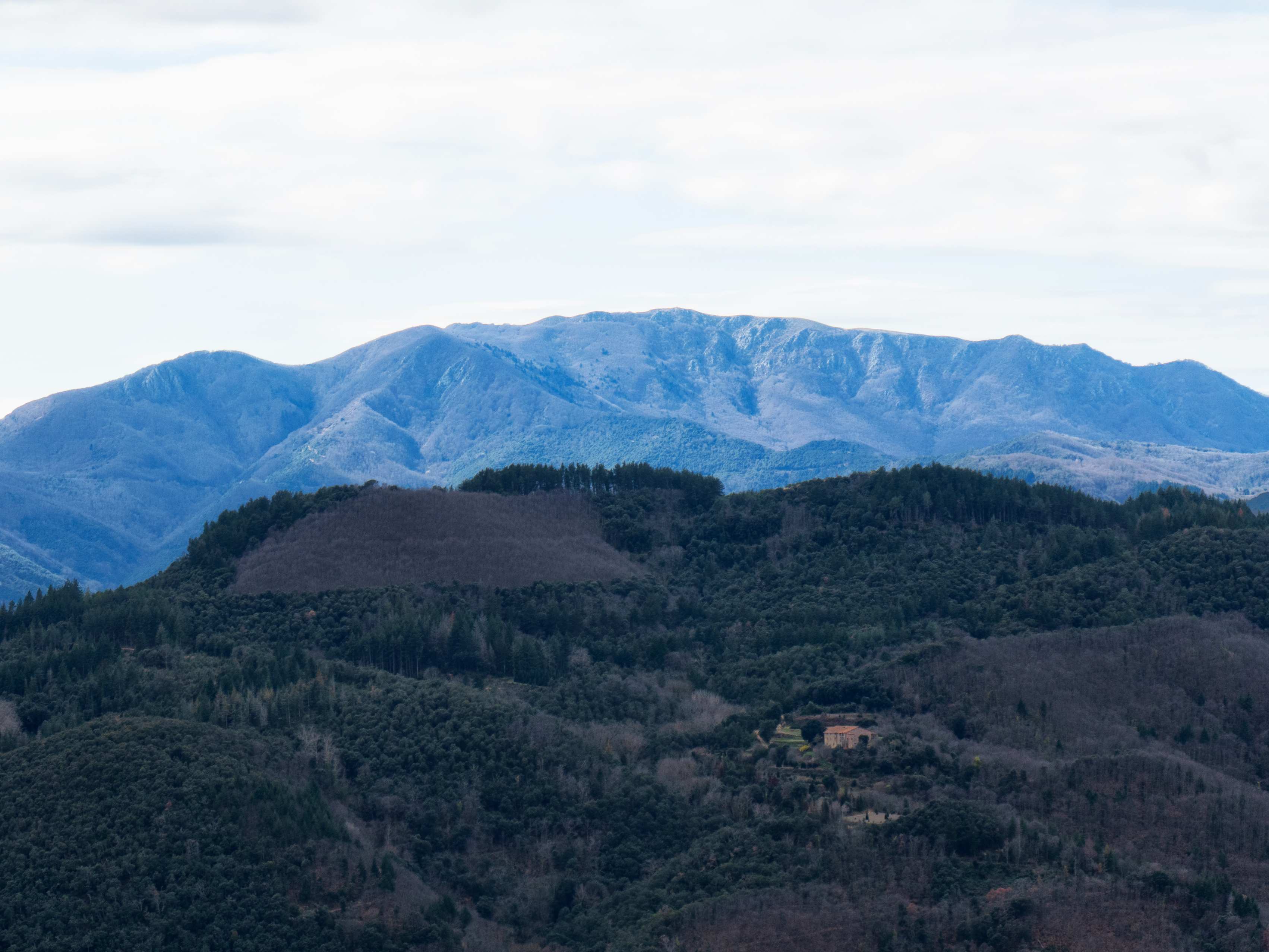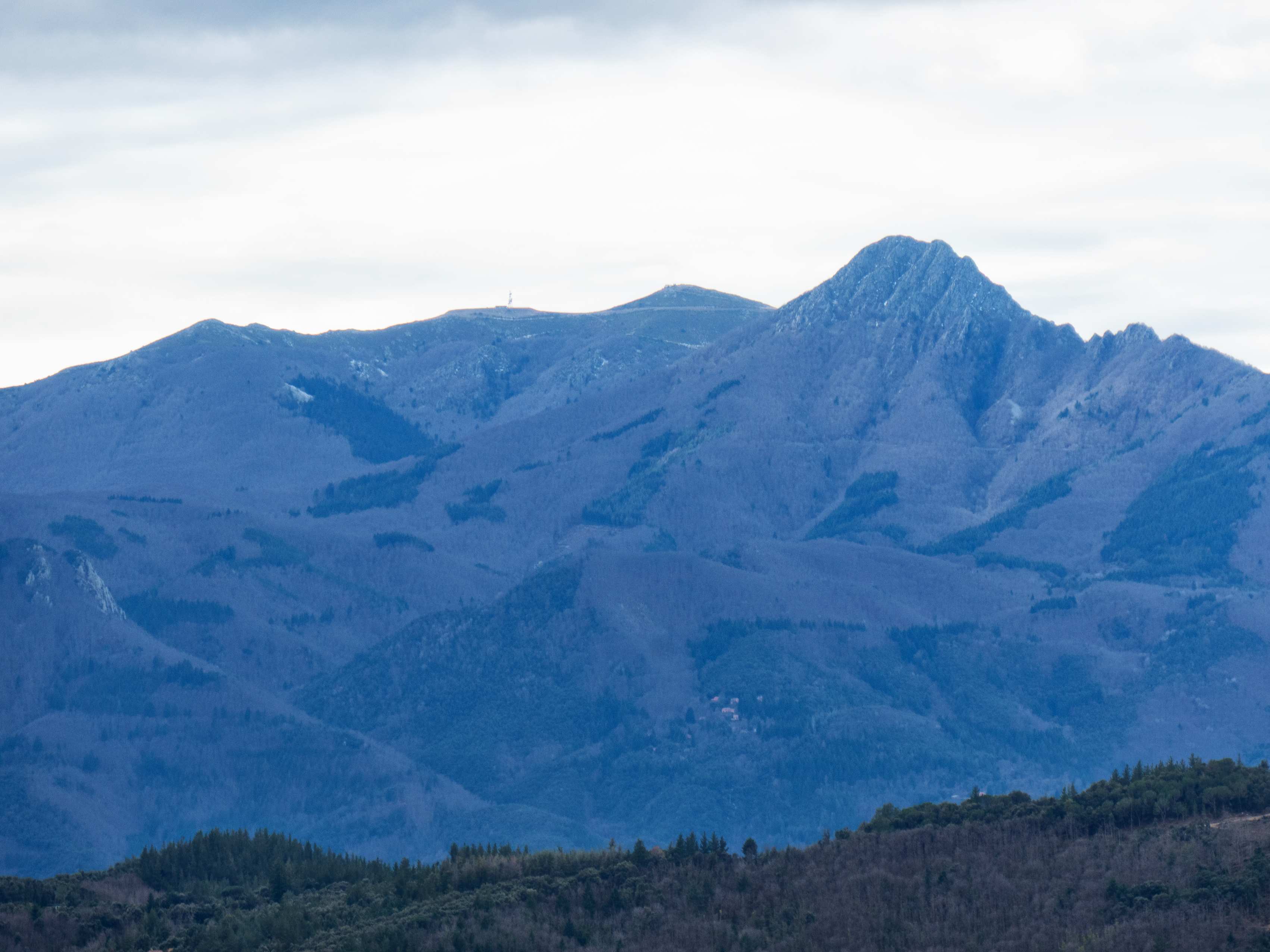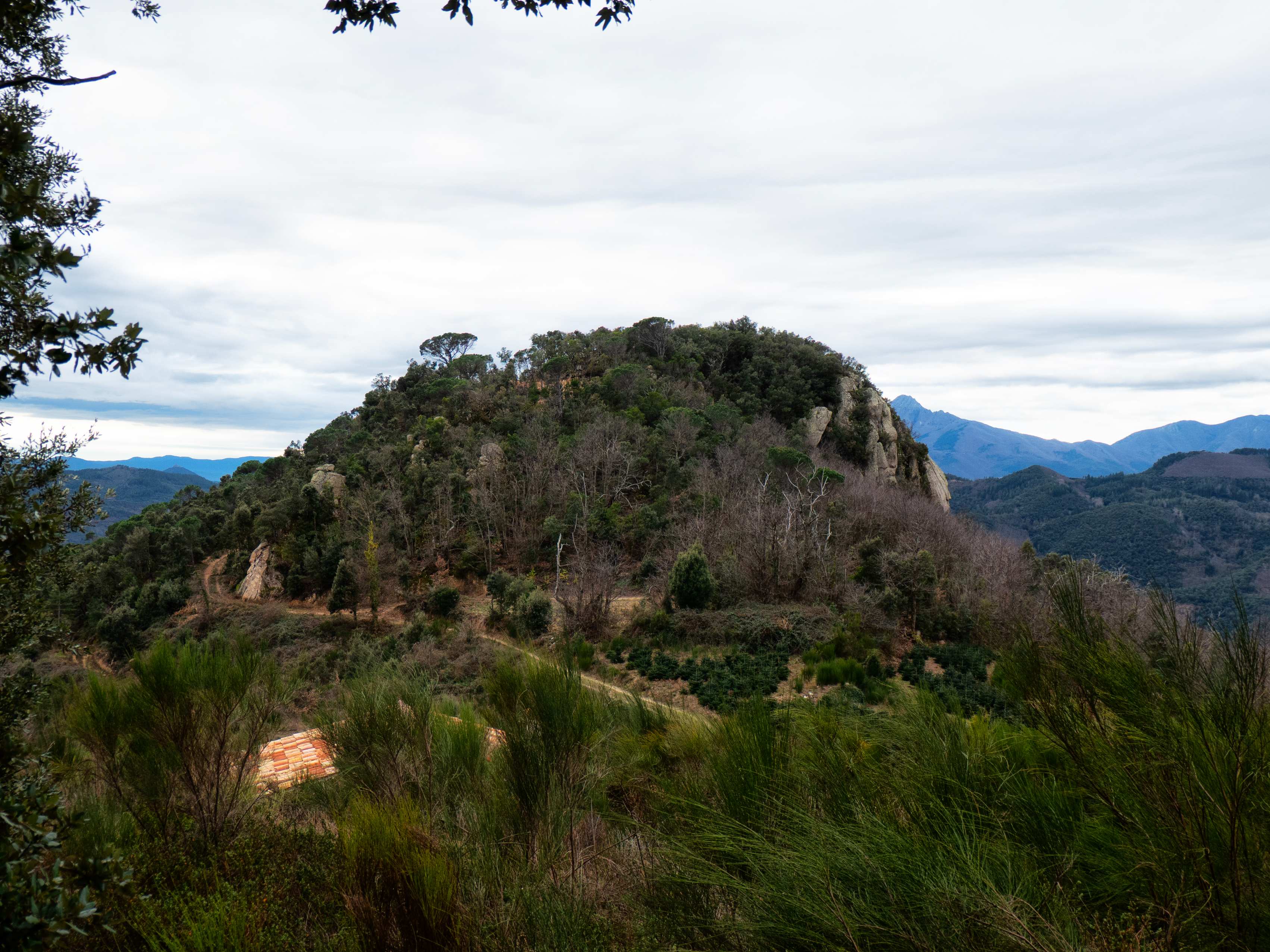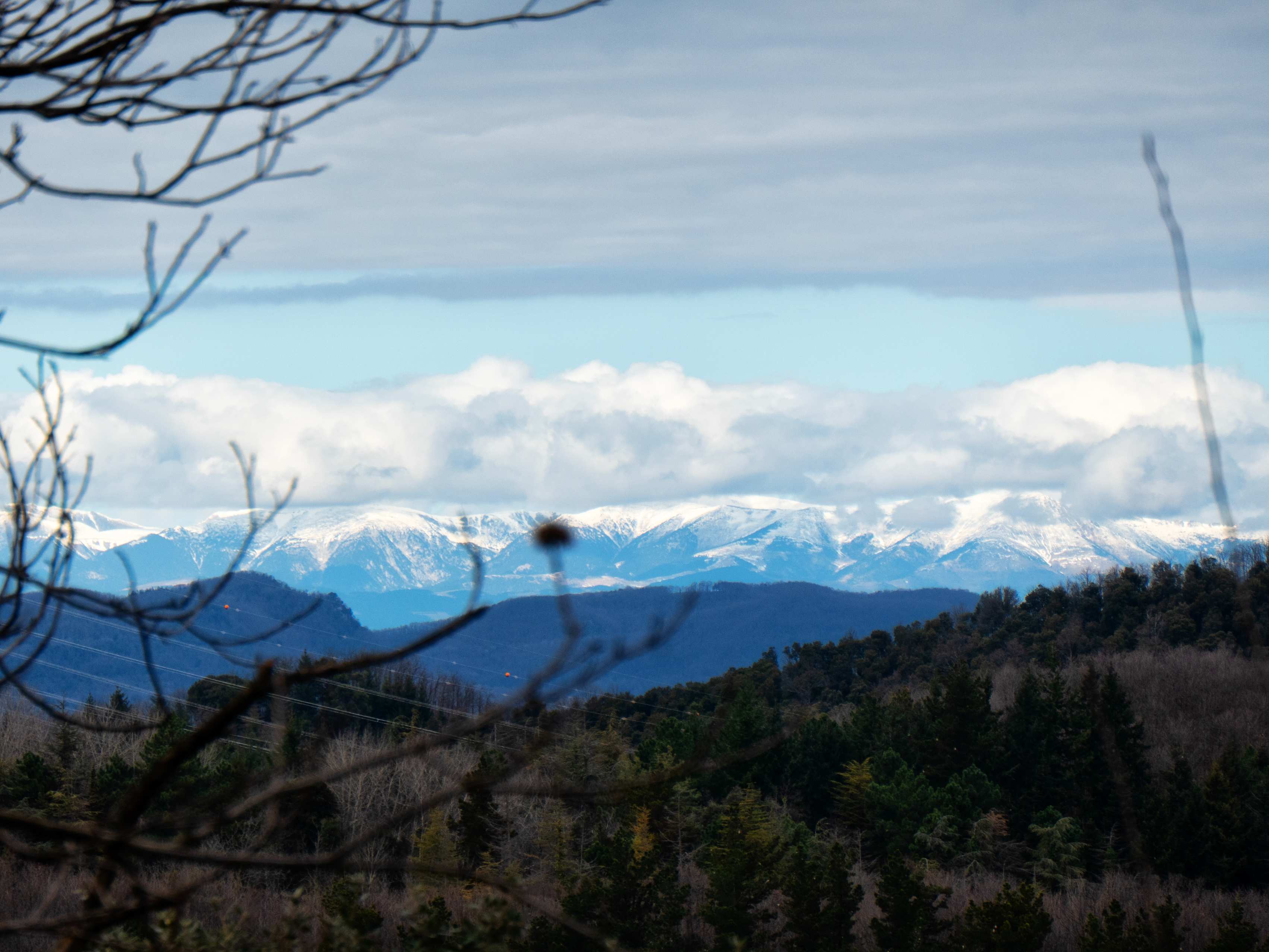 Lo único que alcanzamos a vislumbrar, entre los claros del follaje, es la parte inferior del Canigó, que luce bastante manto nival. Algo es algo.