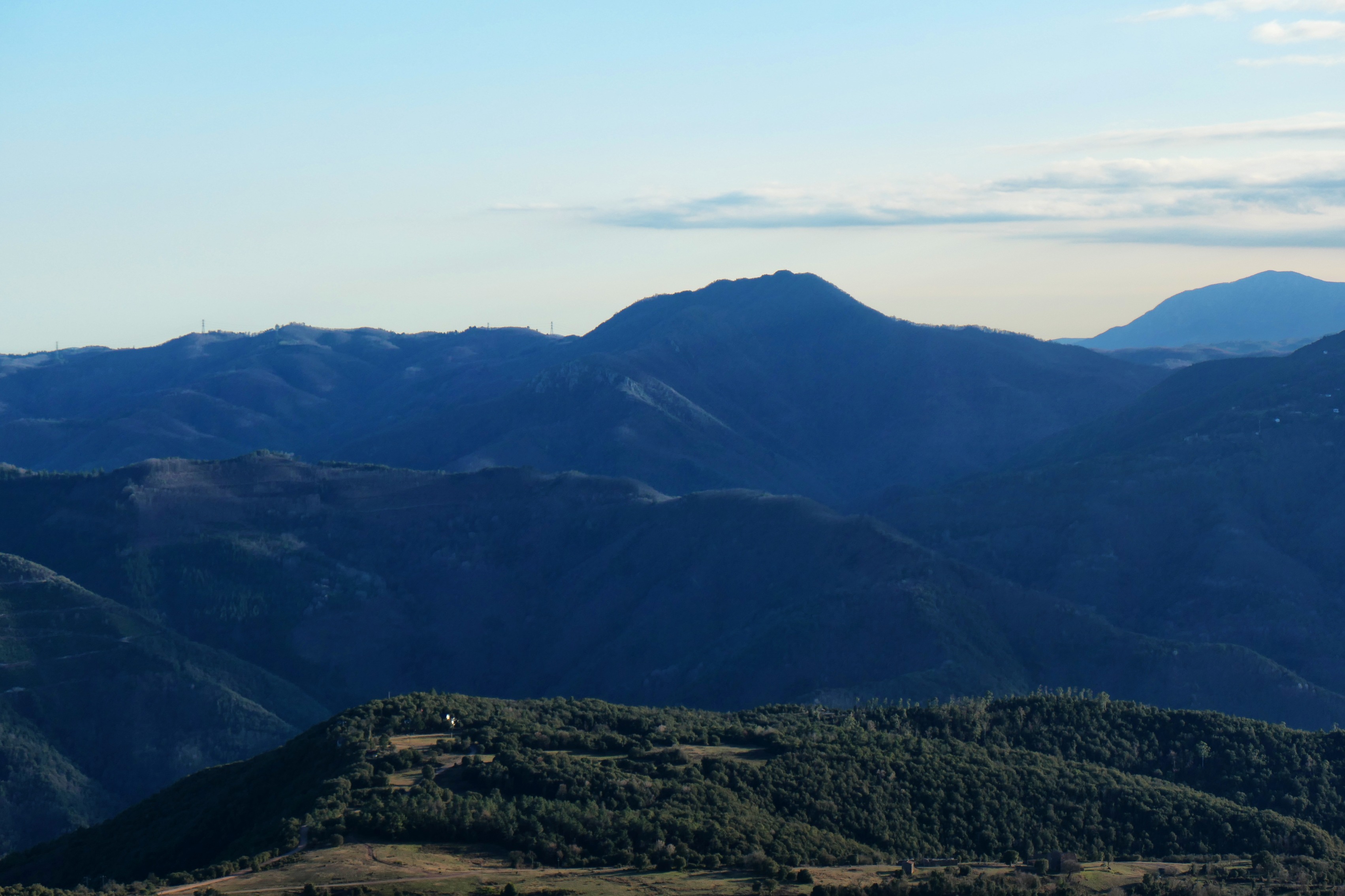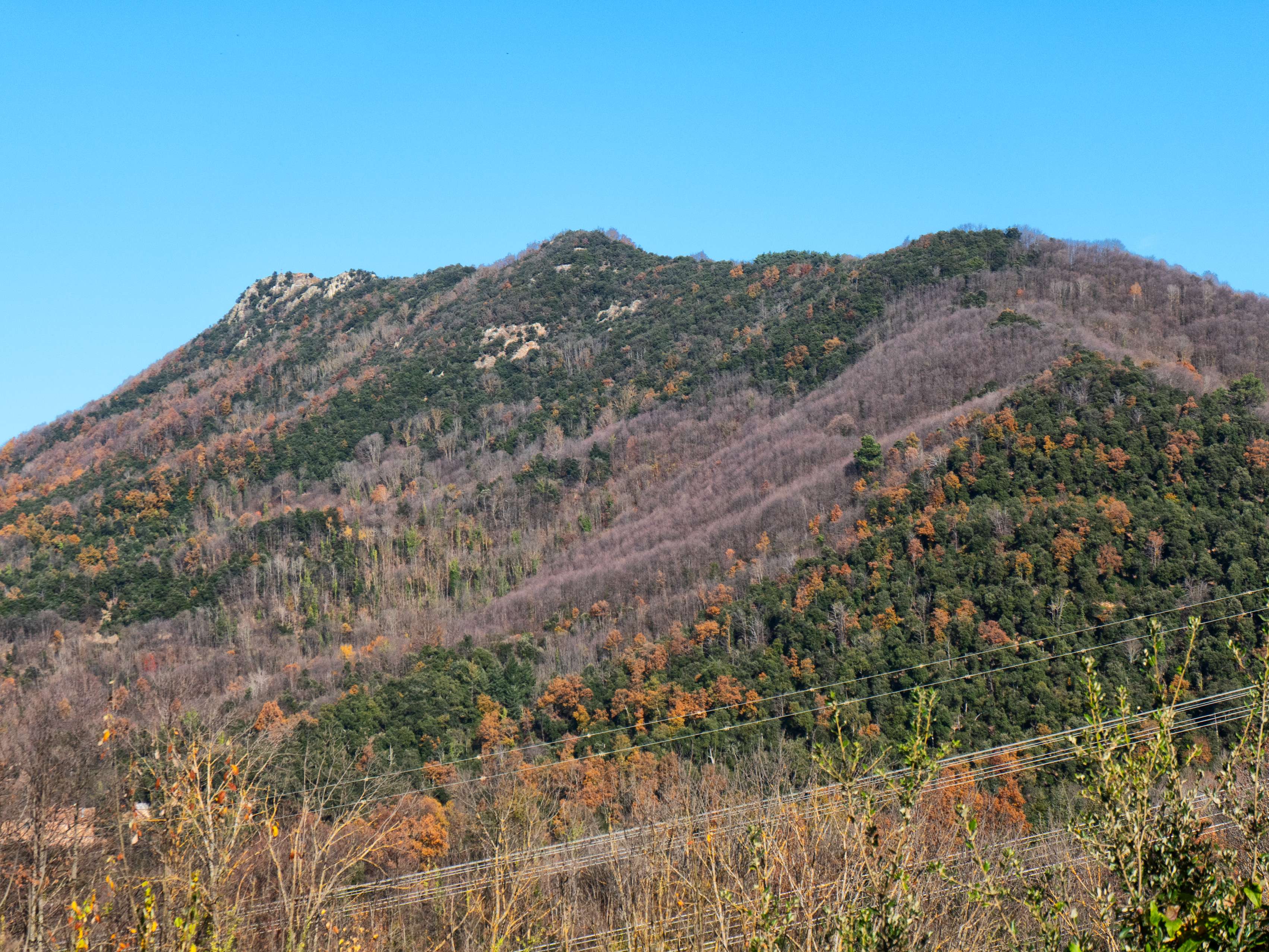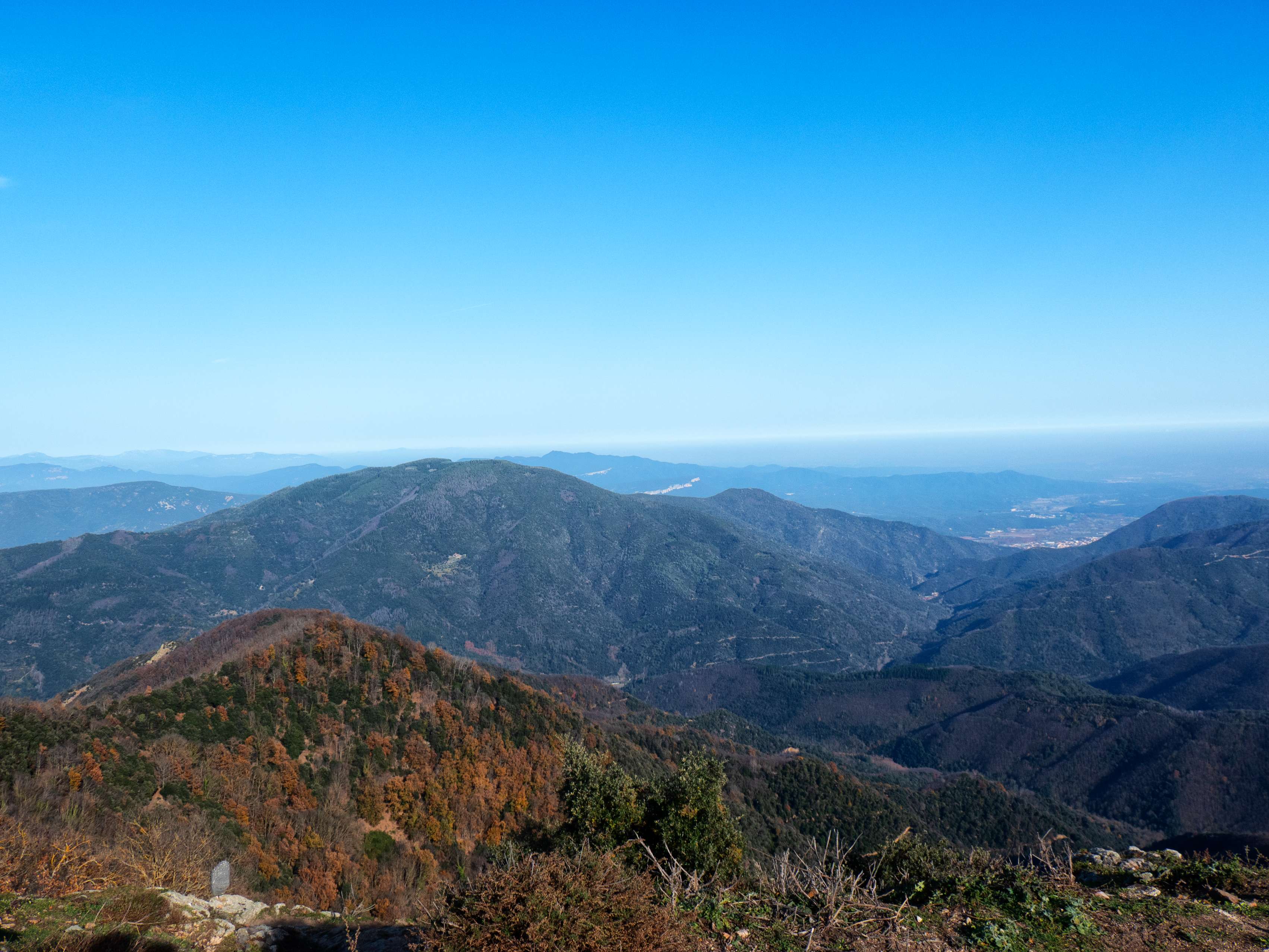 Por último, hacia el este, tras el gran domo de Sant Gregori, la montaña cede paso a las llanuras gerundenses, con el mar, que tendríamos que ver bastante cercano, cubierto por la bruma calimosa.