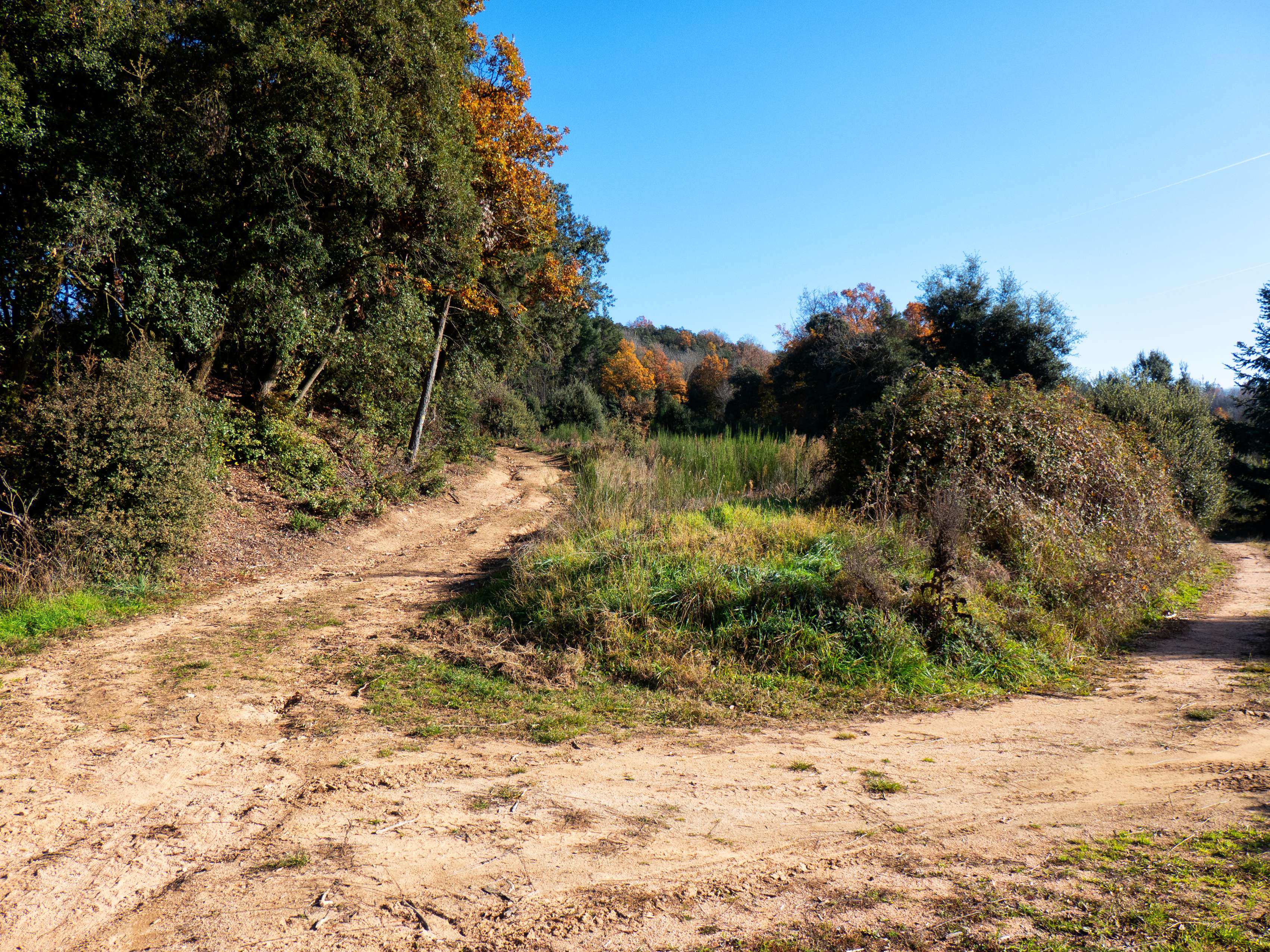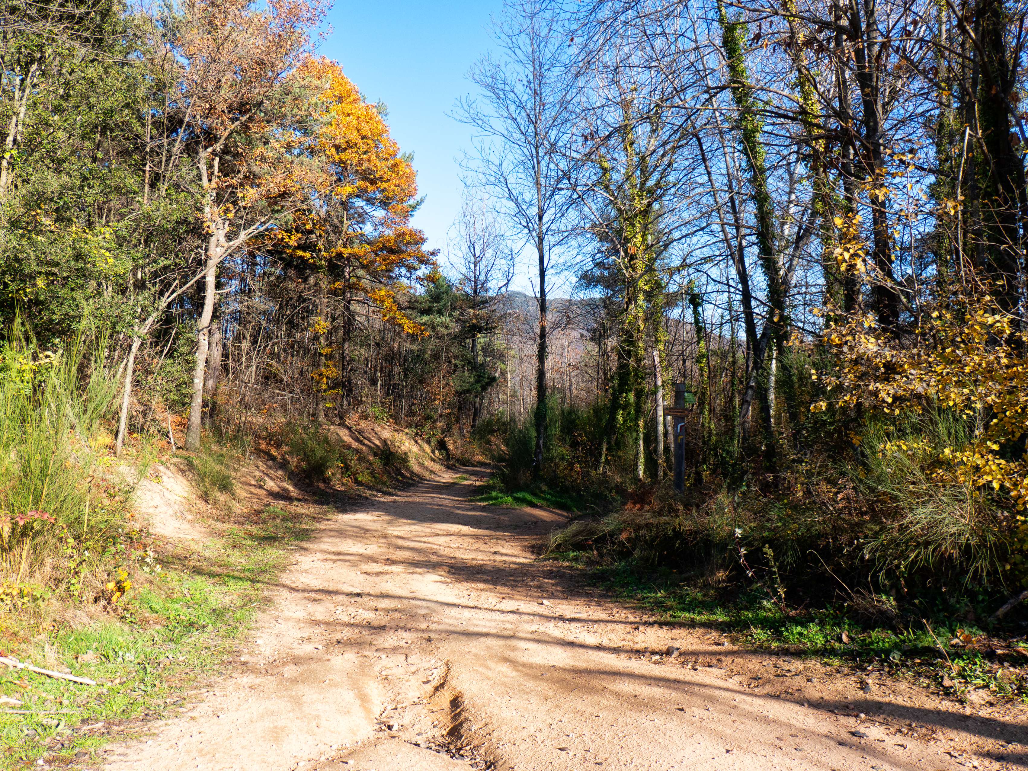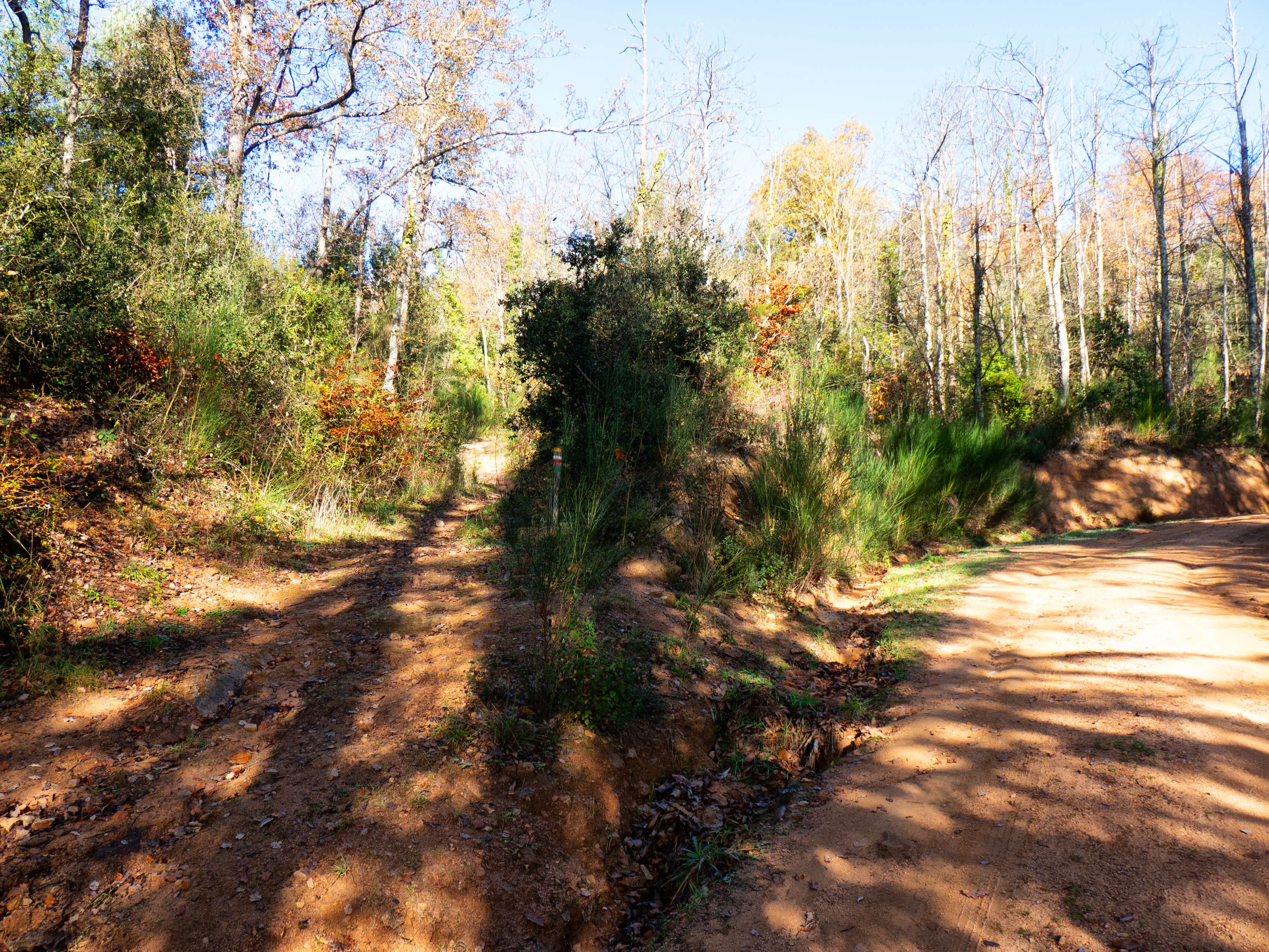 Empezamos una nueva ruta, esta vez desde el aparcamiento de Can Calabrès, tomando una pista de tierra que rápidamente se bifurca en dos. La excursión de hoy tiene numerosos cruces de caminos, pero la gran mayoría están bien señalizados, como es el caso de este primero, con varios carteles y marcas de pintura que nos hacen ir a la derecha.