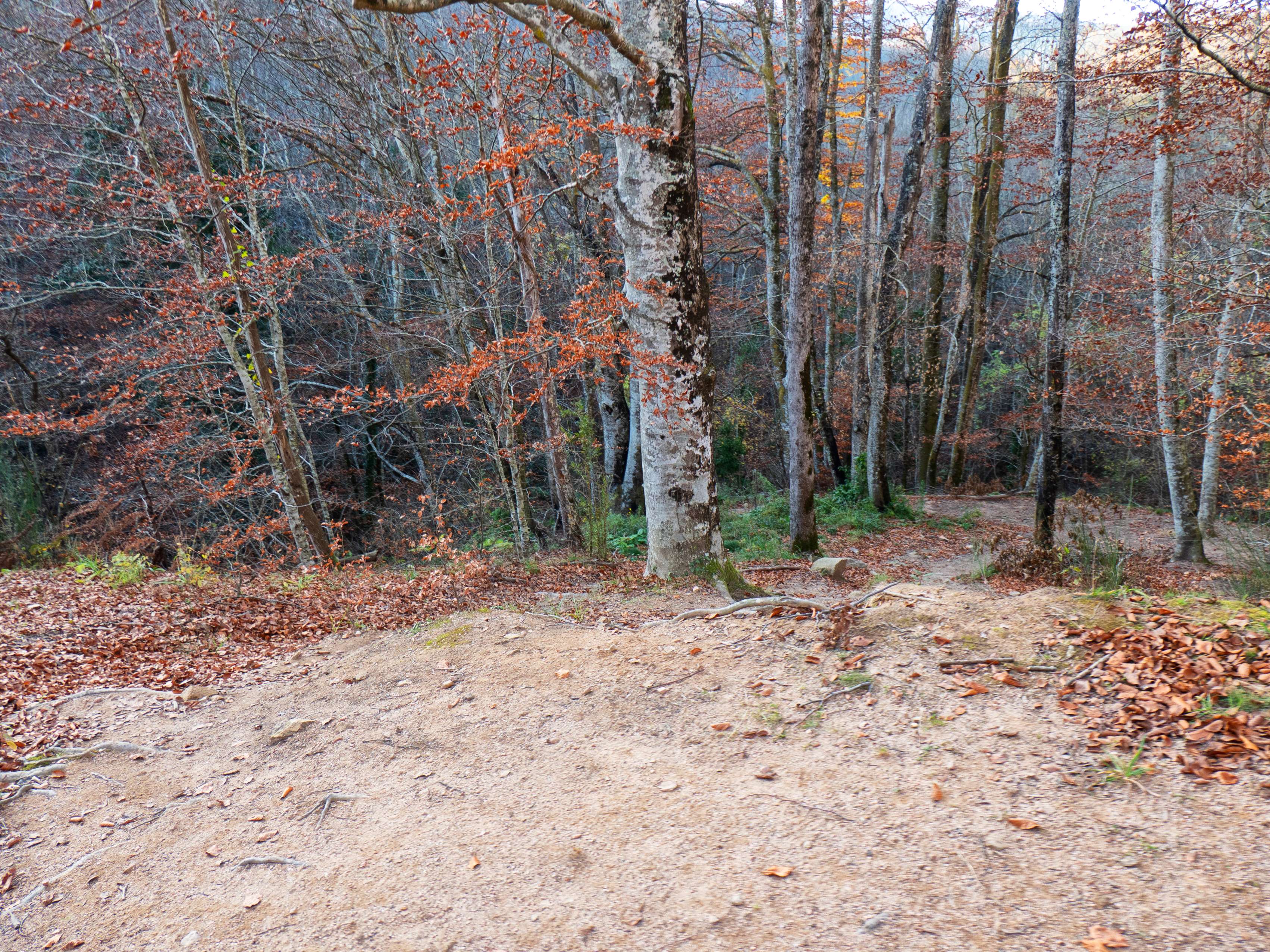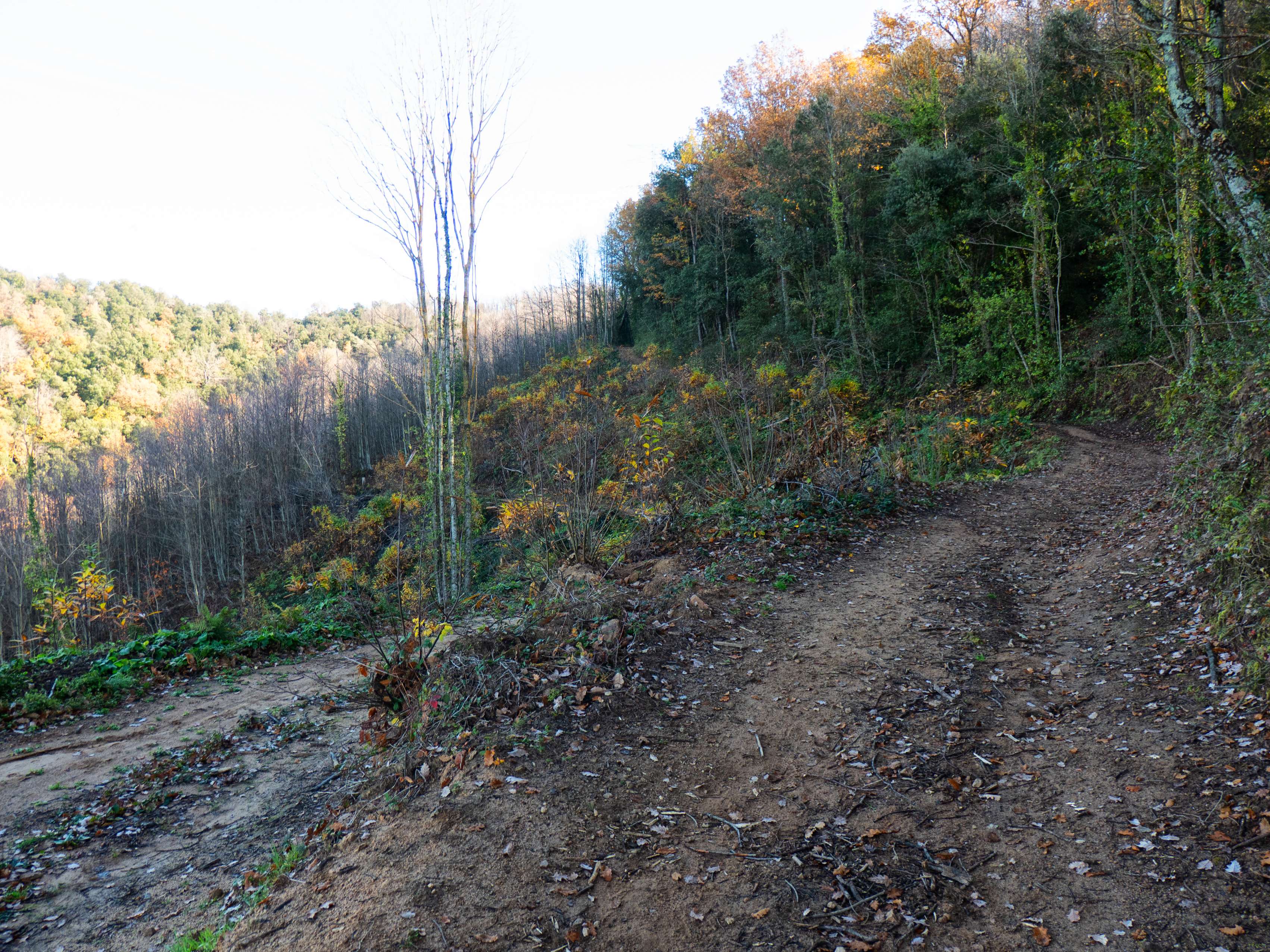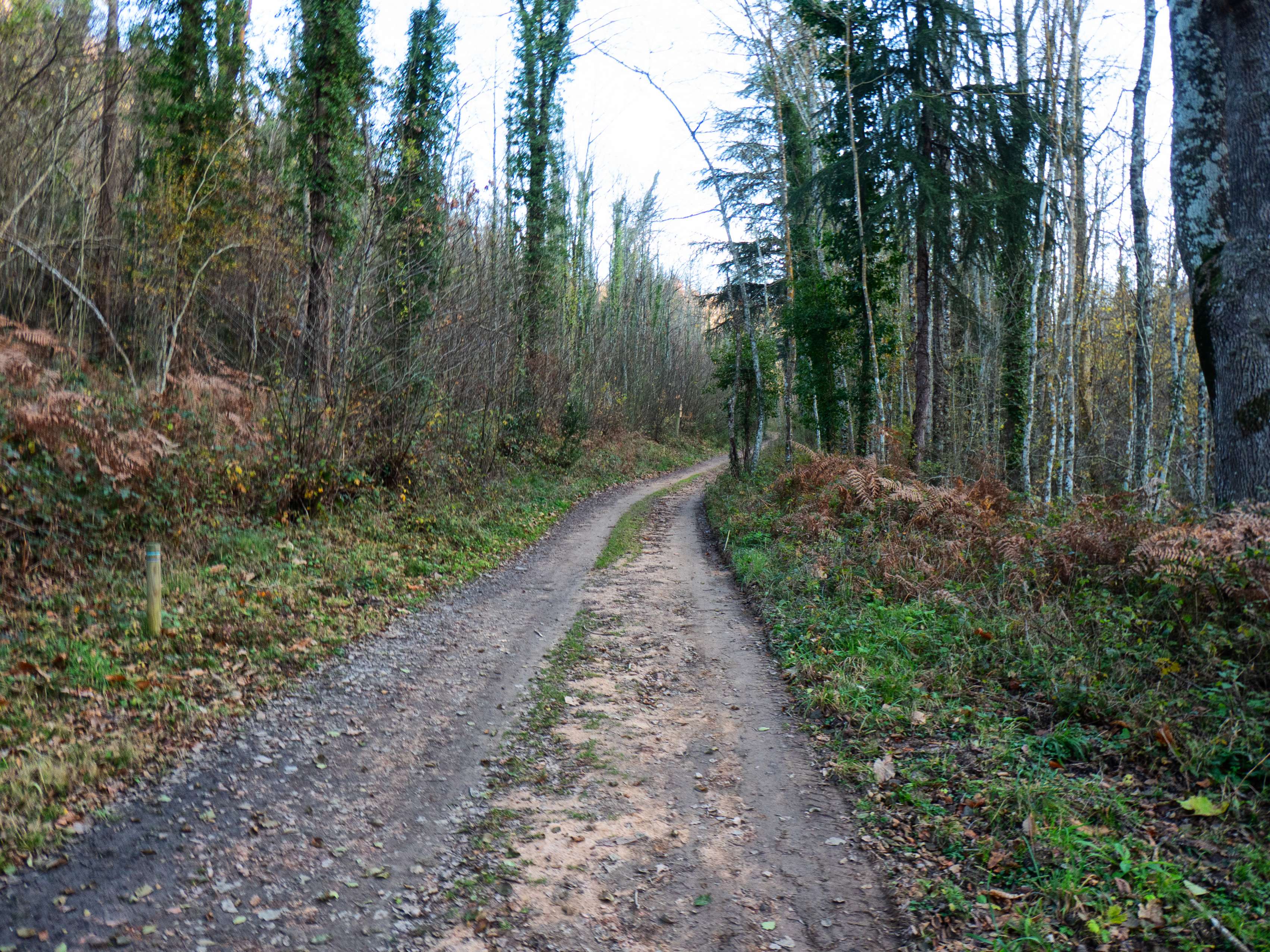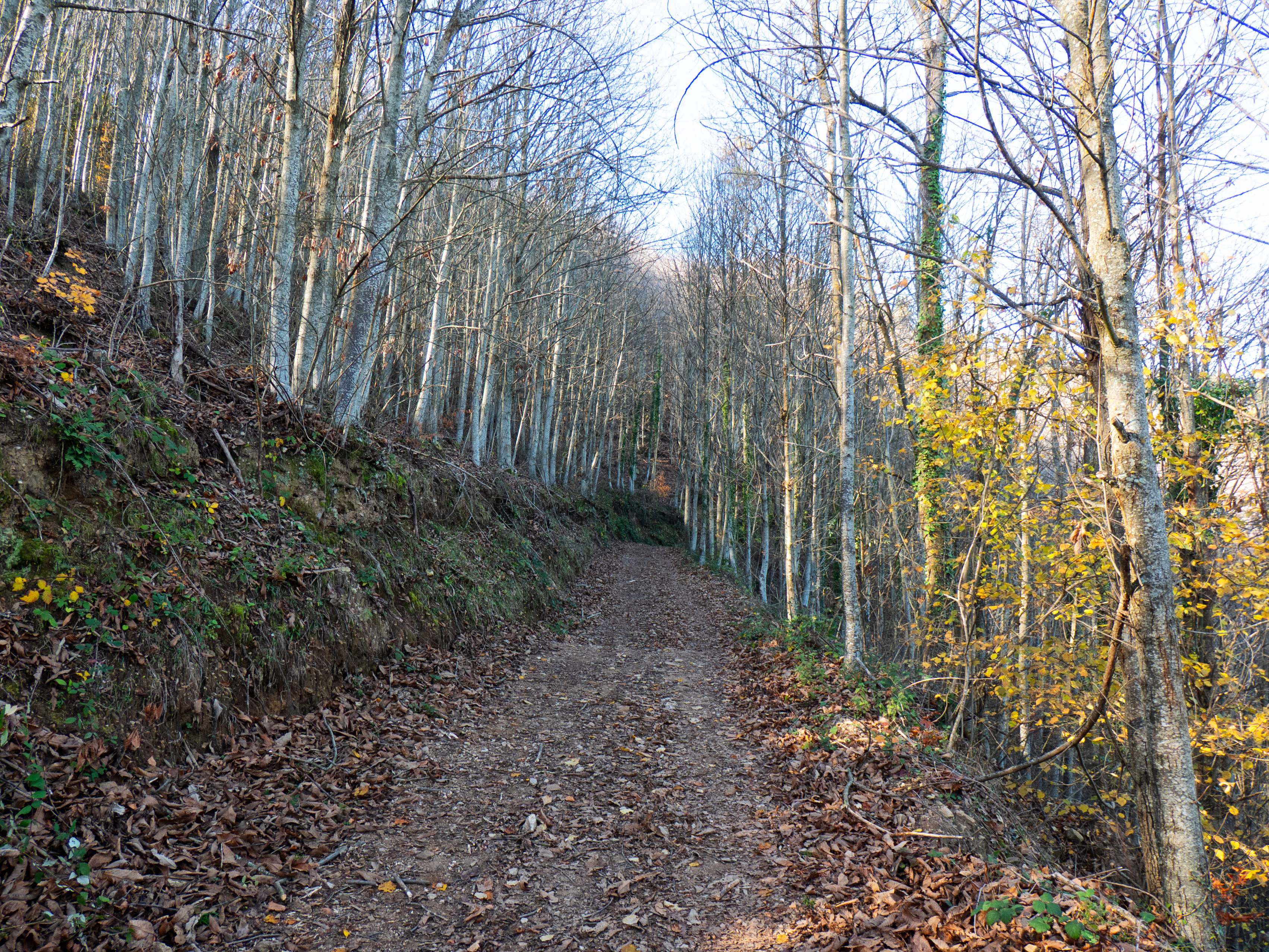 La pista se transforma rápidamente en un sendero que desciende con fuerza por el pelado bosque invernal. Esta zona, en pleno otoño, tiene que ser un espectáculo de colores.