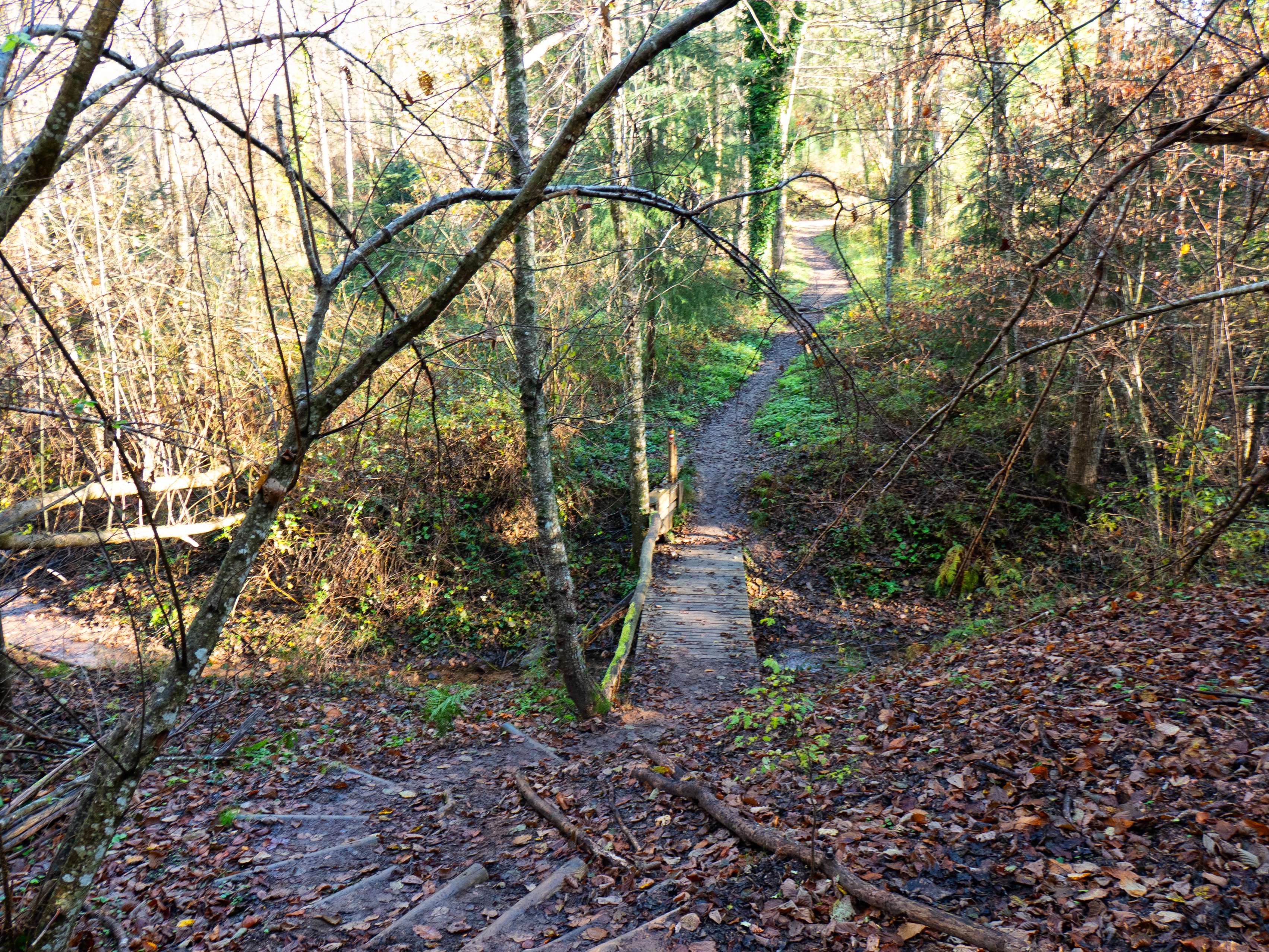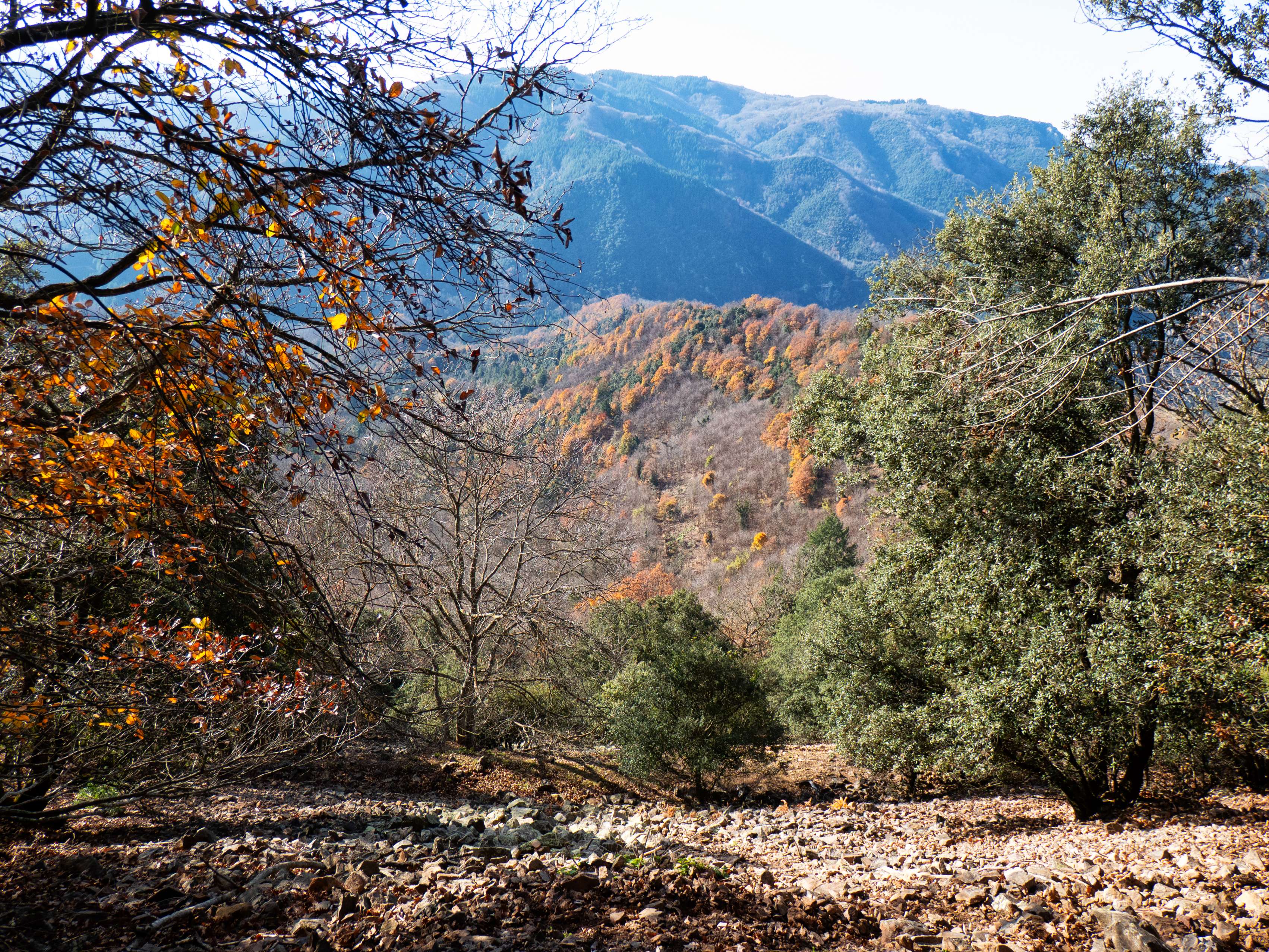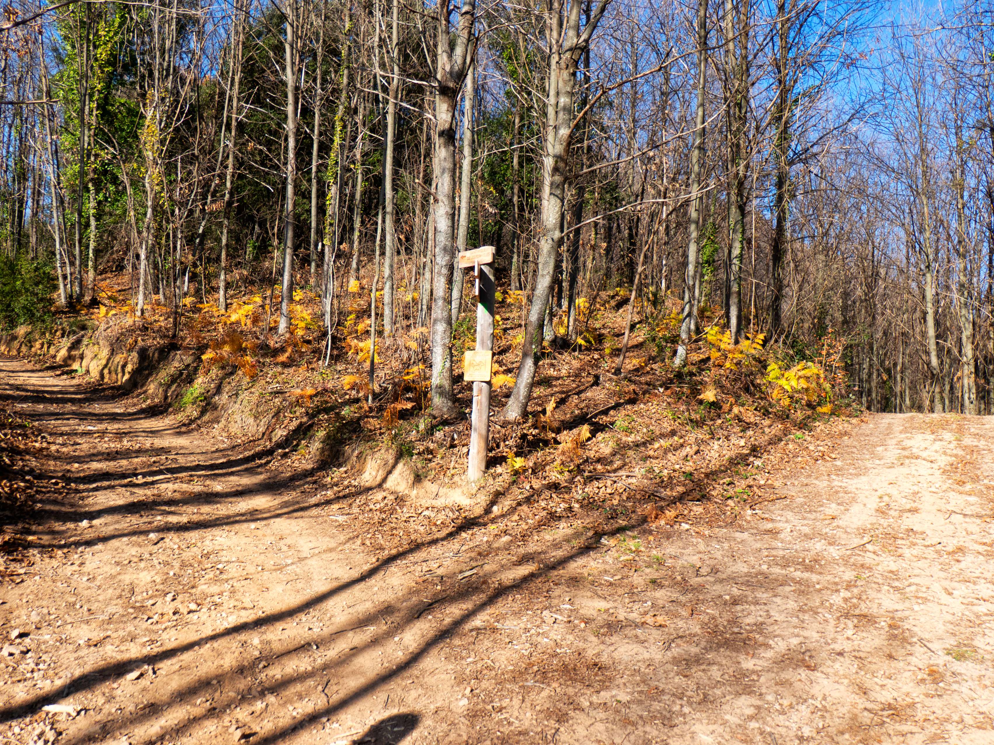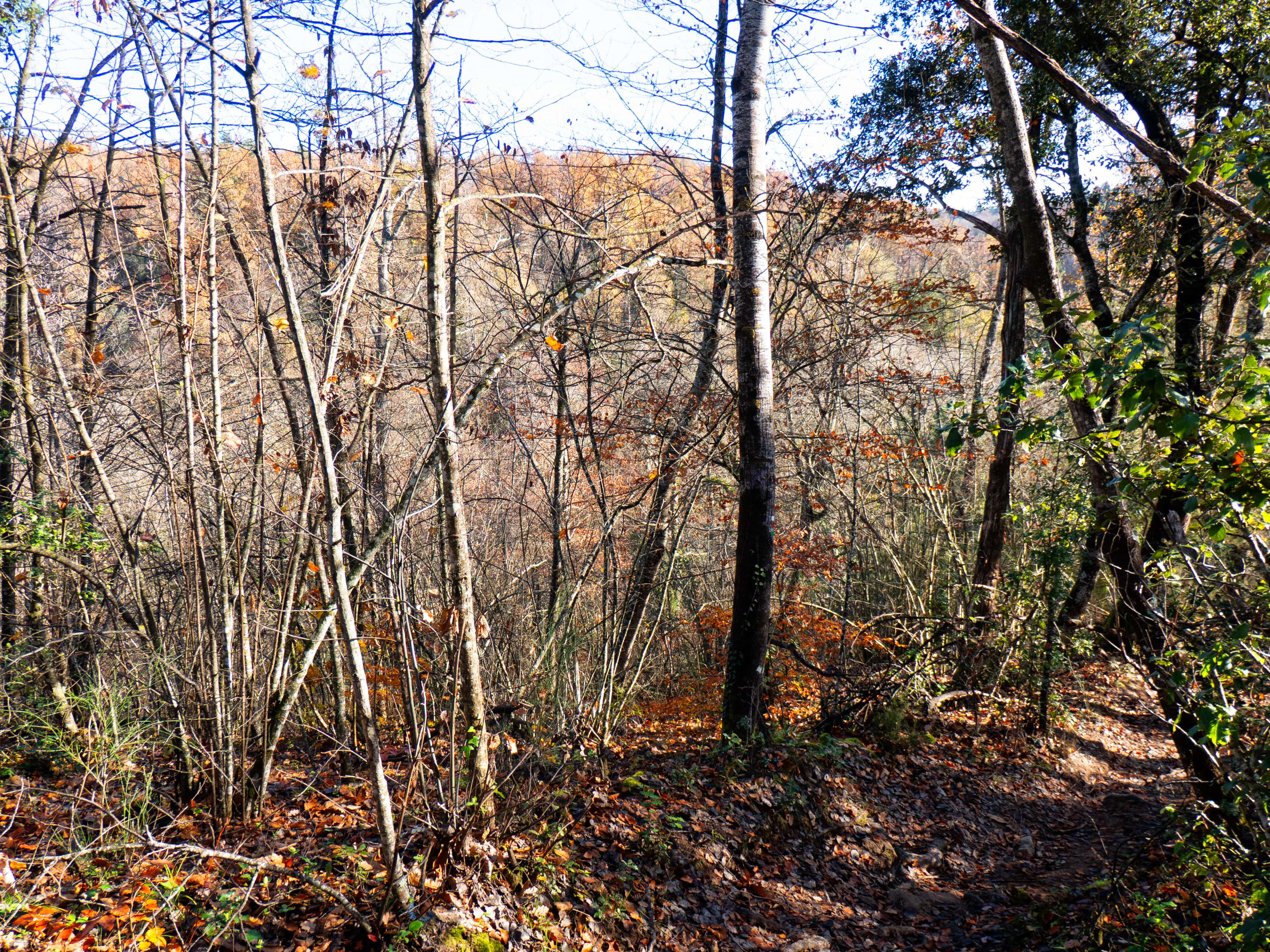 La pista se transforma rápidamente en un sendero que desciende con fuerza por el pelado bosque invernal. Esta zona, en pleno otoño, tiene que ser un espectáculo de colores.