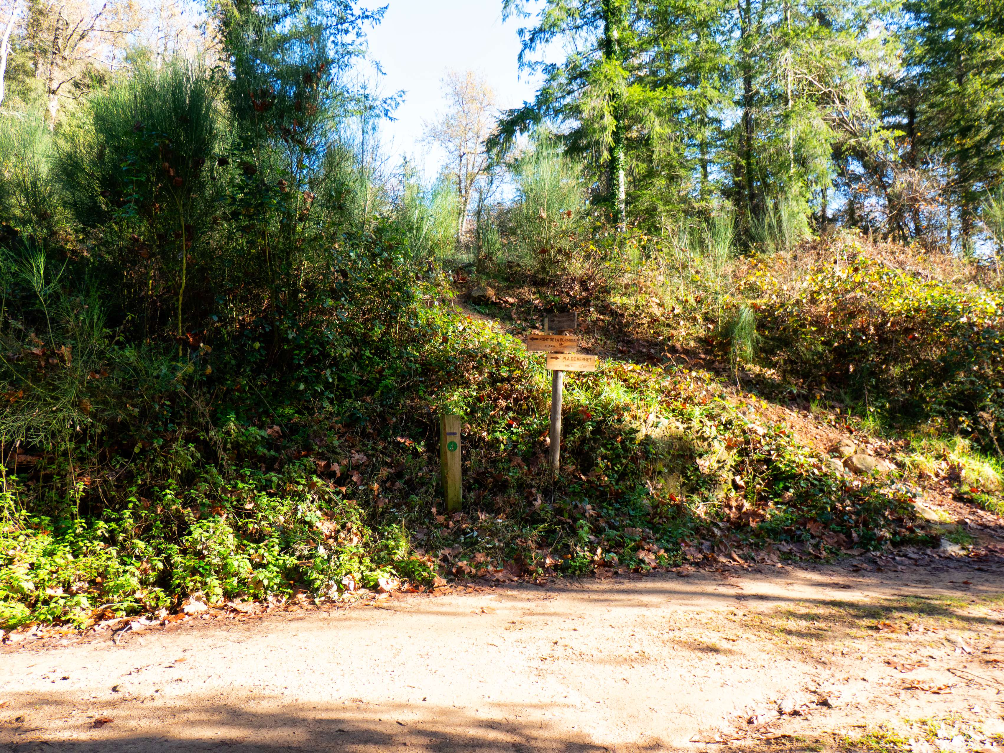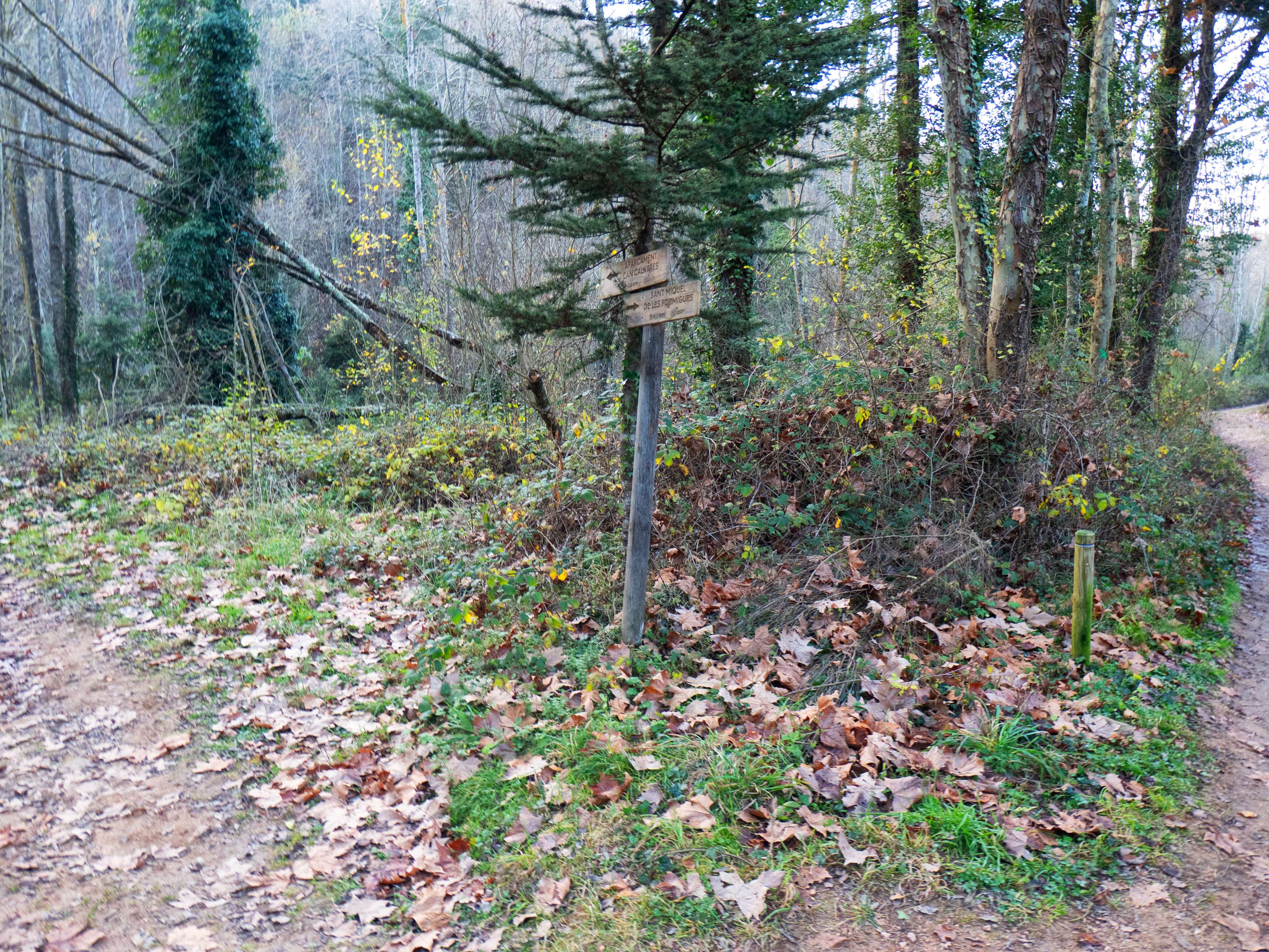 En este cruce cerraremos la circular unas horas más tarde, pues volveremos por la pista que va a la Font de la Formiga. Por ahora seguiremos recto, tomando el camino con indicaciones a Sant Miquel de les Formigues, señalizado a su vez con marcas verdes que aparecen con frecuencia.