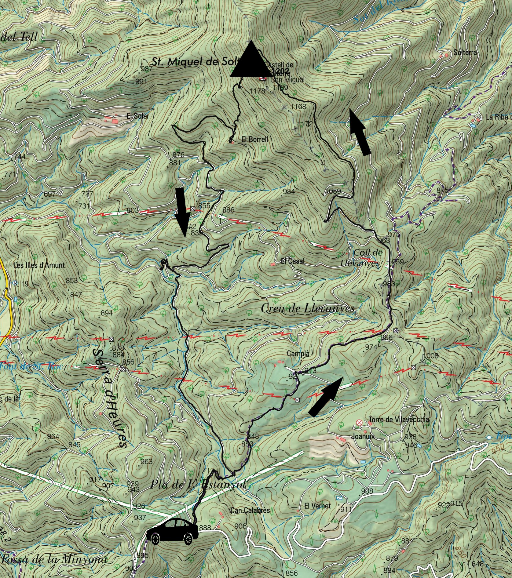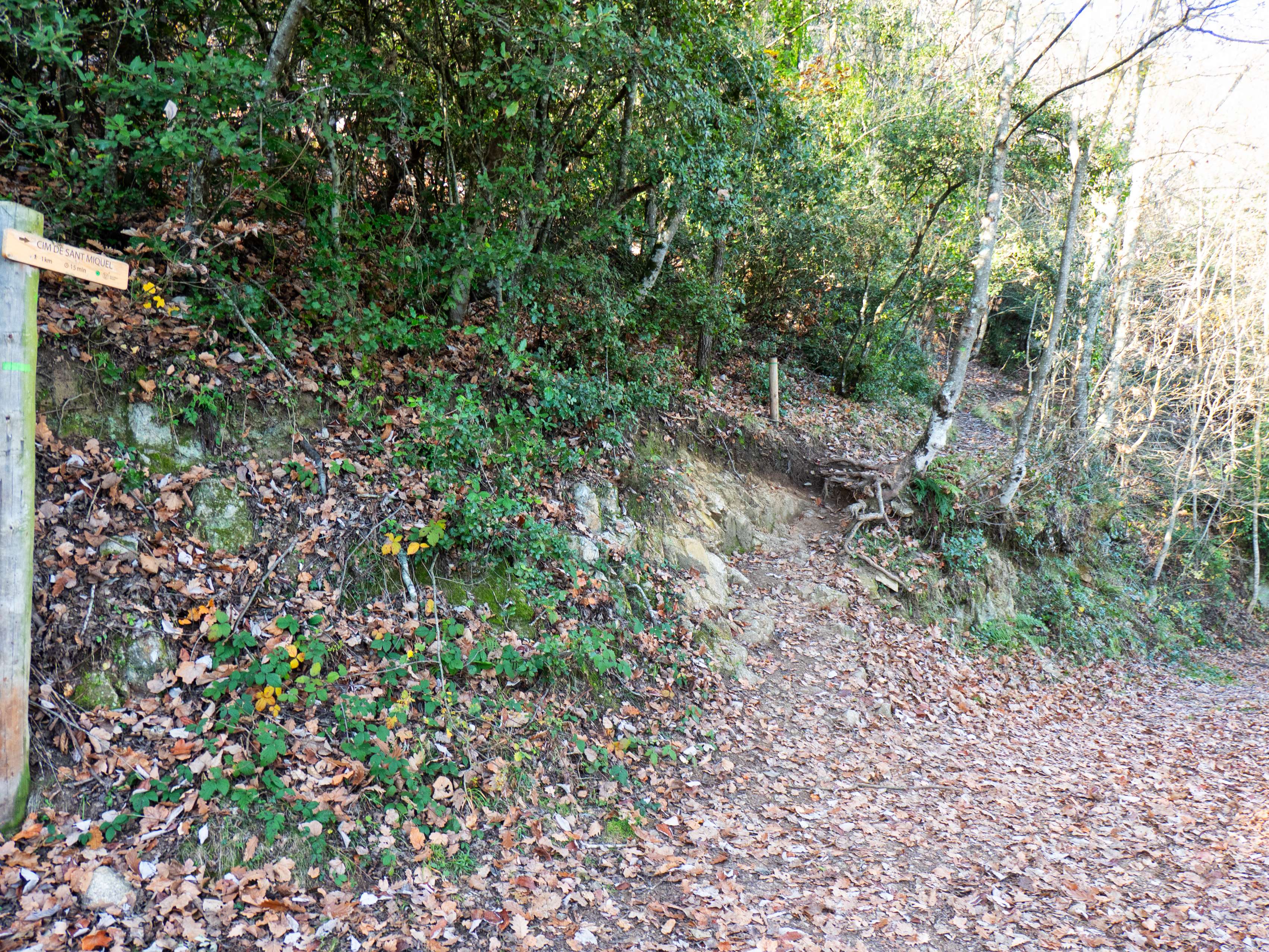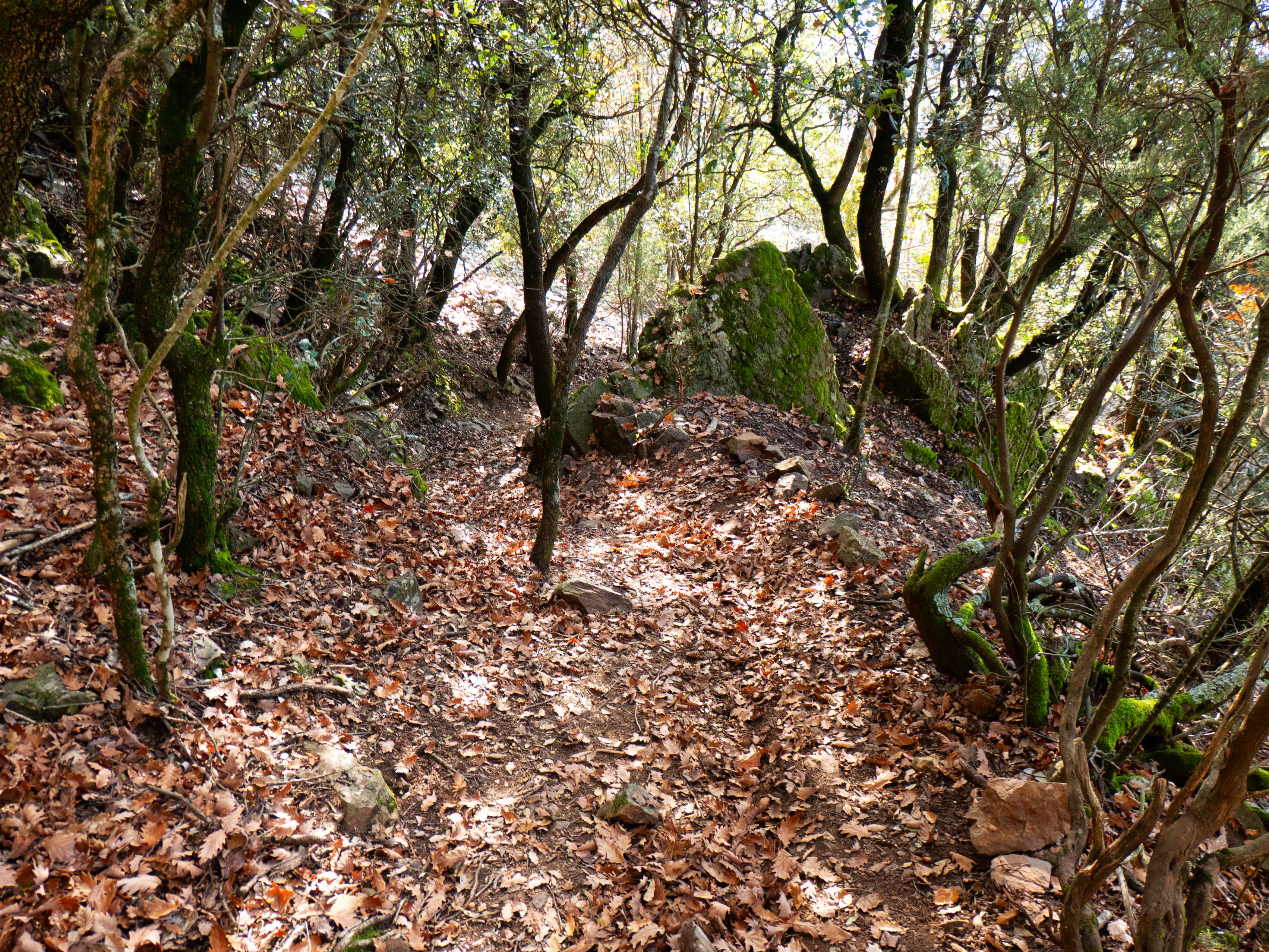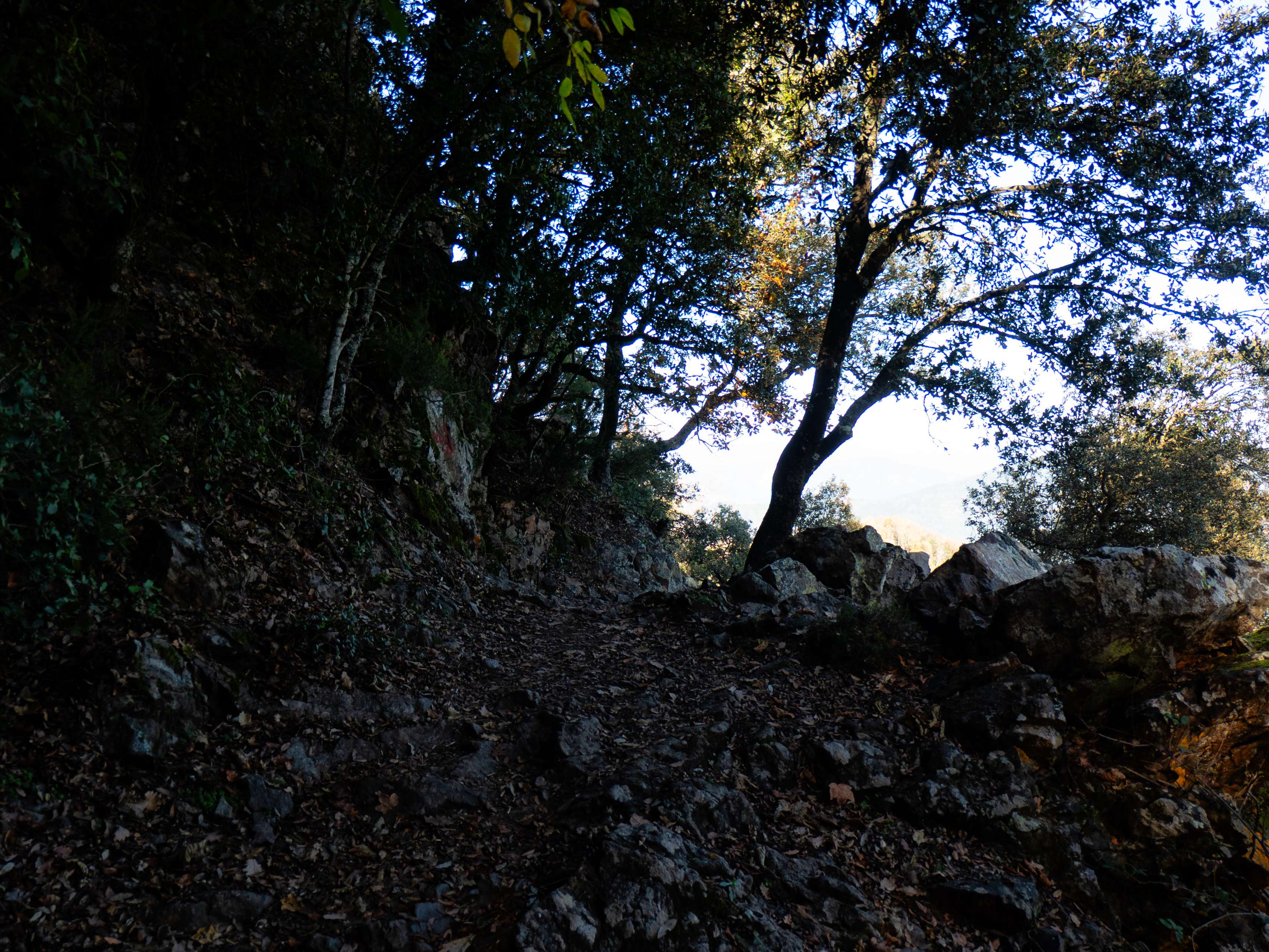 El camino, que atraviesa la oscura cara este del Sant Miquel de Solterra, va tornándose cada vez más rocoso a medida que nos acercamos a la cumbre.