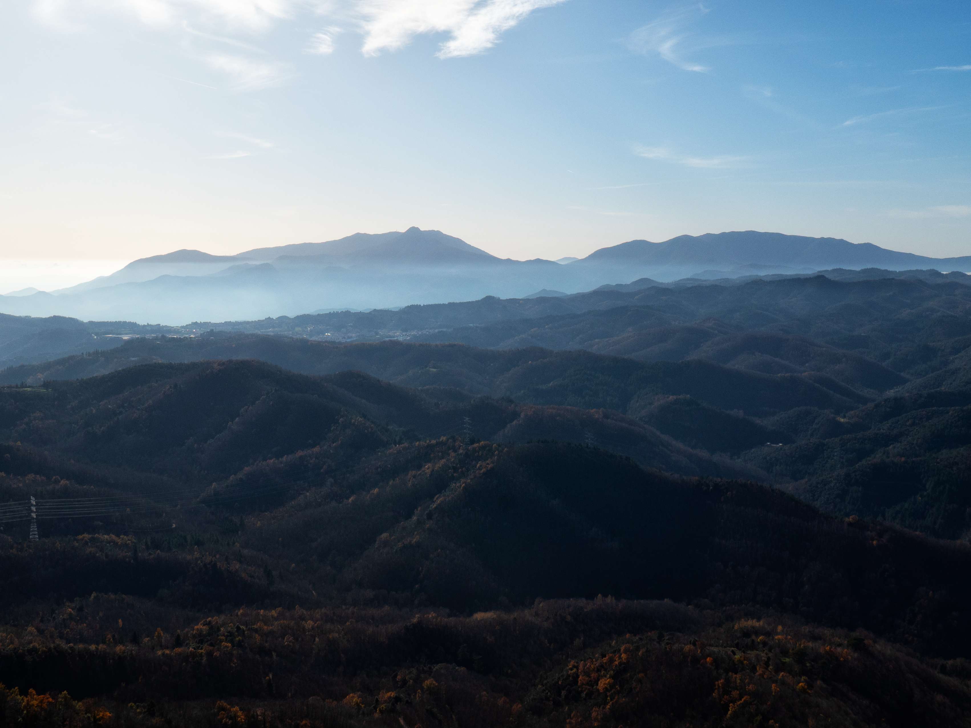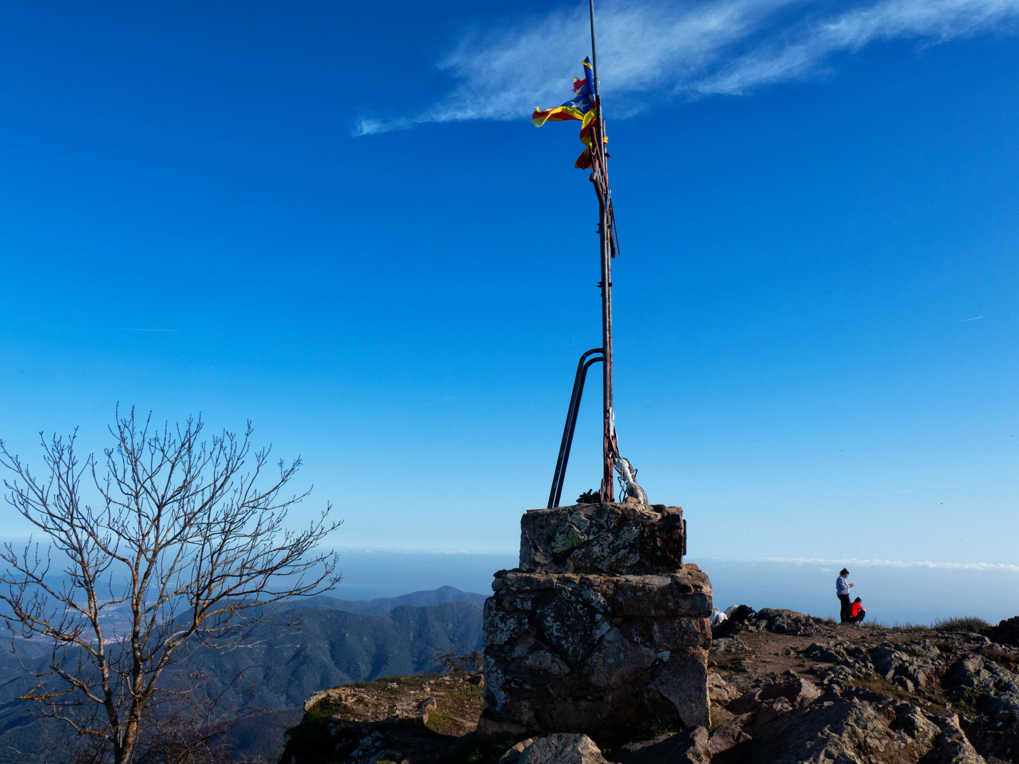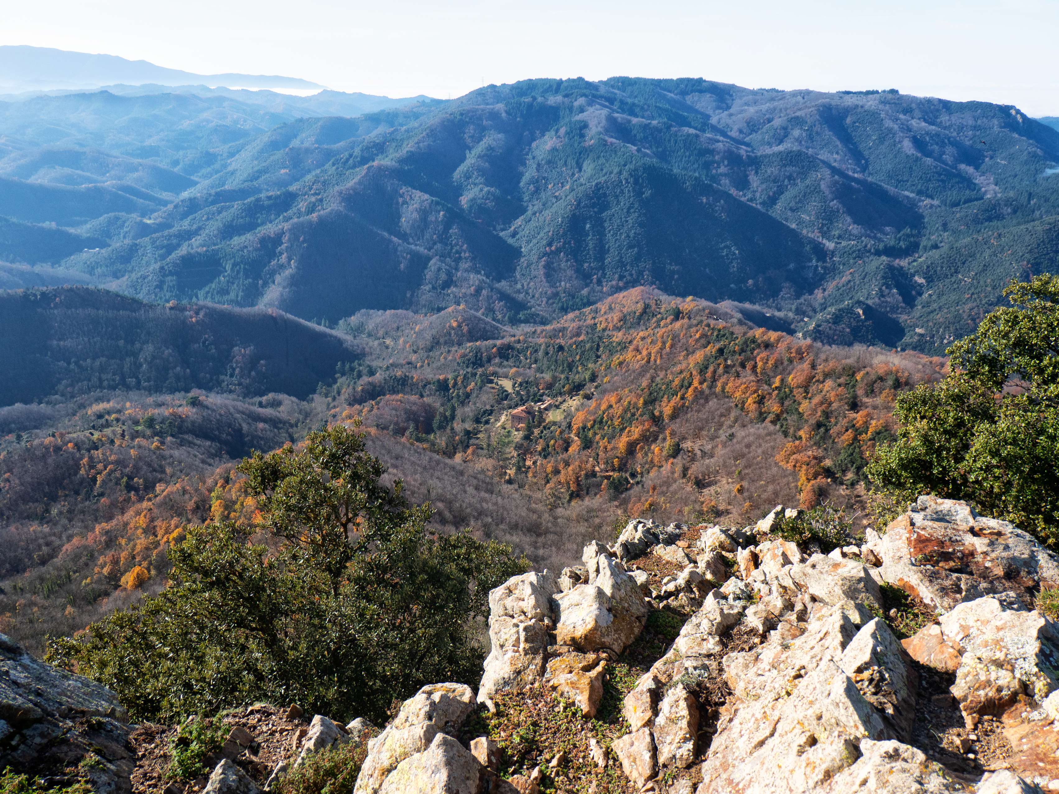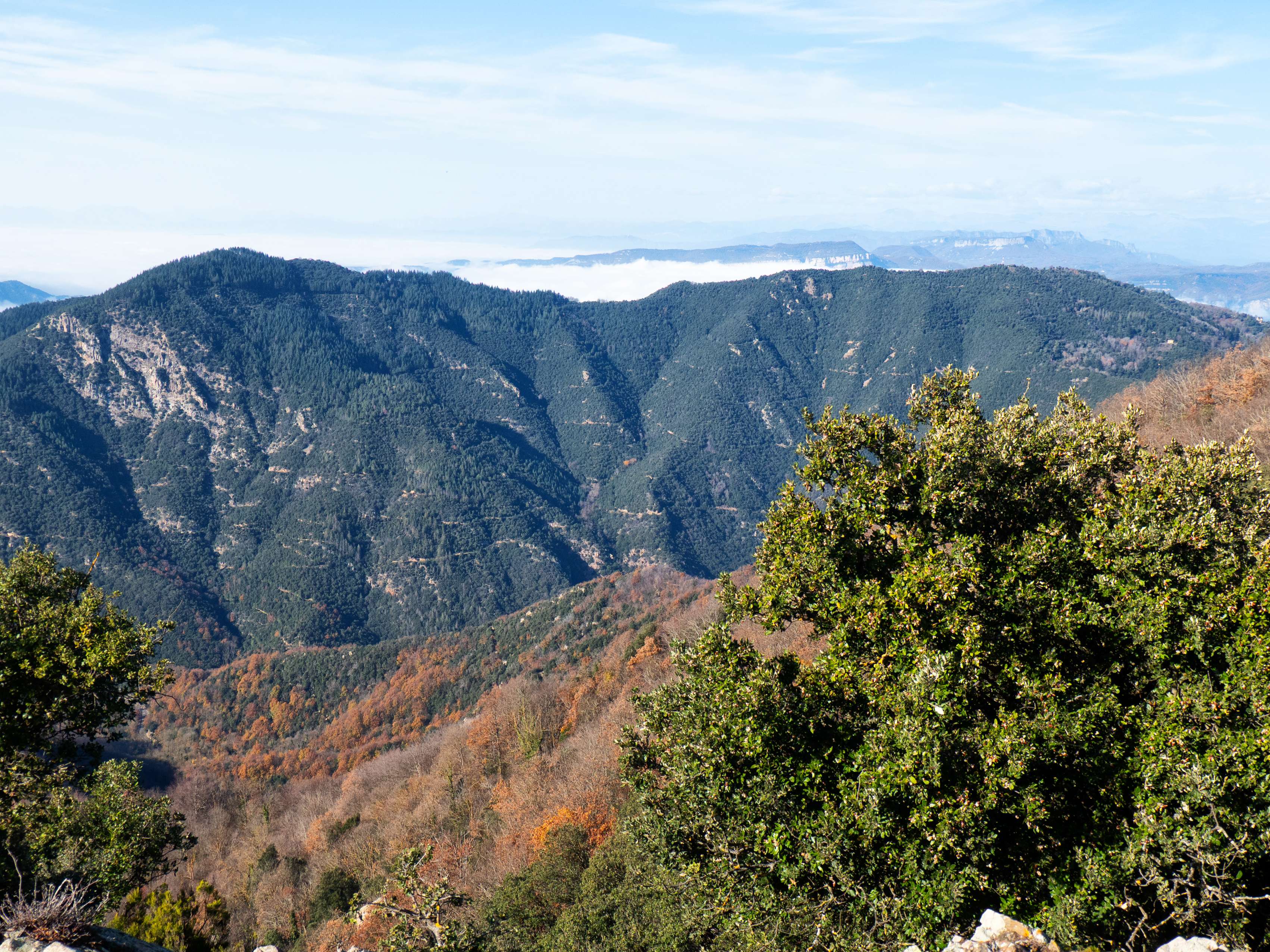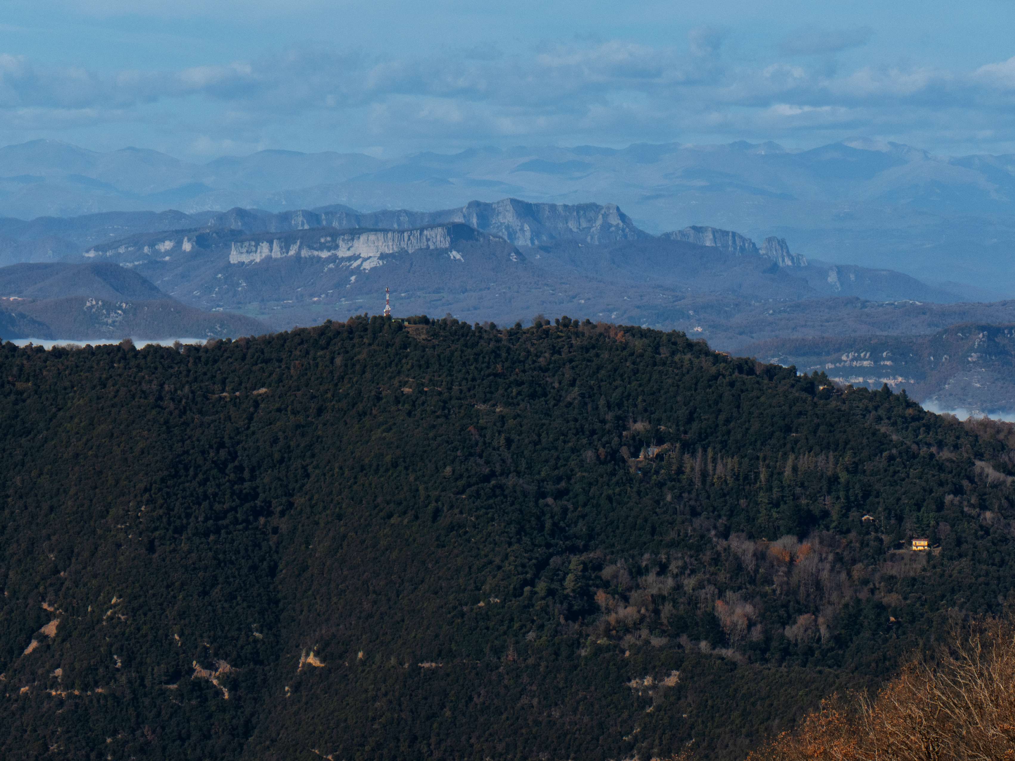 A pesar de ser diciembre, una ligera calima en el horizonte limita en parte las vistas. Hacia el sur, vemos la frondosidad de les Guilleries, con sus mil colinas boscosas. Este paraje se interrumpe bruscamente ante la aparición de los dos monstruos del Montseny: el binomio Turó de l'Home-Agudes y el amplísimo Matagalls.