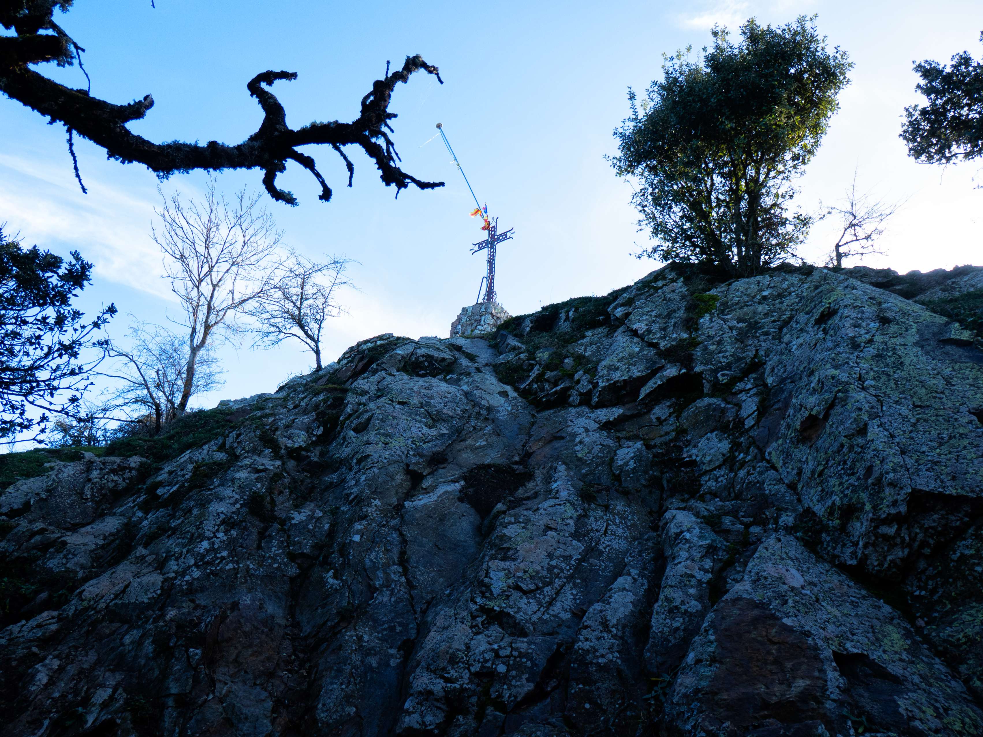 La cumbre de Sant Miquel de Solterra consta de varios promontorios rocosos que emergen varios metros por encima del bosque. Podemos ascender al punto más alto trepando por este fácil muro o bien seguir el camino que, sin apenas poner las manos en el suelo, nos lleva a la cruz de su cima.