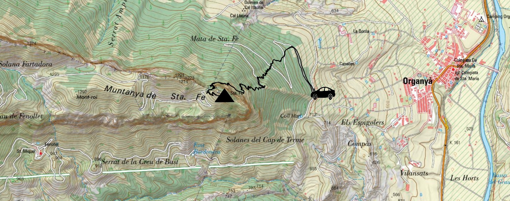 Organyà, conocido por ser el lugar donde se descubrió uno de los textos más antiguos escritos en lengua catalana, las famosas Homilies d’Organyà, está protegido por el Segre de un lado, río que recorre el breve rellano donde se asienta el pueblo, mientras que por el otro está guardado por las escarpadas montañas que rodean todo el entorno de la población y que conforman uno de los paisajes más agrestes y salvajes de Catalunya. Sin embargo, existe una cumbre que destaca de entre todas las demás, al mostrarse desde el pueblo como una soberbia proa rocosa. Esta fortaleza, en apariencia inexpugnable, recibe el nombre de la ermita que ocupa su cima: Santa Fe.