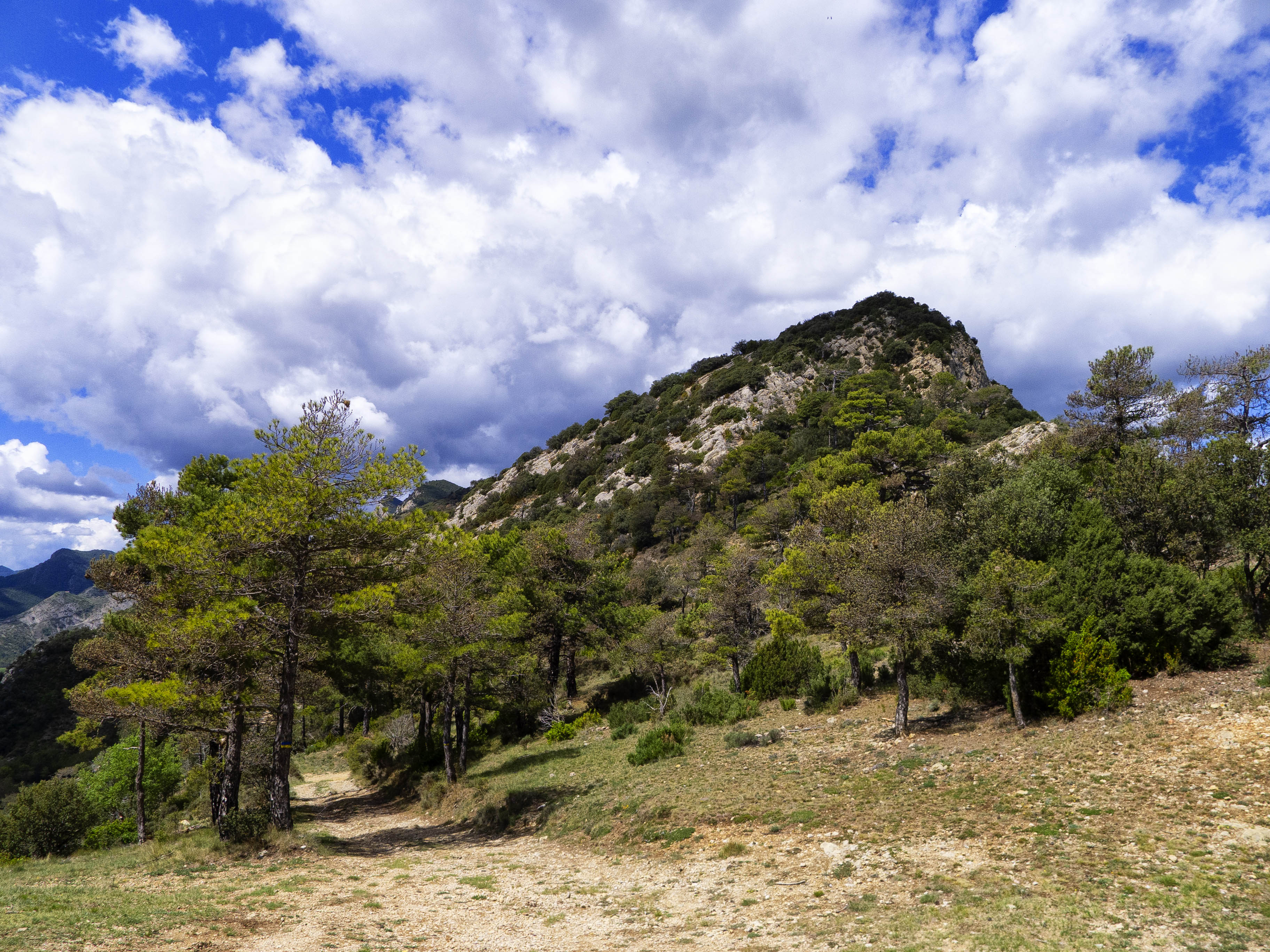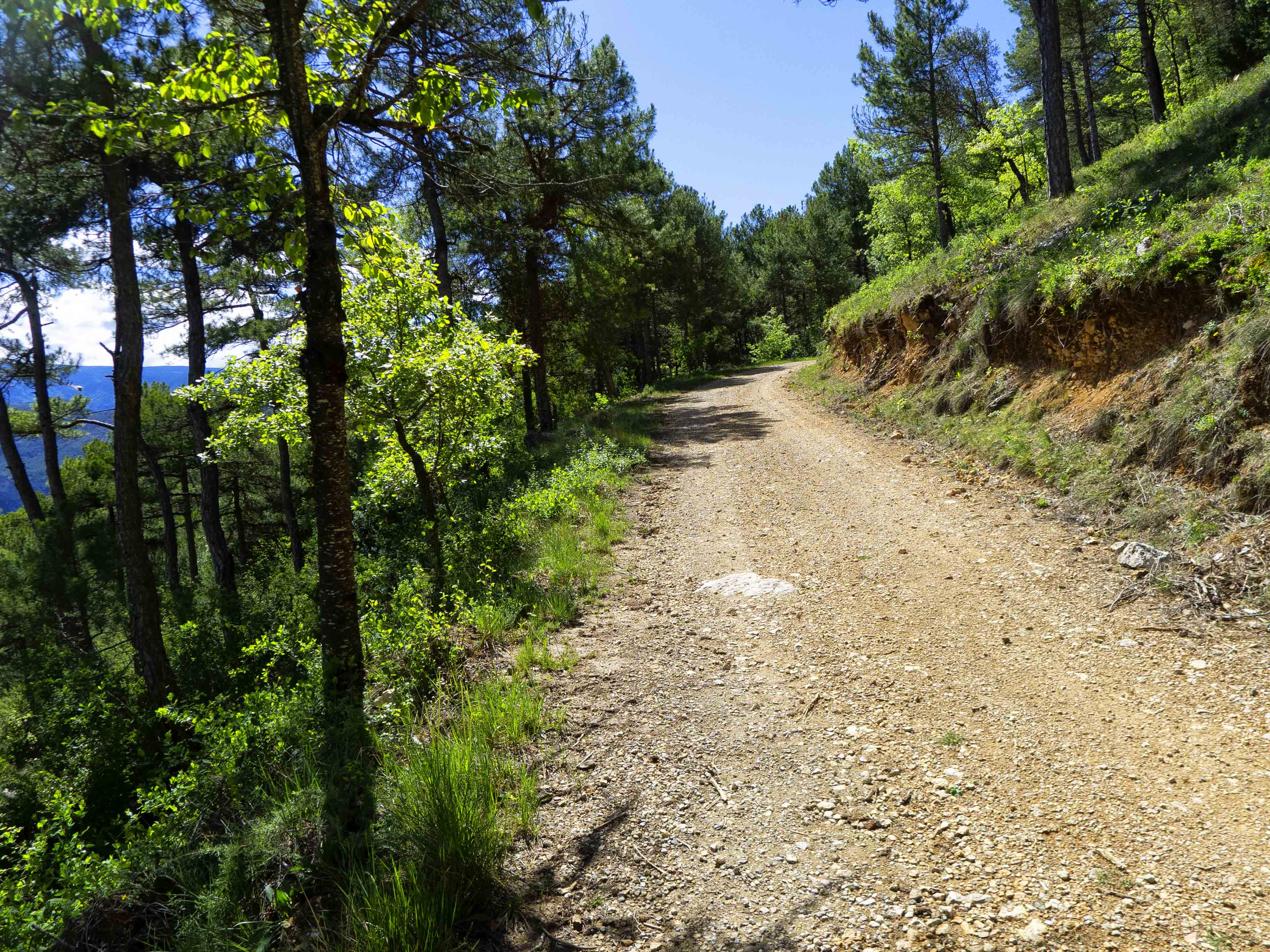 Desde el rellano donde finaliza la pista, sale un sendero que, tras ganar algo más de 50 metros de desnivel primero por un bosque cada vez más despejado...
