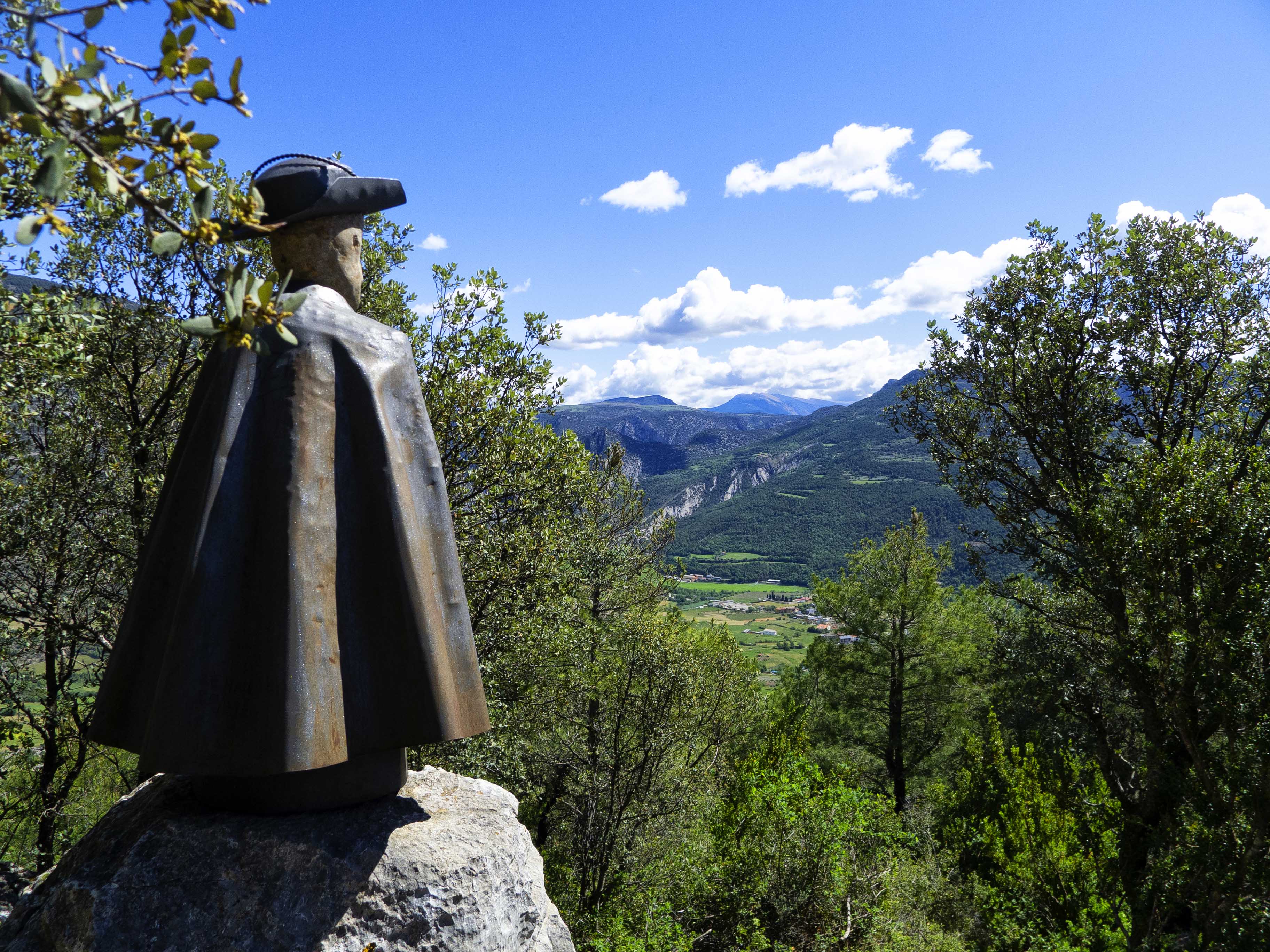 Esta figura, situada en la parte alta de una roca, tiene la vista despejada, seguramente gracias a la ayuda de gente de la zona, que habrán limpiado el arbolado para que Mossèn Cinto pueda ver bien Organyà.