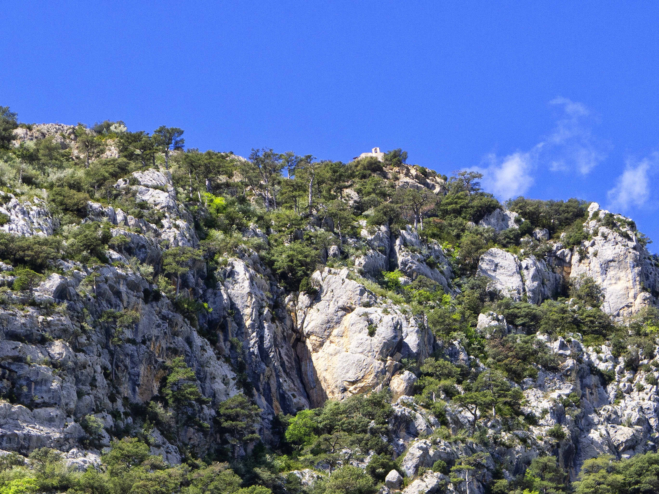 Tras unos primeros zigzags por el bosque, el sendero se arrima a la gran pared de Santa Fe.