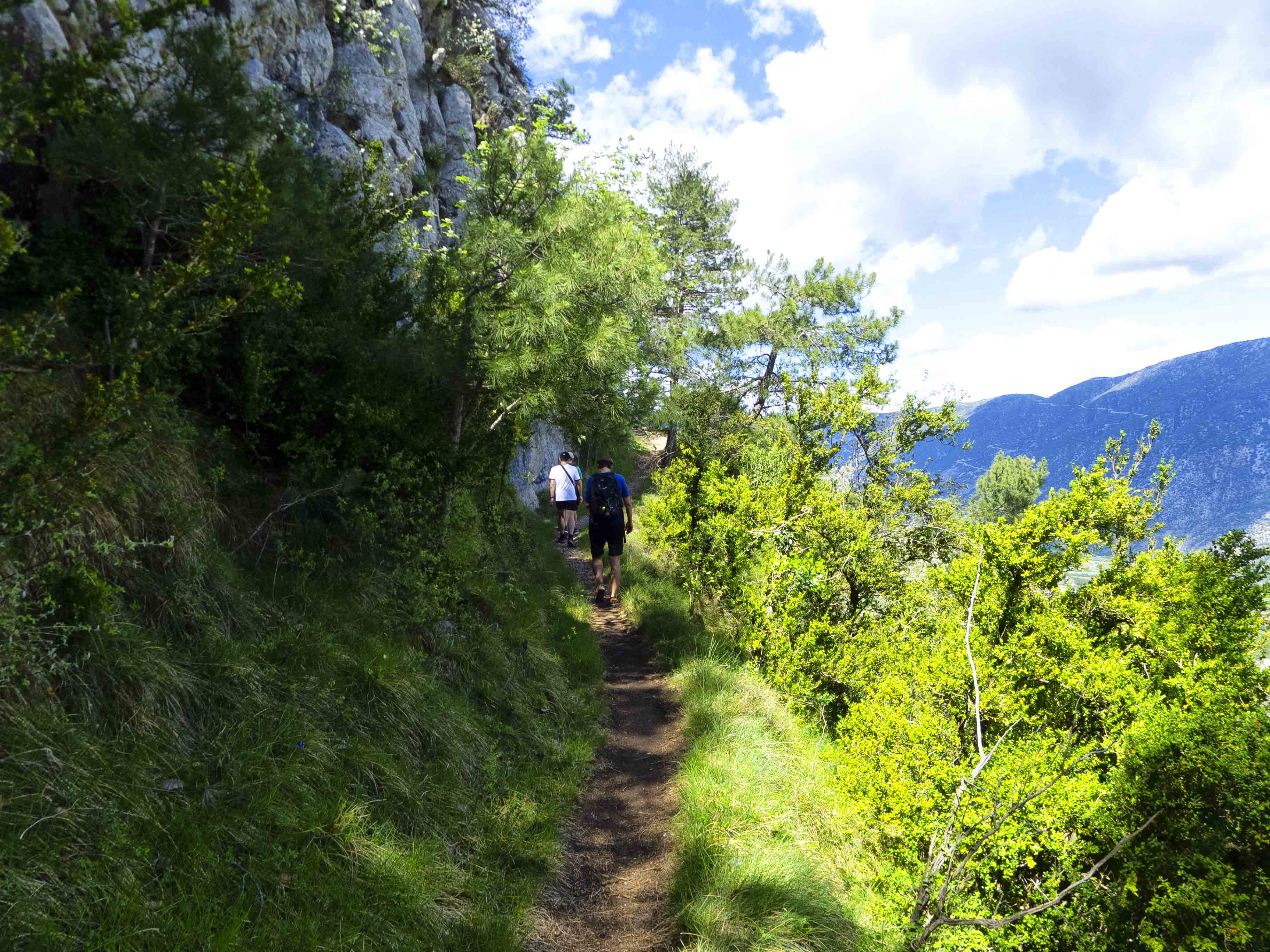 El sendero sube mediante lazadas por el empinado bosque, muy frondoso y de un verde resplandeciente.