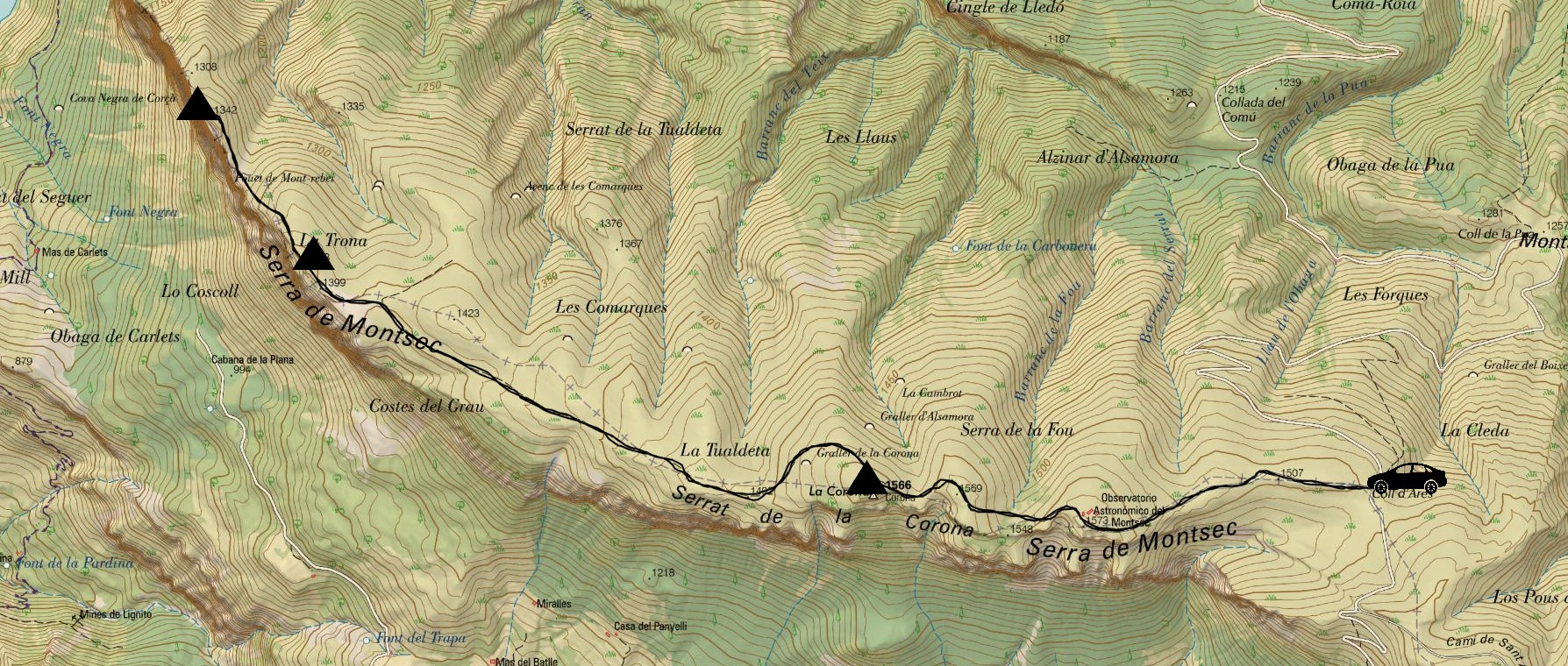 Salimos del Coll d'Ares, a una altura más que notable, y es que aunque empezaremos subiendo, la mayor parte de la ida será en descenso. En primer lugar, tomamos la pista de cemento que va del Coll d'Ares al observatorio astronómico del Montsec, cuya cúpula vemos en lo más alto de la primera cota que tenemos que superar, siendo la más alta del Serrat de la Corona aunque no la que tiene el vértice.