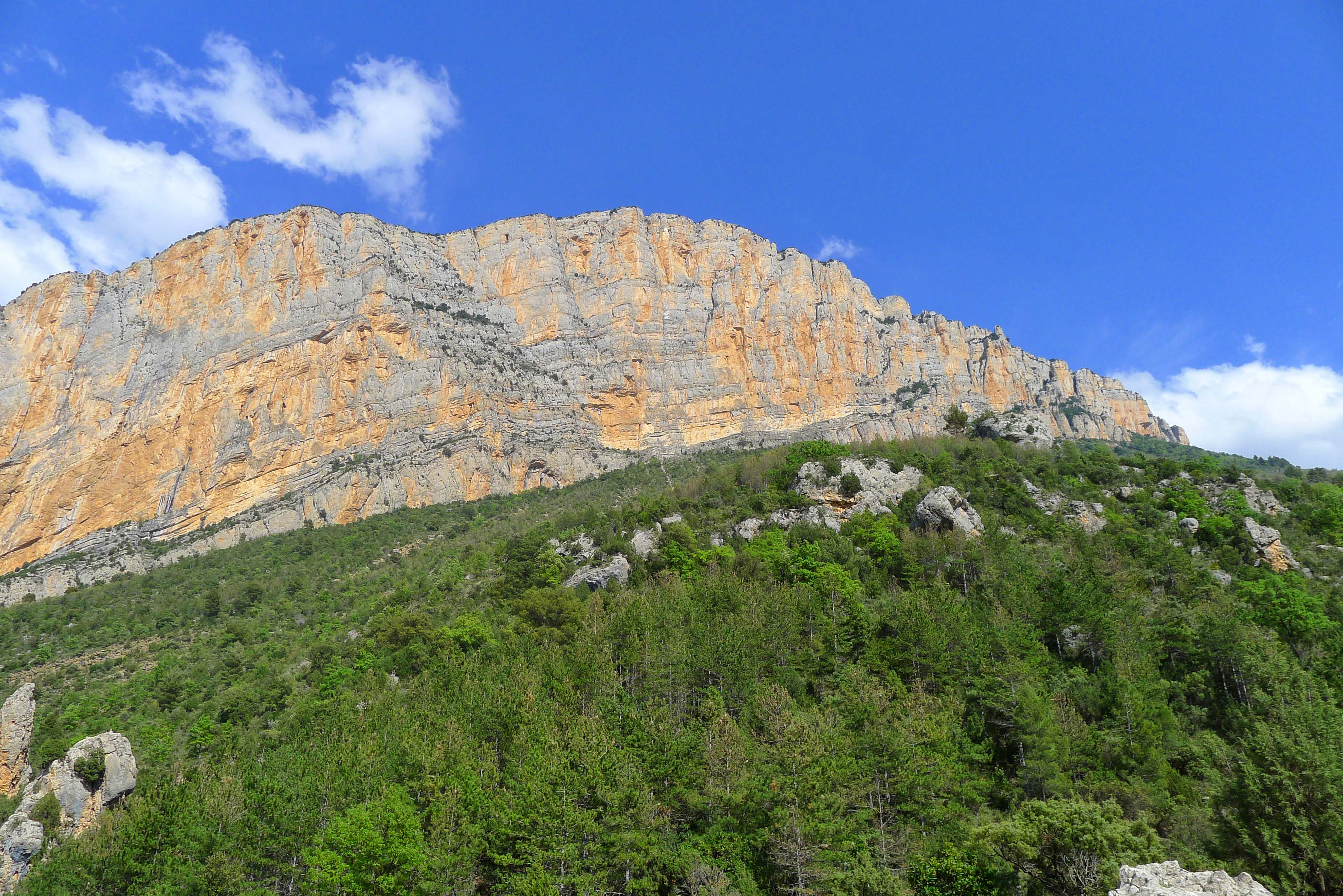 Aunque la parte más espectacular de Mont-Rebei queda escondida por la perspectiva de la misma sierra, si que tenemos una visión impresionante de la pared gemela, la del Montsec d'Estall, de una magnitud similar a la pared desde la que la observamos.