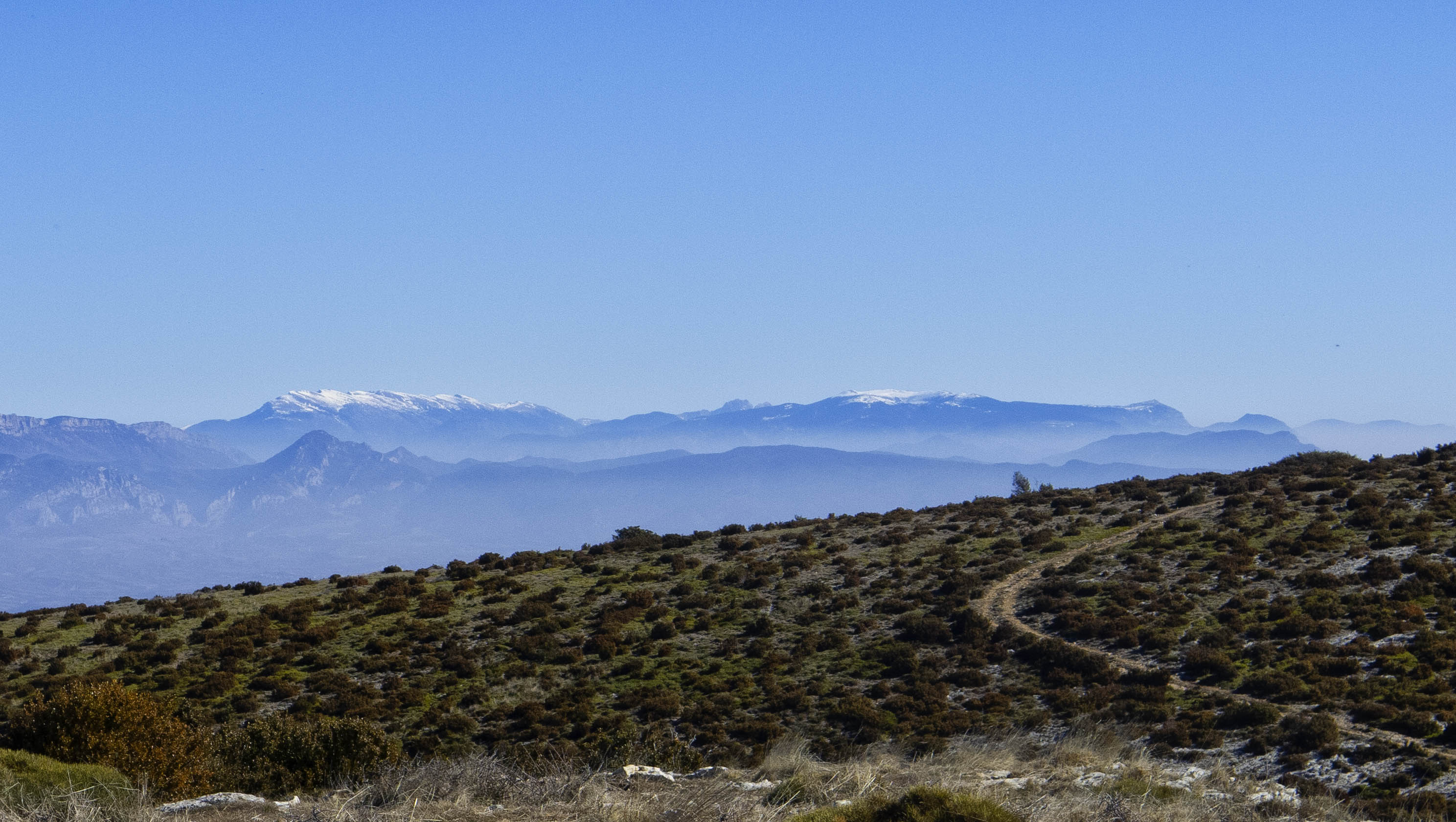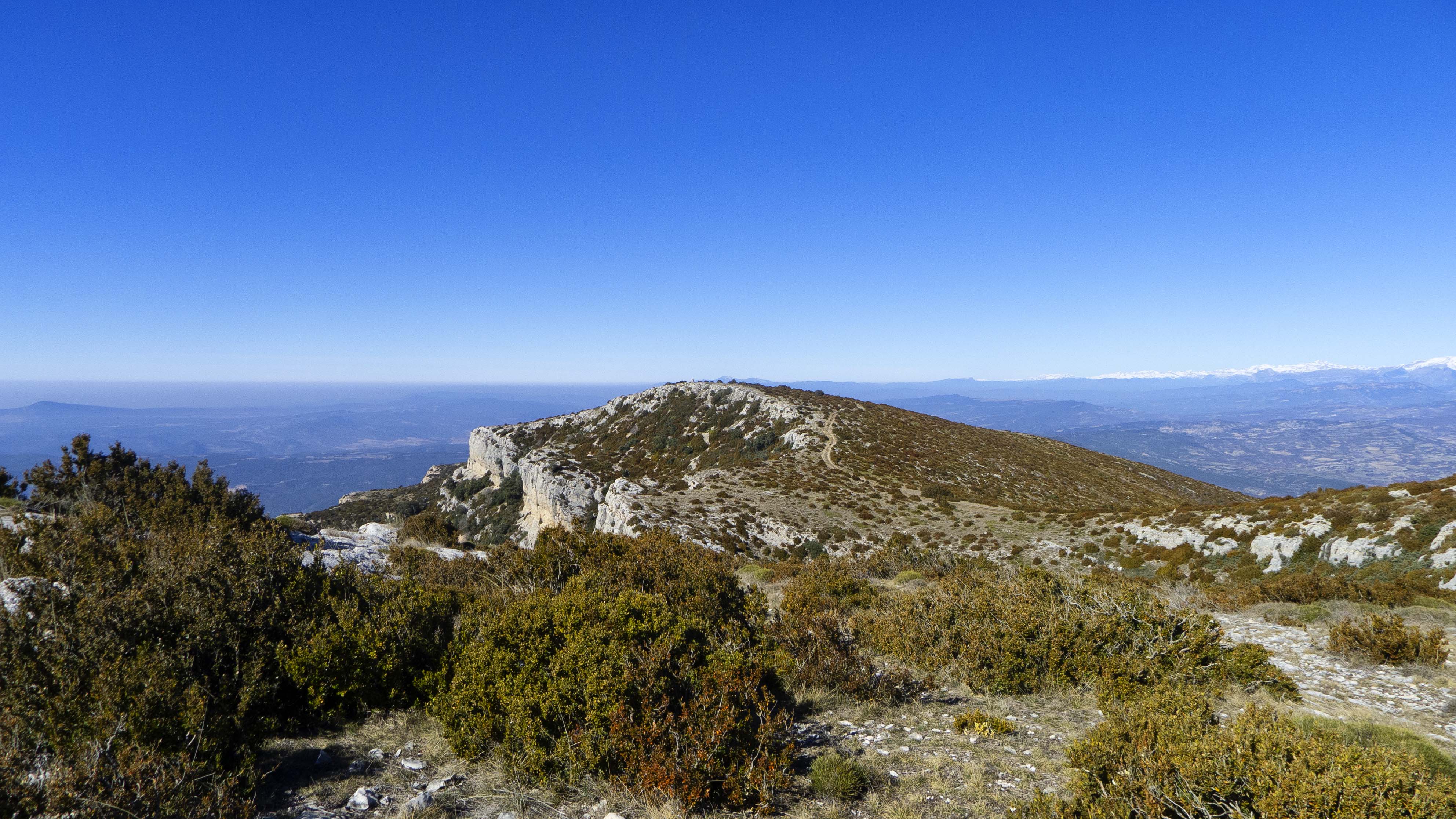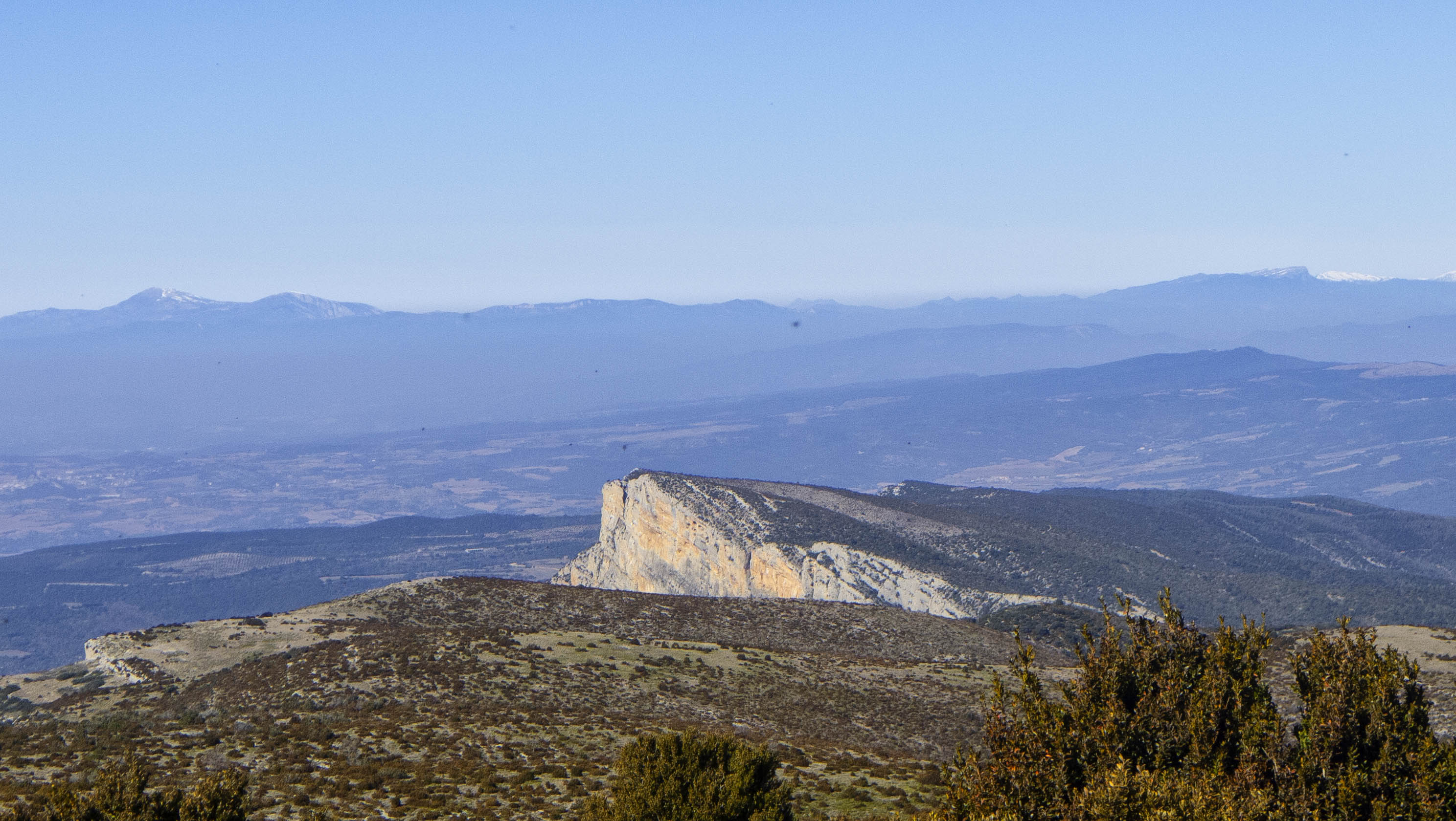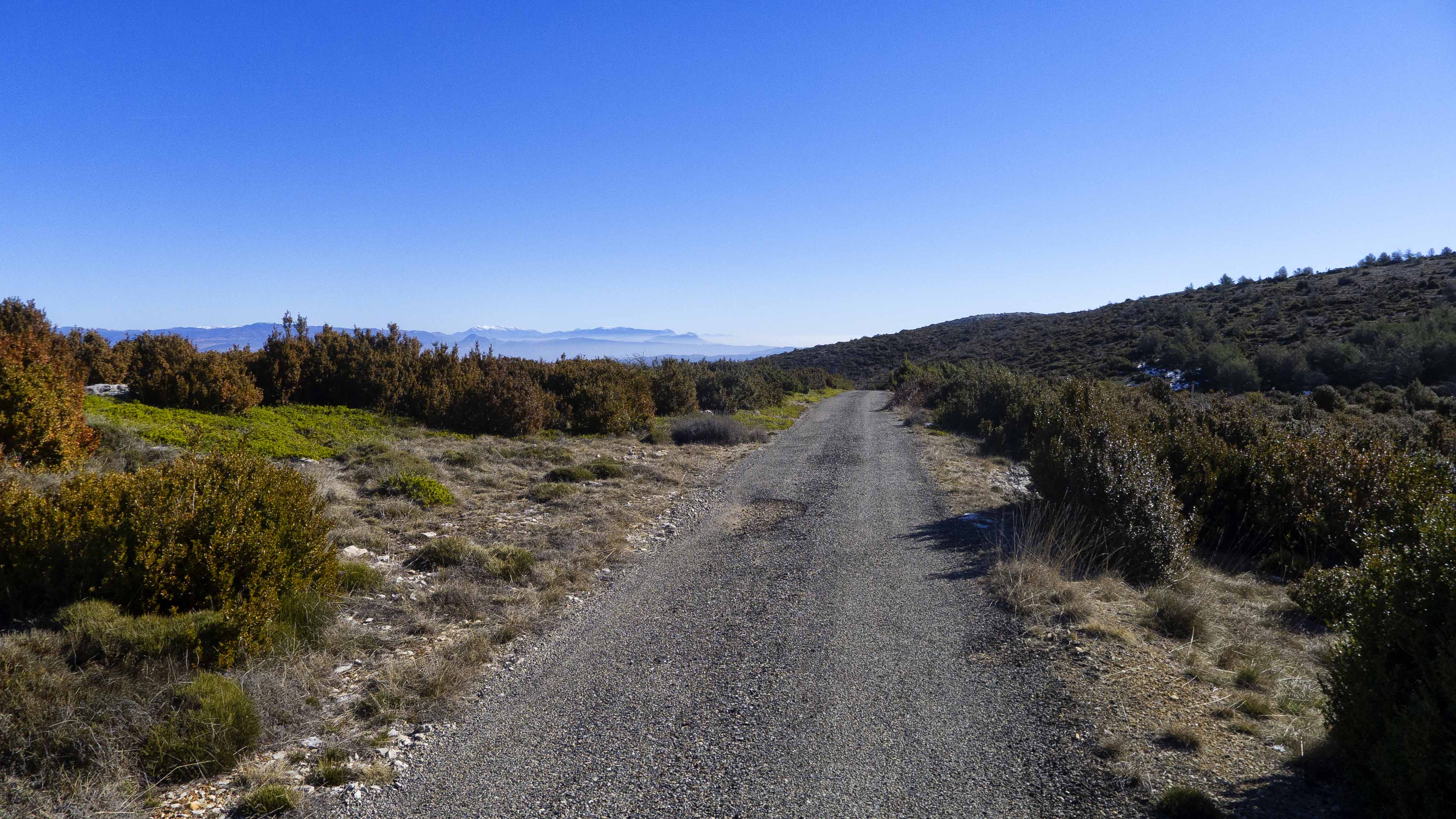 Aunque el avance es algo monótono, aprovechamos la comodidad de la pista y la excepcional visibilidad del cielo para disfrutar de las dilatadas panorámicas que se disfrutan del Montsec, privilegiado mirador de casi la totalidad del Pirineo. Desde esta sierra se pueden llegar a ver desde los Pirineos de Girona hasta las grandes cumbres de los Pirineos Occidentales. Vamos por partes: al este, el Cadí y el Port del Comte, con los pollegons del Pedraforca asomando entre los dos.