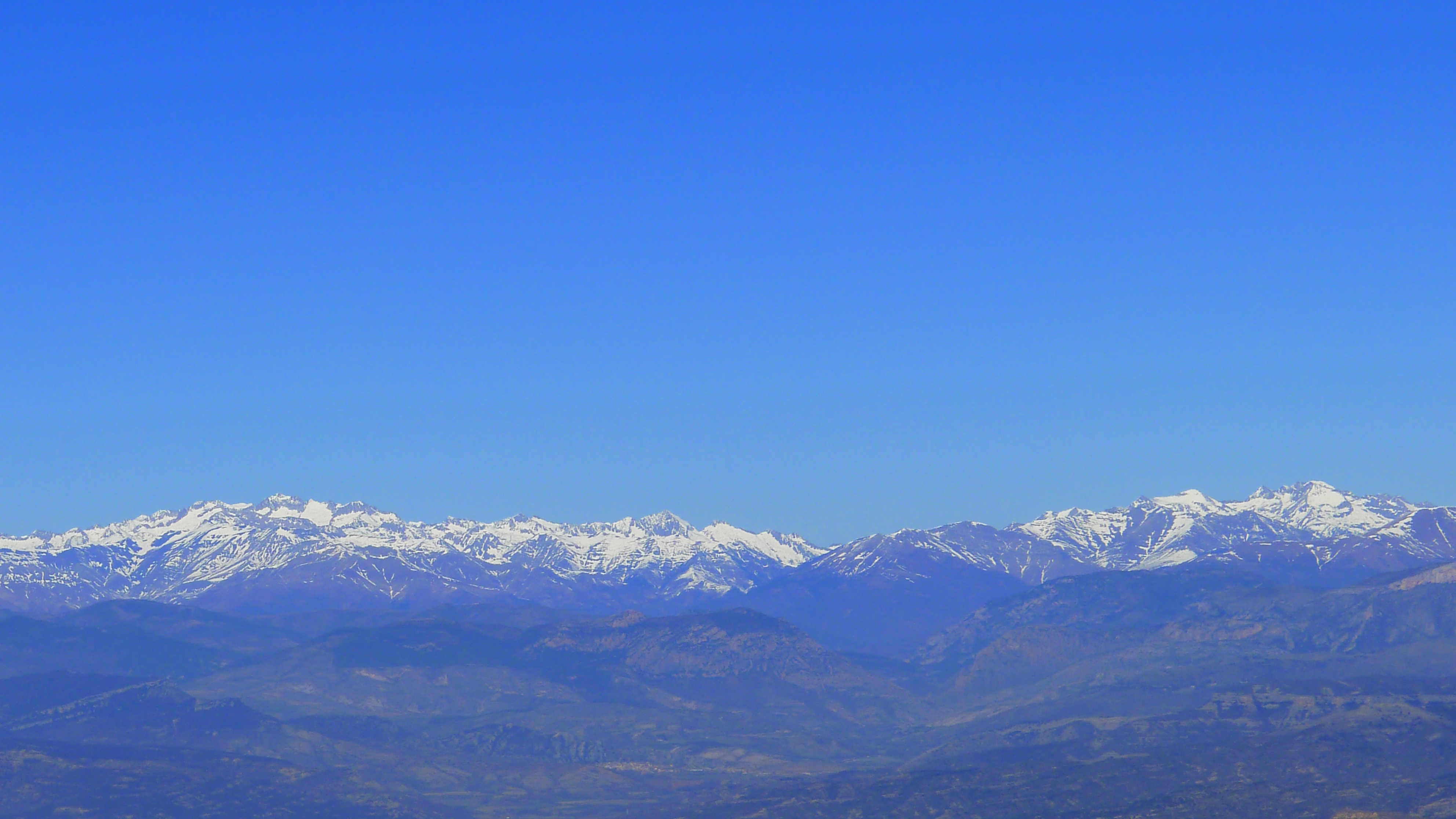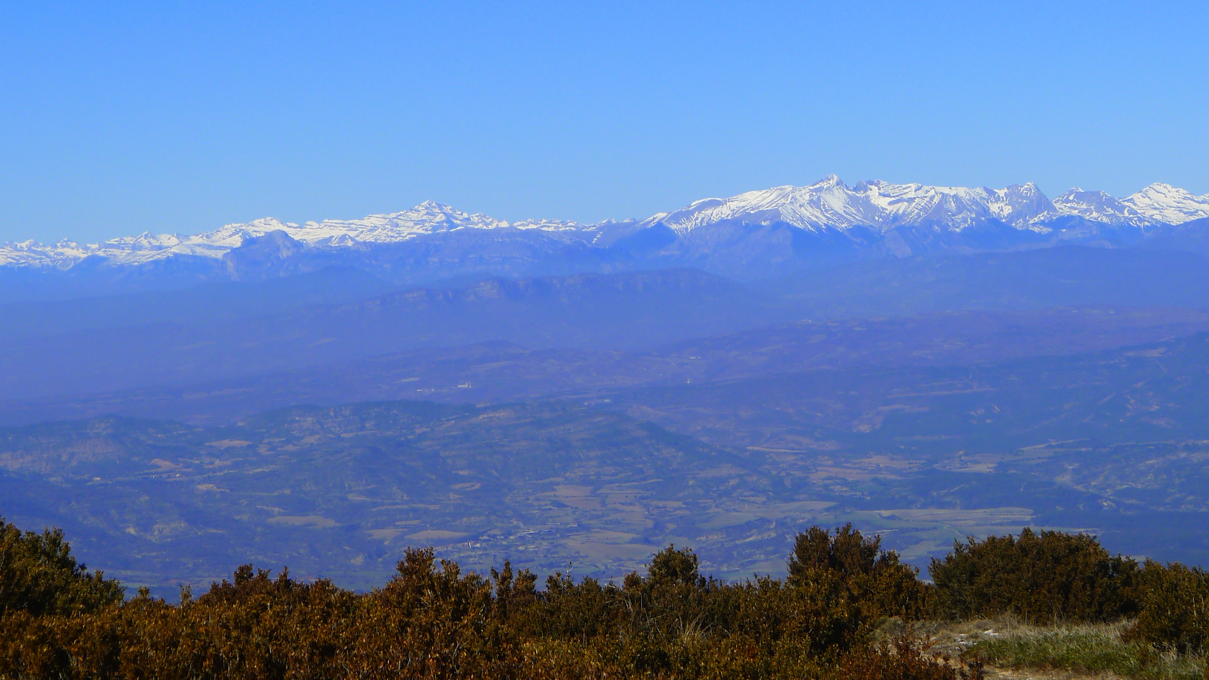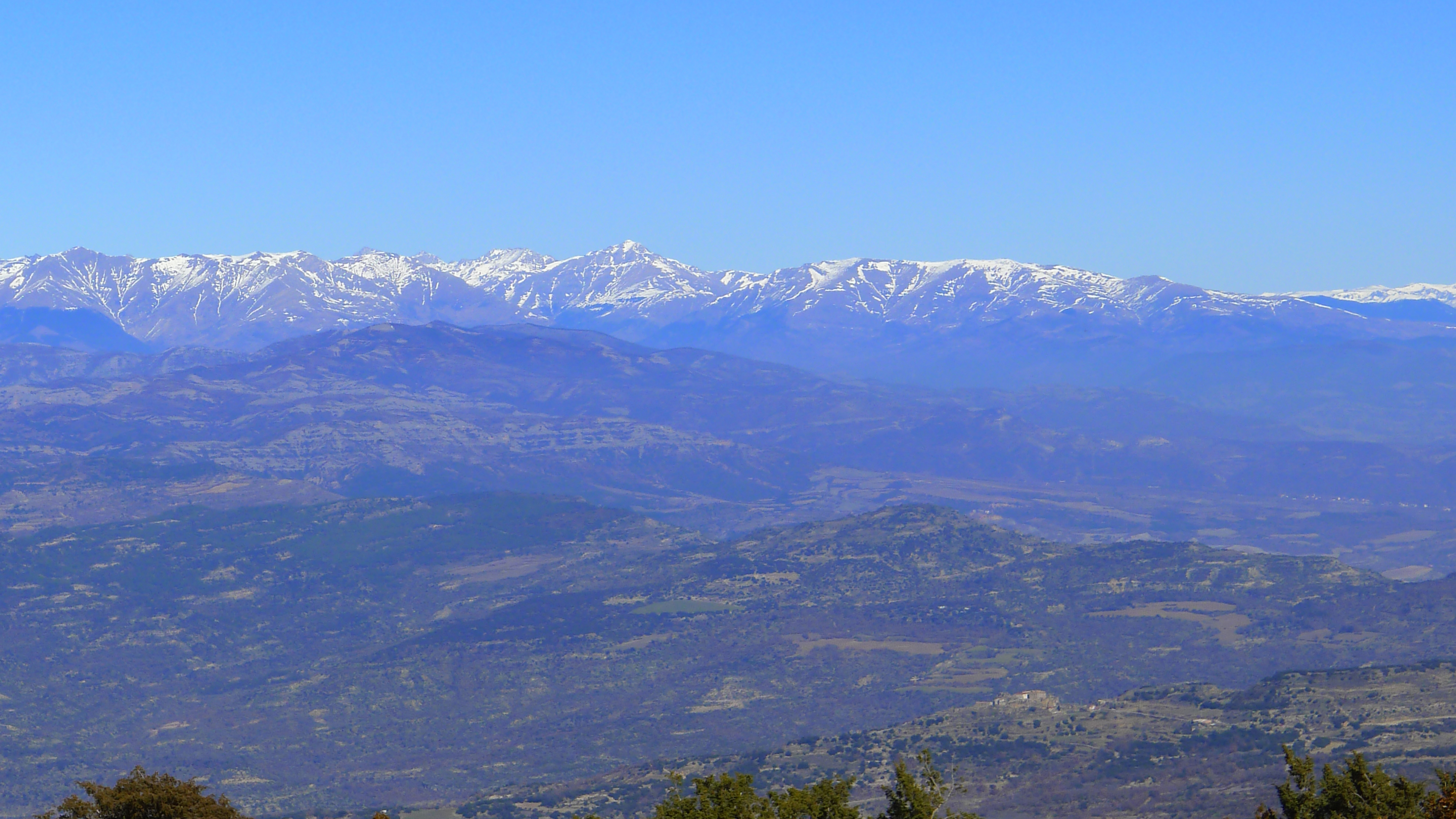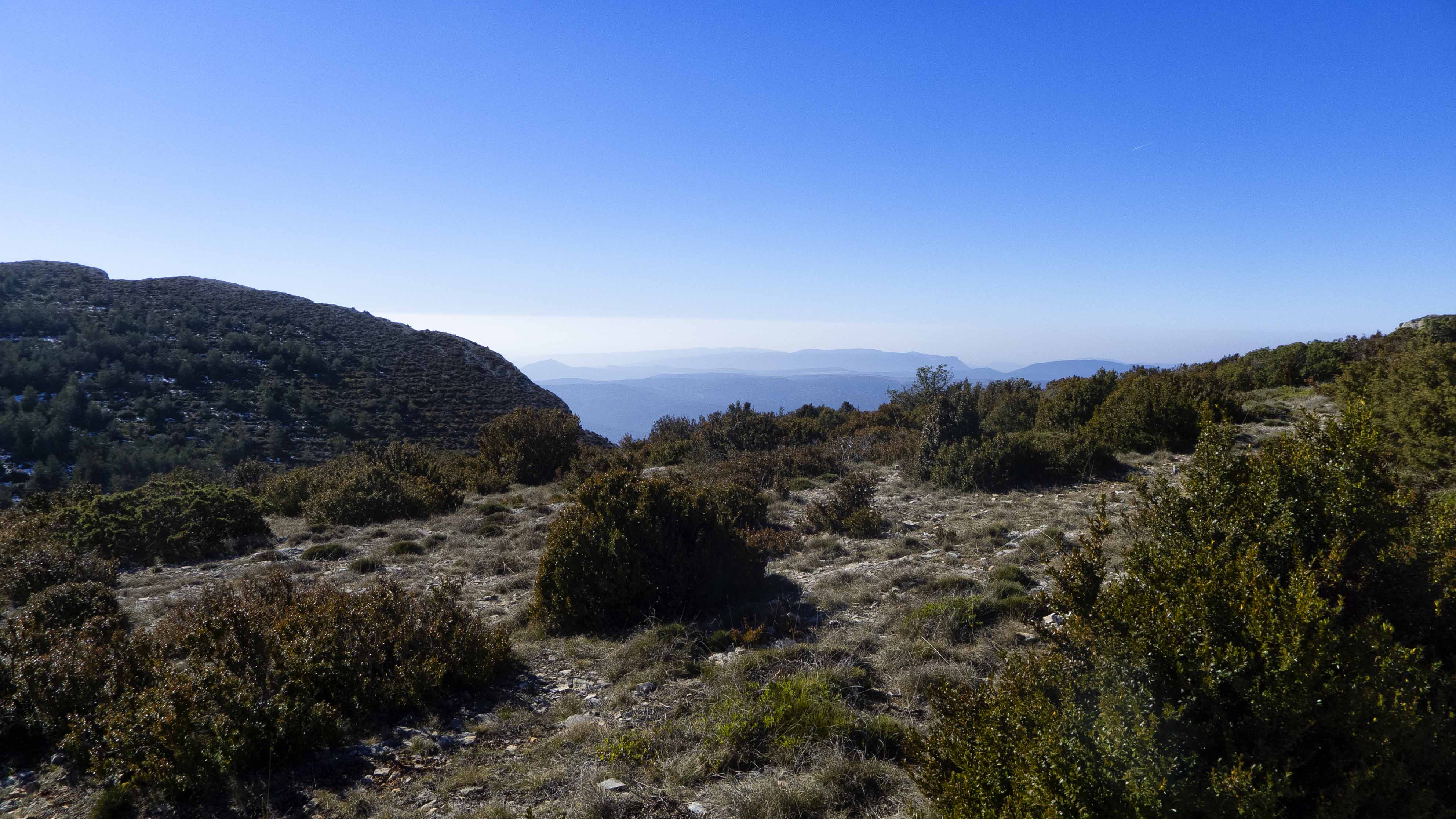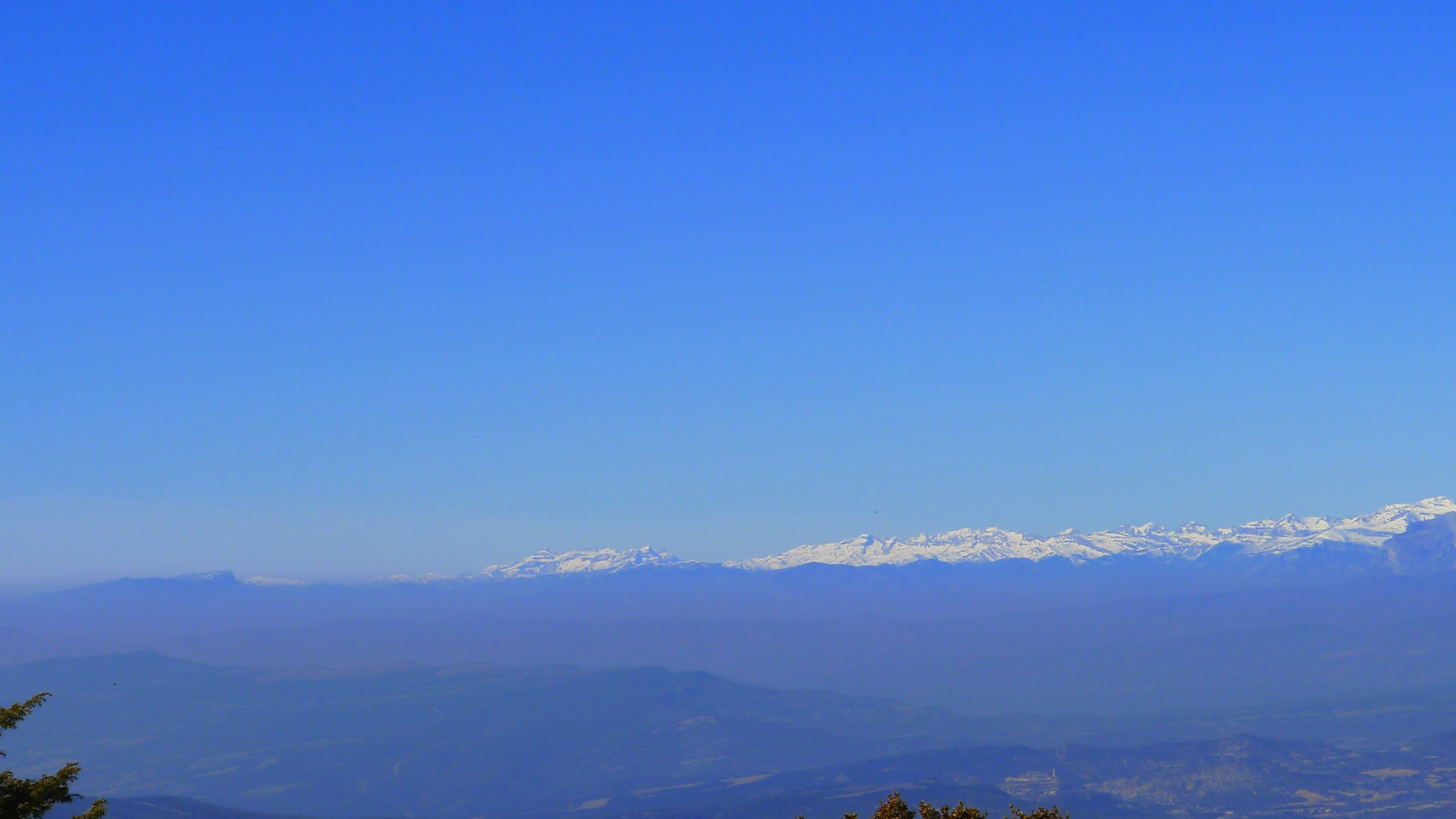 Aunque el avance es algo monótono, aprovechamos la comodidad de la pista y la excepcional visibilidad del cielo para disfrutar de las dilatadas panorámicas que se disfrutan del Montsec, privilegiado mirador de casi la totalidad del Pirineo. Desde esta sierra se pueden llegar a ver desde los Pirineos de Girona hasta las grandes cumbres de los Pirineos Occidentales. Vamos por partes: al este, el Cadí y el Port del Comte, con los pollegons del Pedraforca asomando entre los dos.