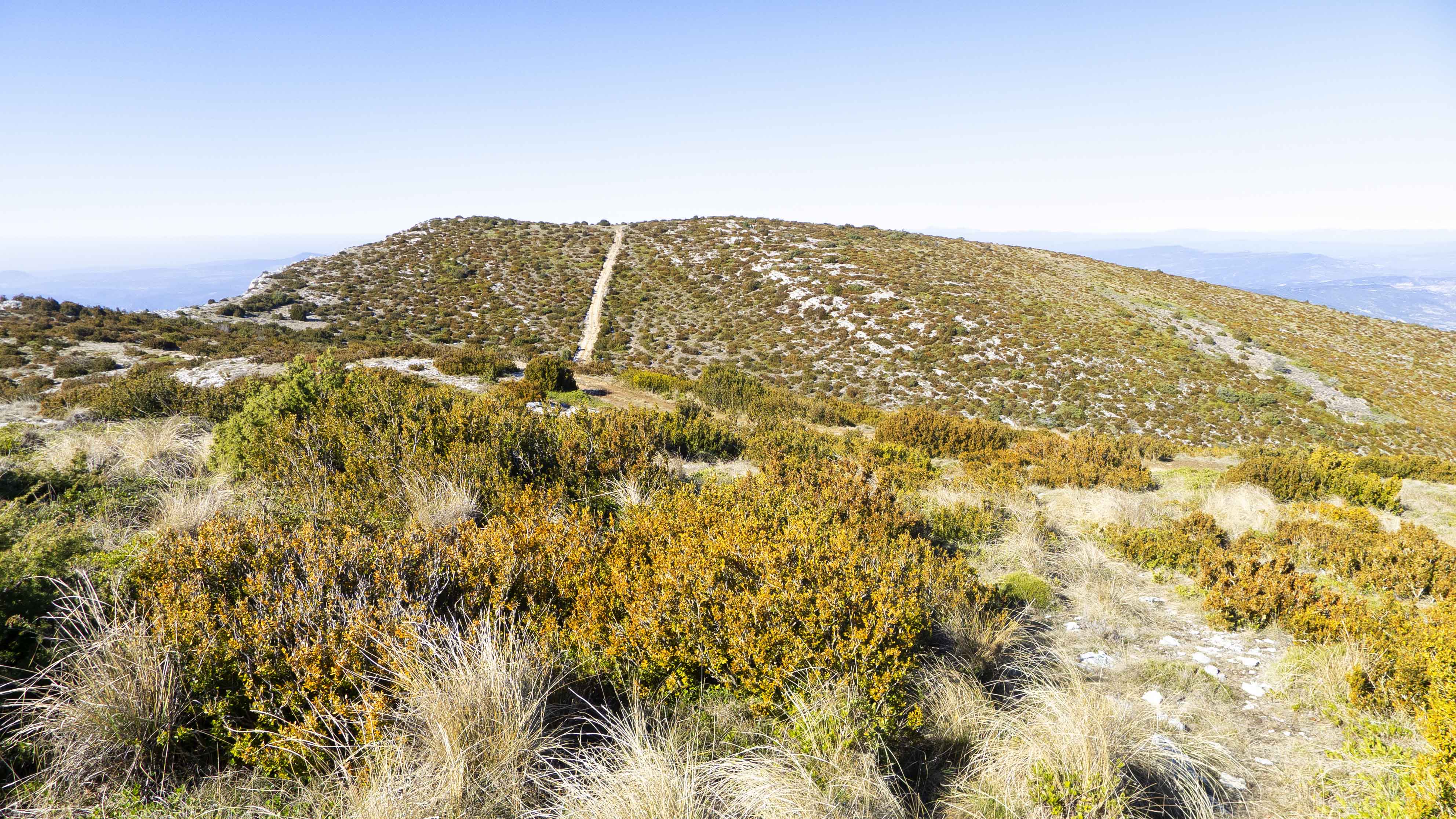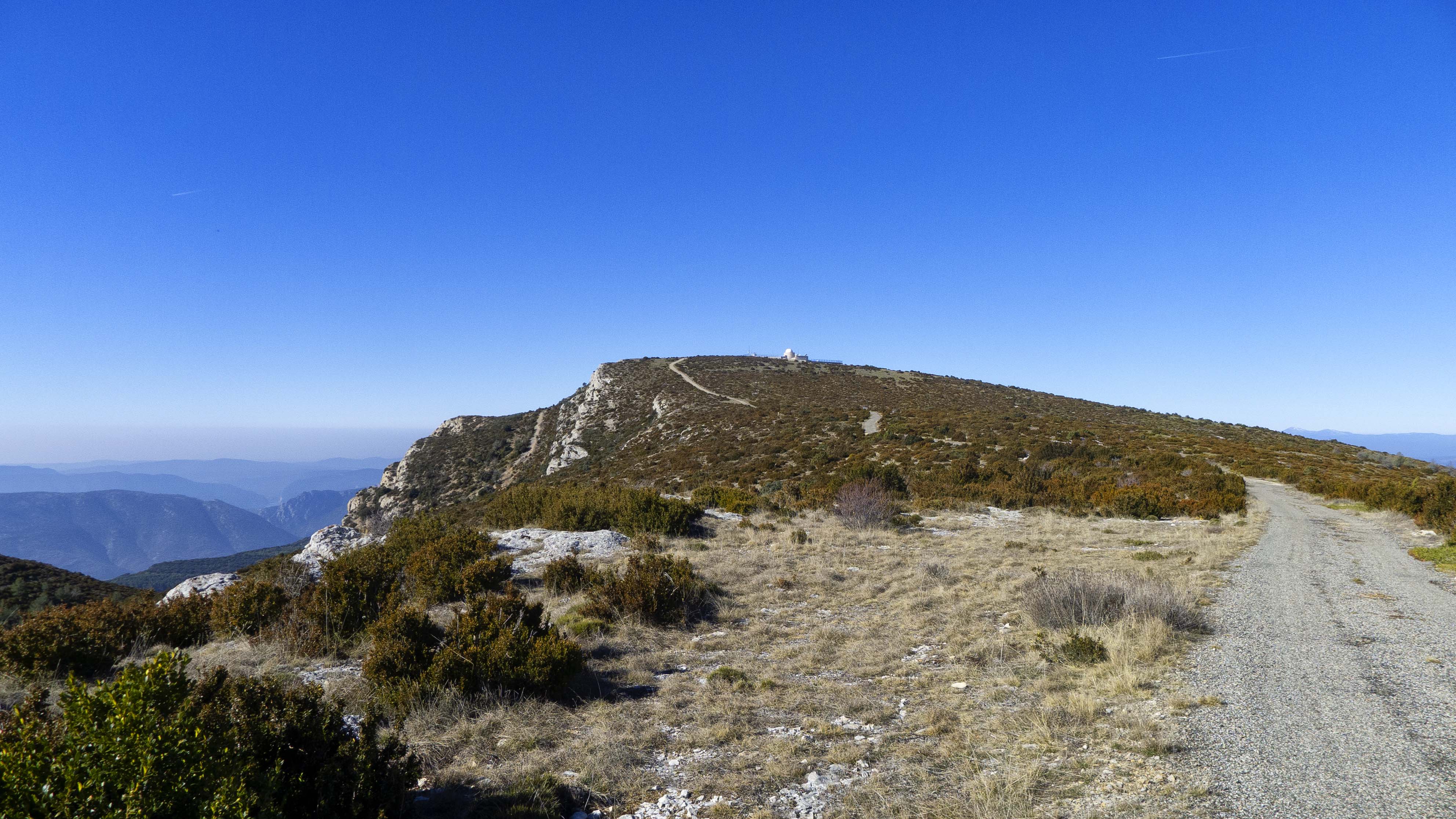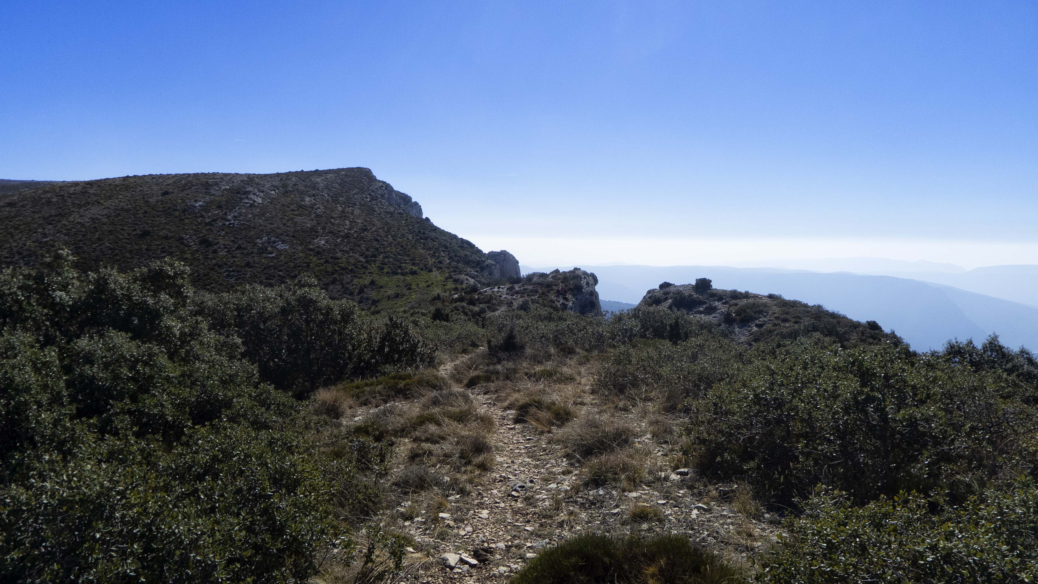 Tras el observatorio, la carretera se convierte en una pista de tierra muy degradada que baja y sube las distintas cotas del Serrat de la Corona.