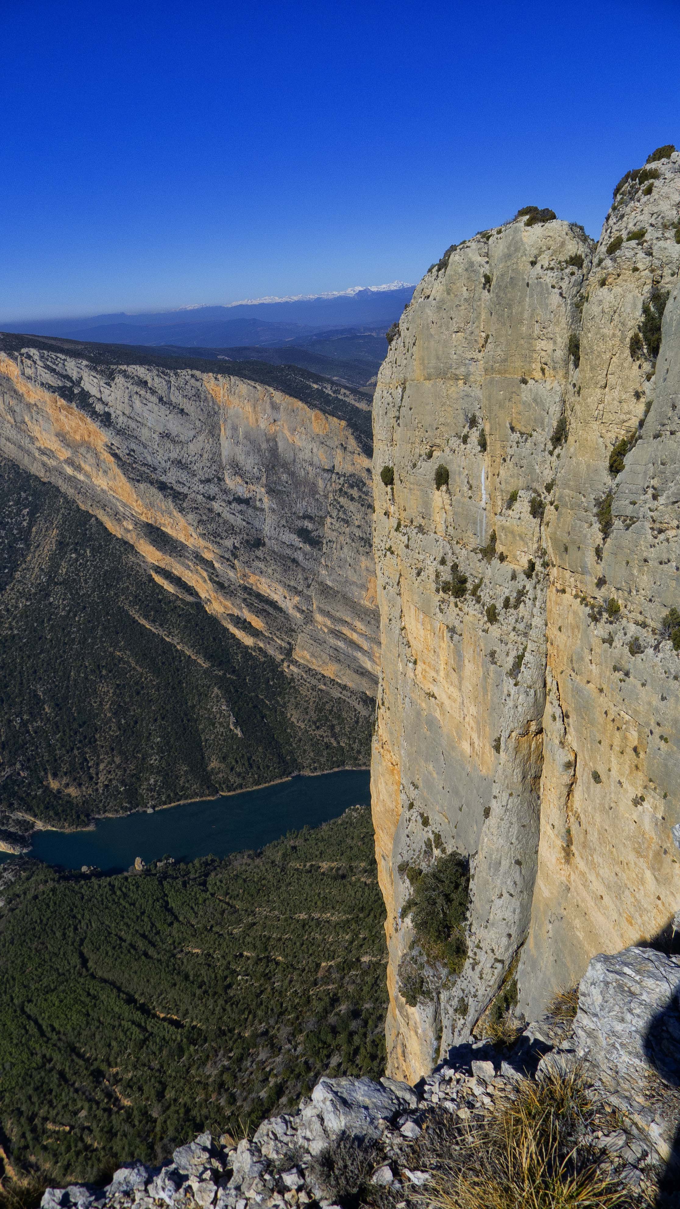 Subimos a la primera de las cotas, que queda algo separada de la pared, y nos asomamos con cuidado a la misma. La vista es de las que quitan el hipo y desde luego no apta para la gente con vértigo. Estamos en lo alto de la Paret de Catalunya, la pared del Montsec d'Ares que protege la vertiente derecha de Mont-Rebei, mientras tenemos enfrente la Pared de Aragón, la gemela aragonesa que se ocupa de la vertiente izquierda del desfiladero.