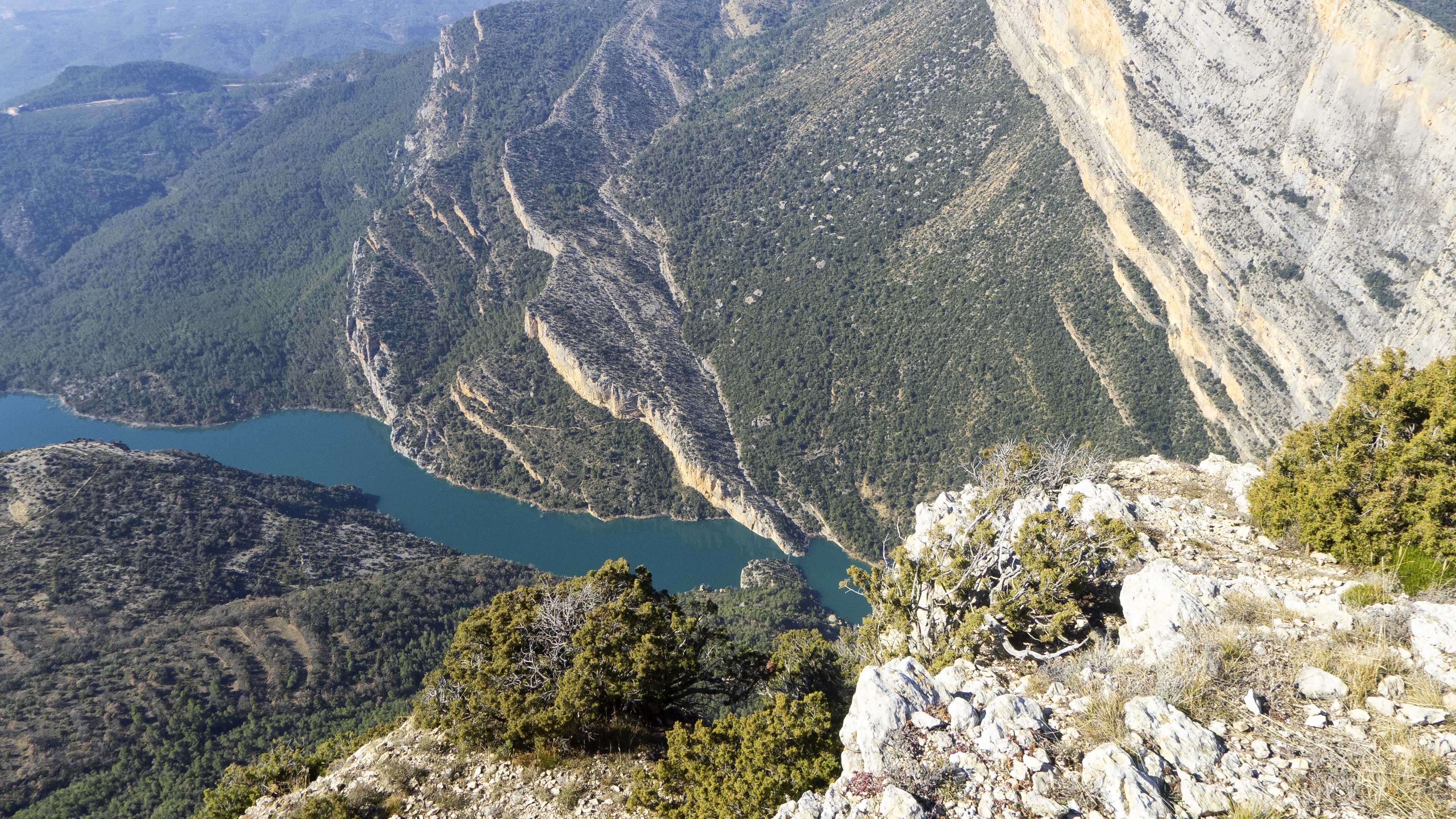 Desde esta cota ya podemos ver Mont-Rebei a nuestros pies, viéndose especialmente bien el Congost del Seguer, donde se encuentra el puente que une Aragón y Catalunya, observándose también con claridad las pasarelas de Montfalcó.