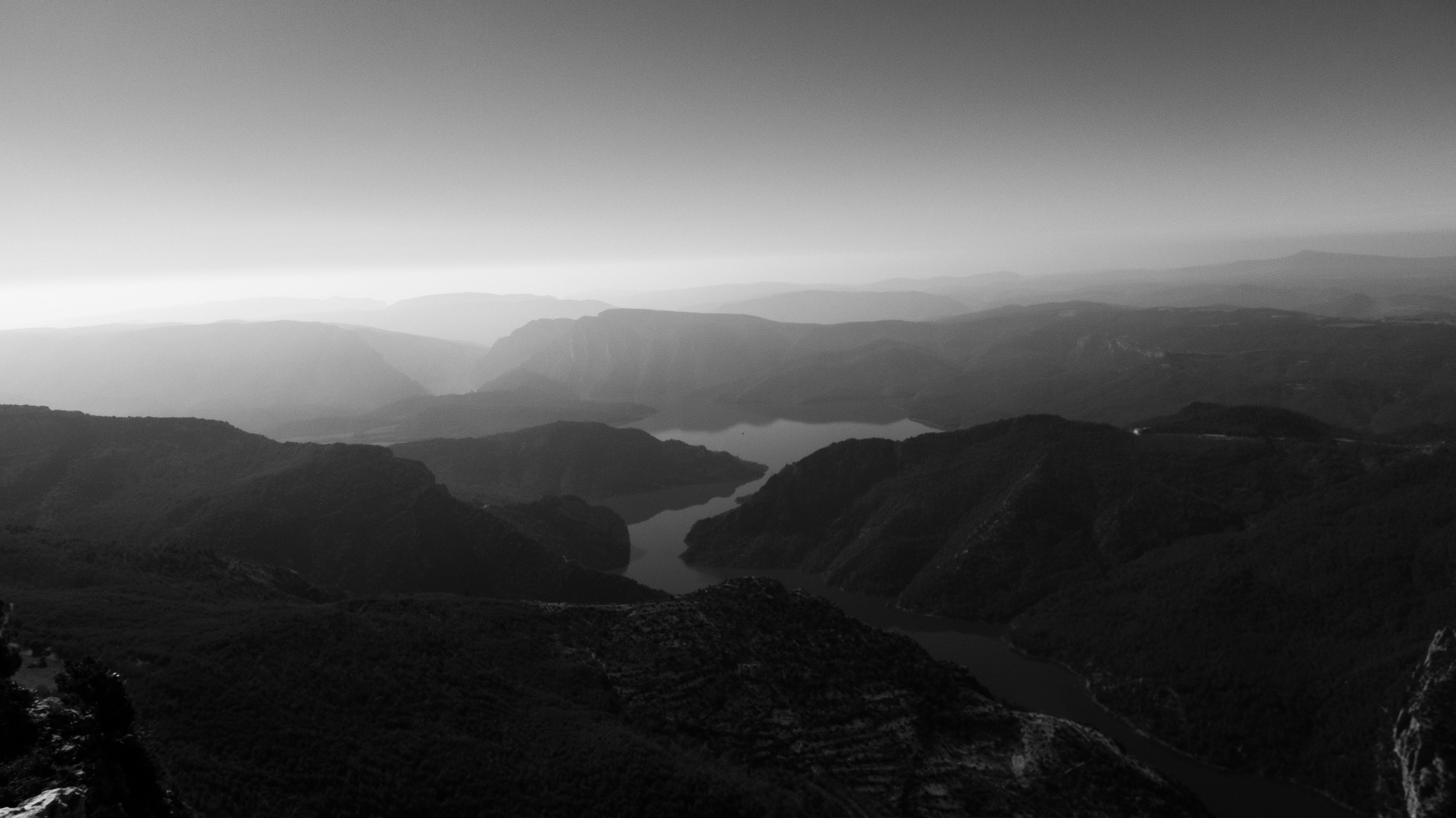 El pantano de Canelles con un recorrido sinuoso mientras esquiva las montañas de La Noguera y la Litera.