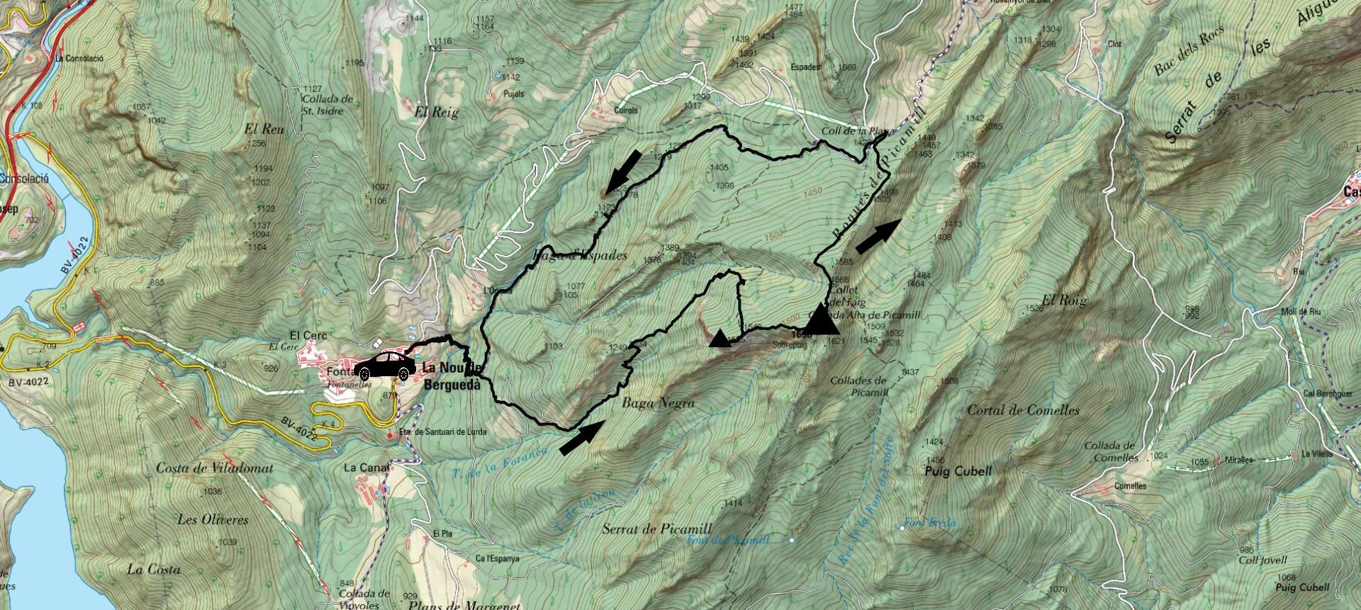 Tras la visita, el sendero continúa en fuerte descenso hasta que, entre claros del bosque, aparece ya la Nou de Berguedà. Antes de llegar, sin embargo, da un amplio rodeo para salvar el Torrent de la Nou y reenlazamos con la bifurcación de esta mañana. Con ello cerramos una magnífica jornada de montaña, coronando una de las cumbres más emblemáticas y formidables del Berguedà.