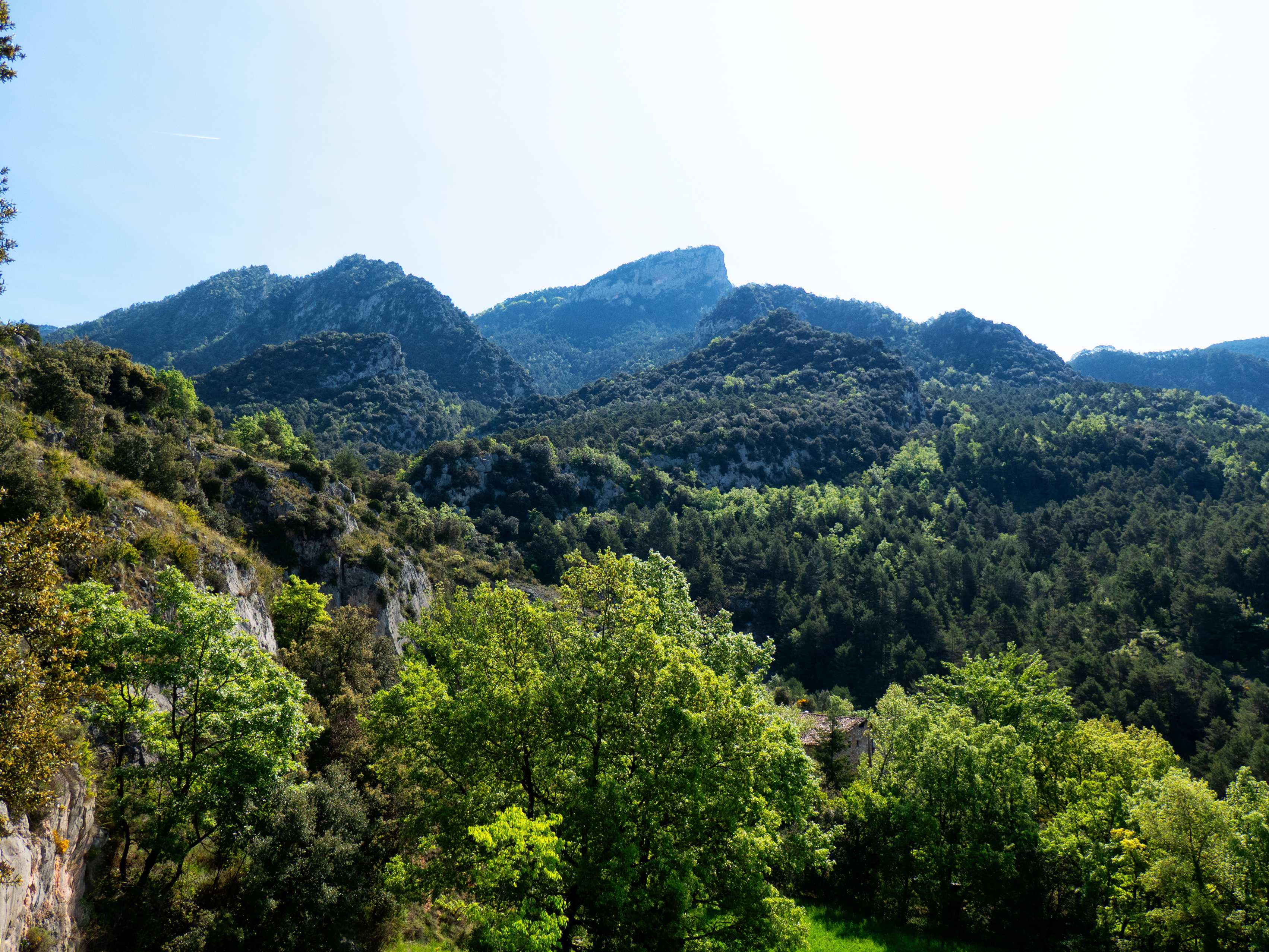 Al cruzar a la otra vertiente del barranco dejamos atrás el pueblecito de la Nou, mientras van asomando algunos de los colosos del Berguedà: de momento, los Rasos de Peguera, el Cap de Confós y la Serra d'Ensija.