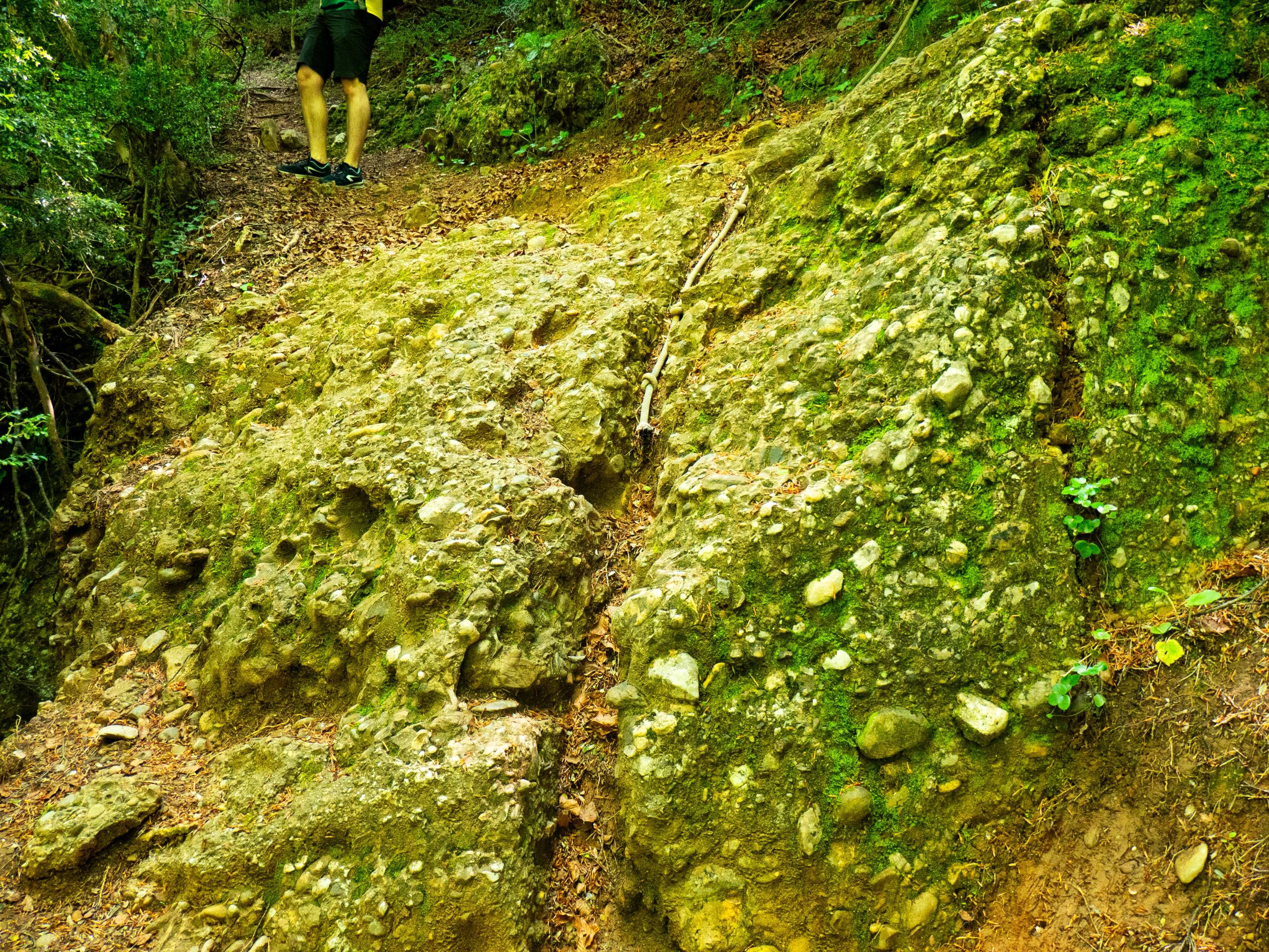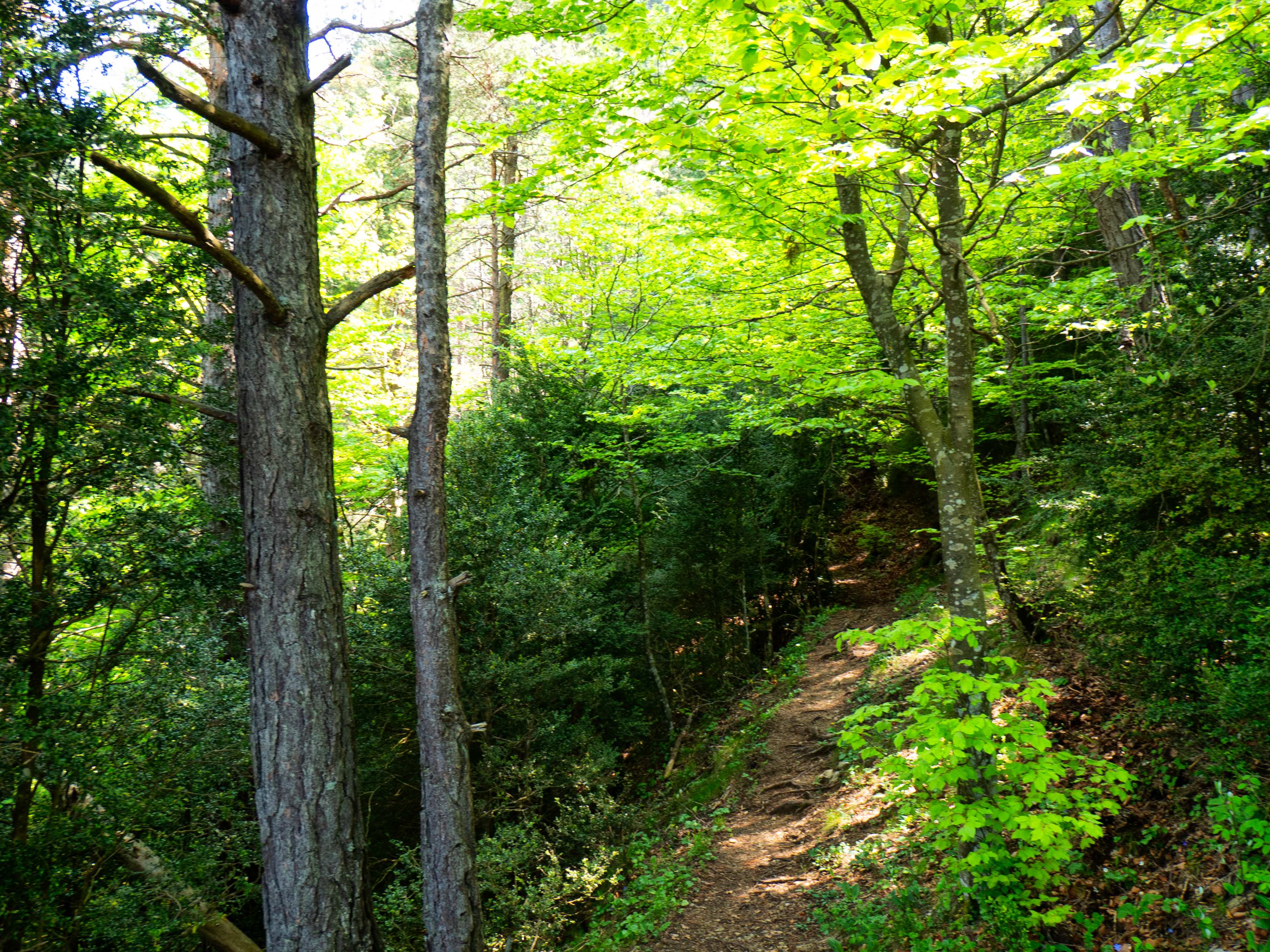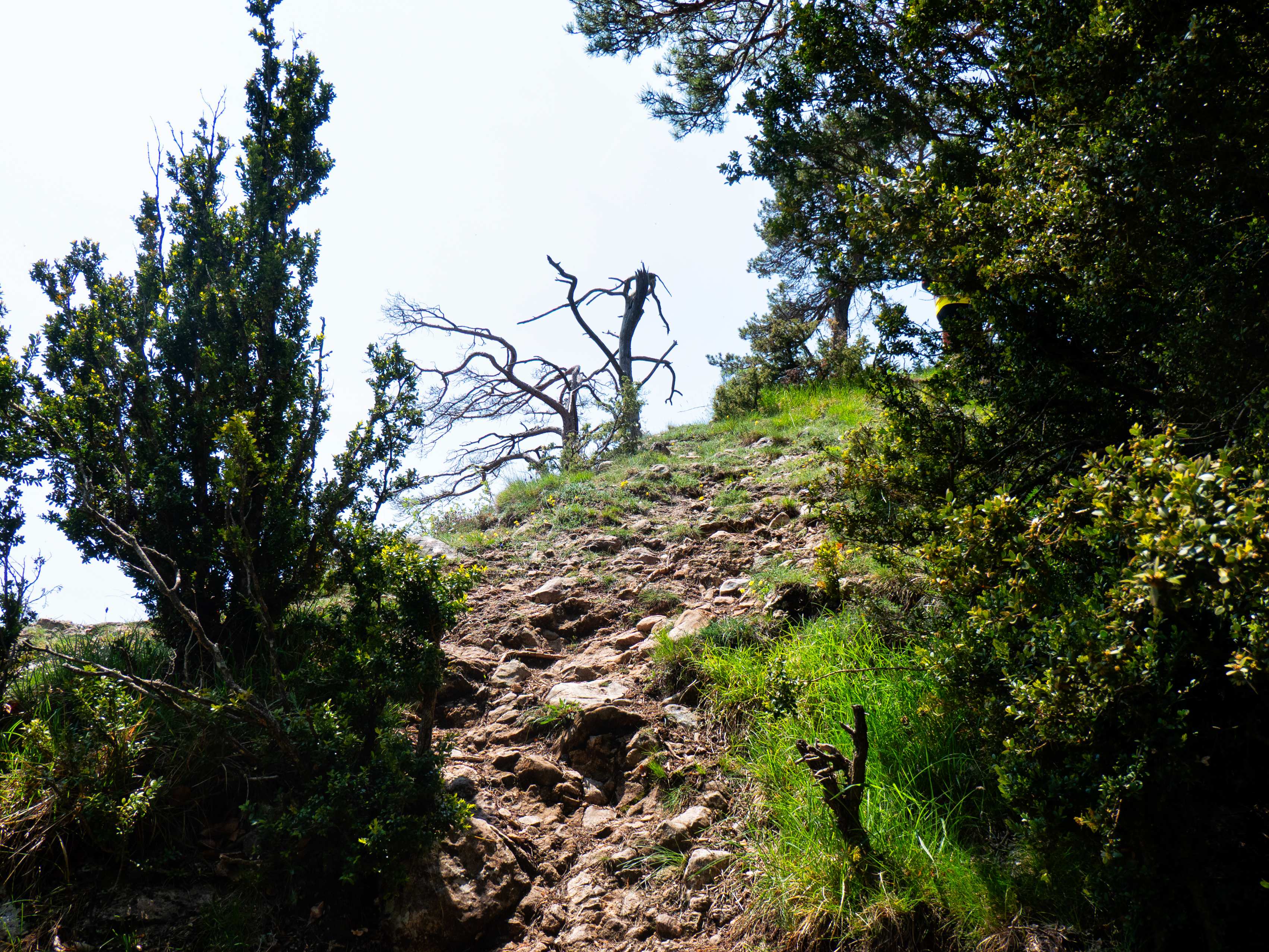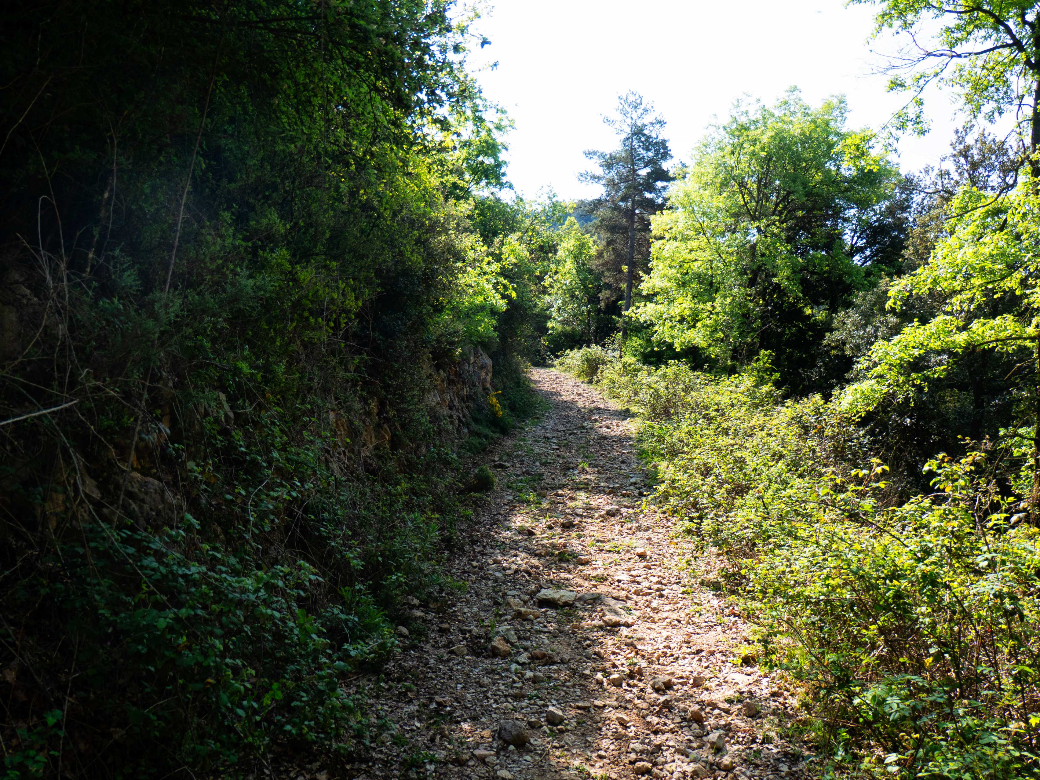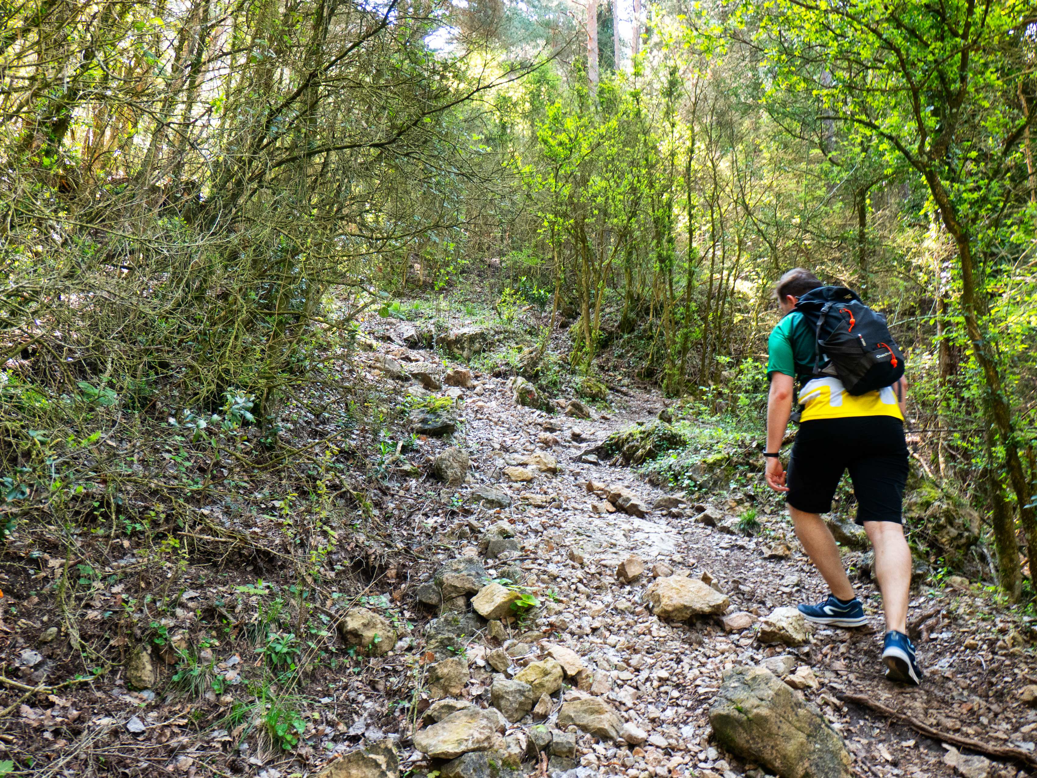 El sendero asciende por el Torrent de la Foranca en fortísima pendiente, avanzando bajo el denso arbolado por terreno pedregoso, en lo que seguramente sea la subida más dura del día.