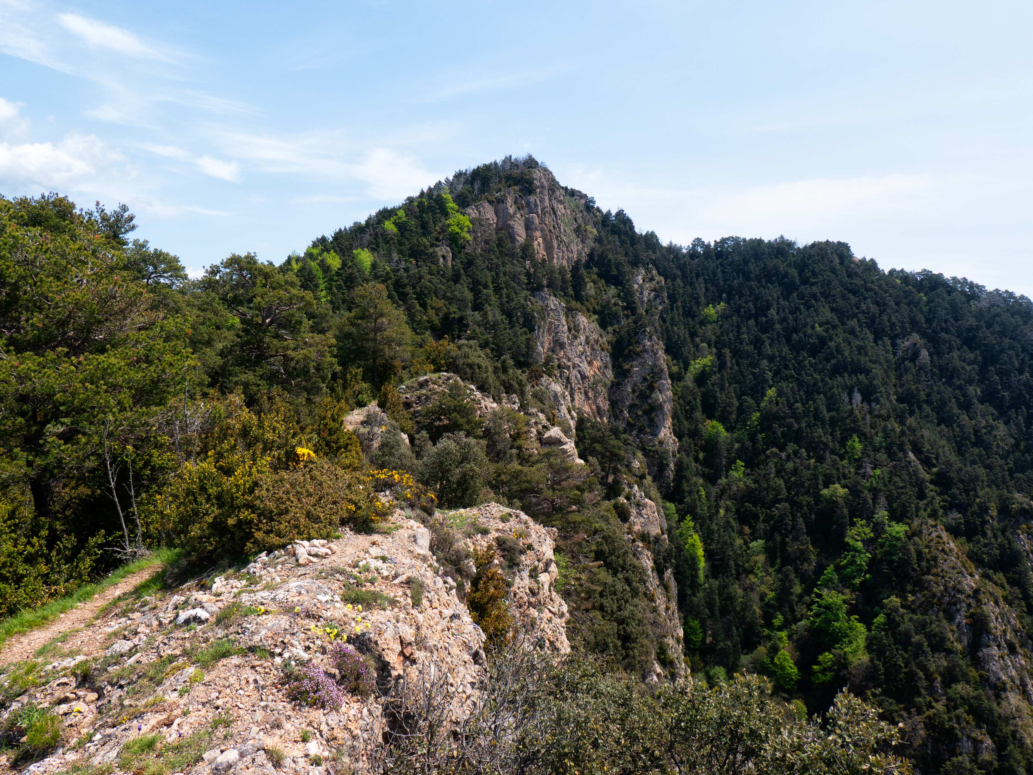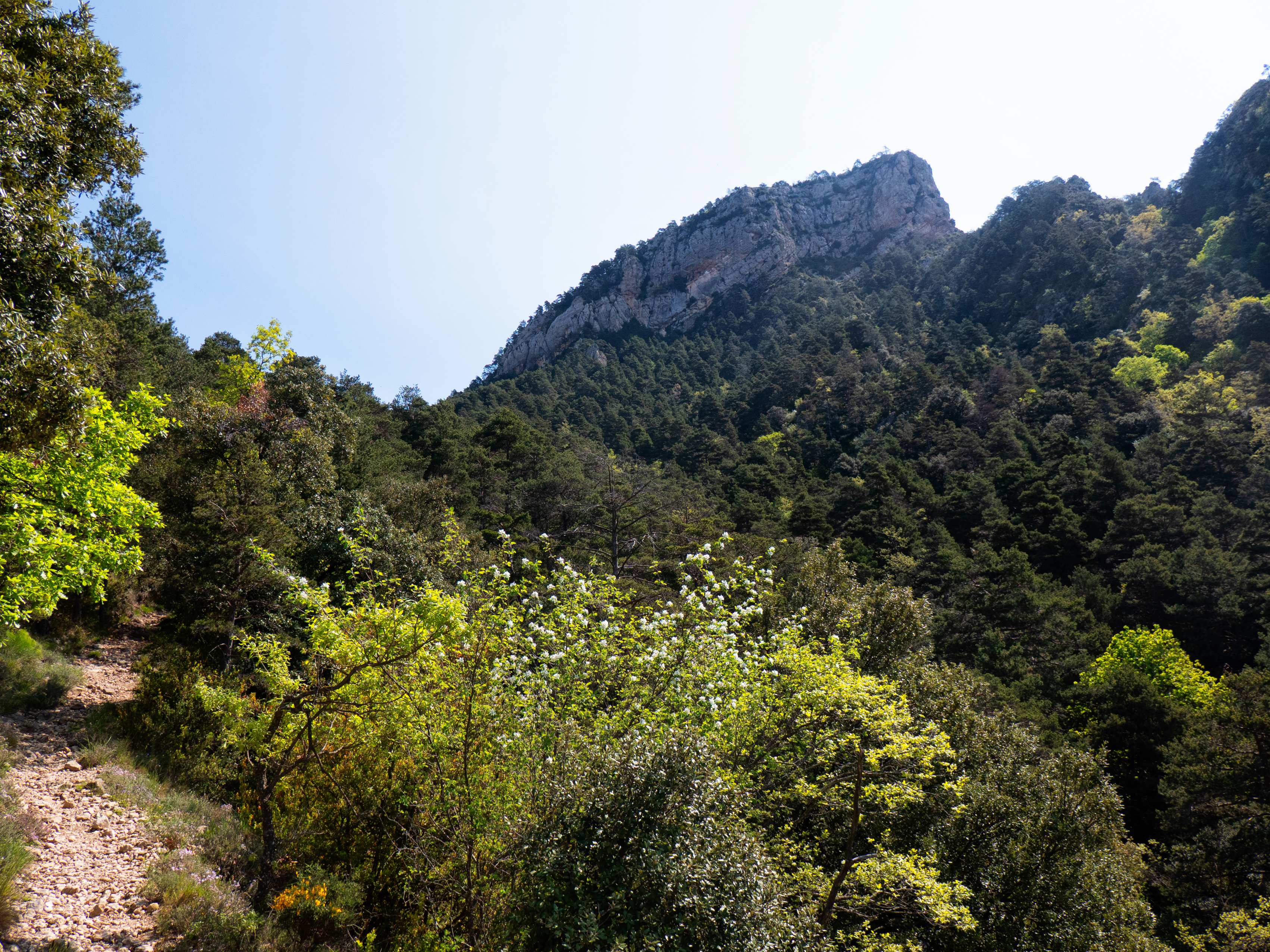 Después de ganar unos 200 metros de desnivel por el bosque, el sendero empieza a trazar zigzags por terreno más abierto, lo que nos permite ver la diente del Sobrepuny de Baix, cada vez más cercana. Como se puede apreciar, el acceso directo a esta cima queda imposibilitado por la verticalidad de su pared occidental, por lo que la rodearemos por la izquierda para entrar por su cara norte.