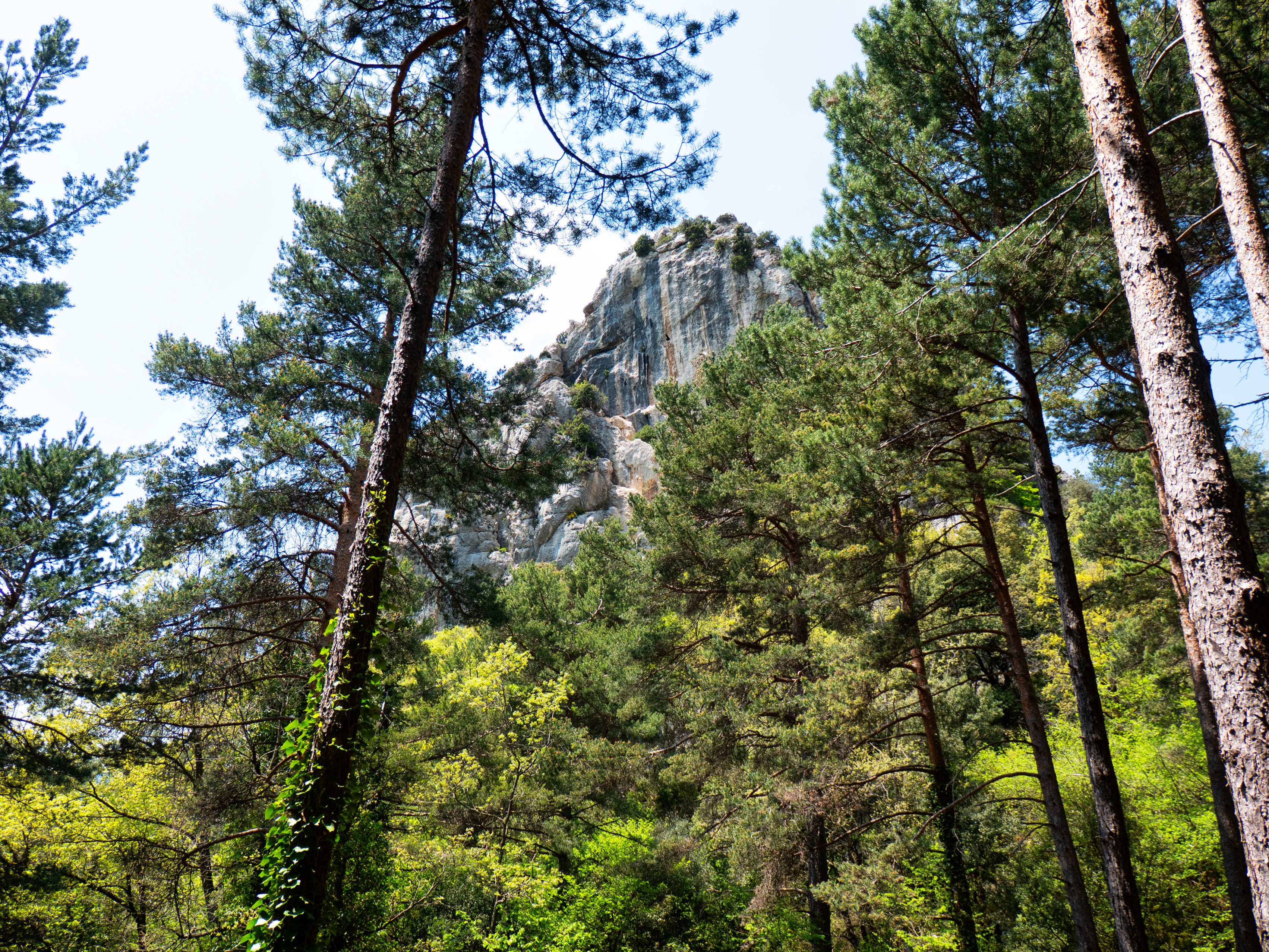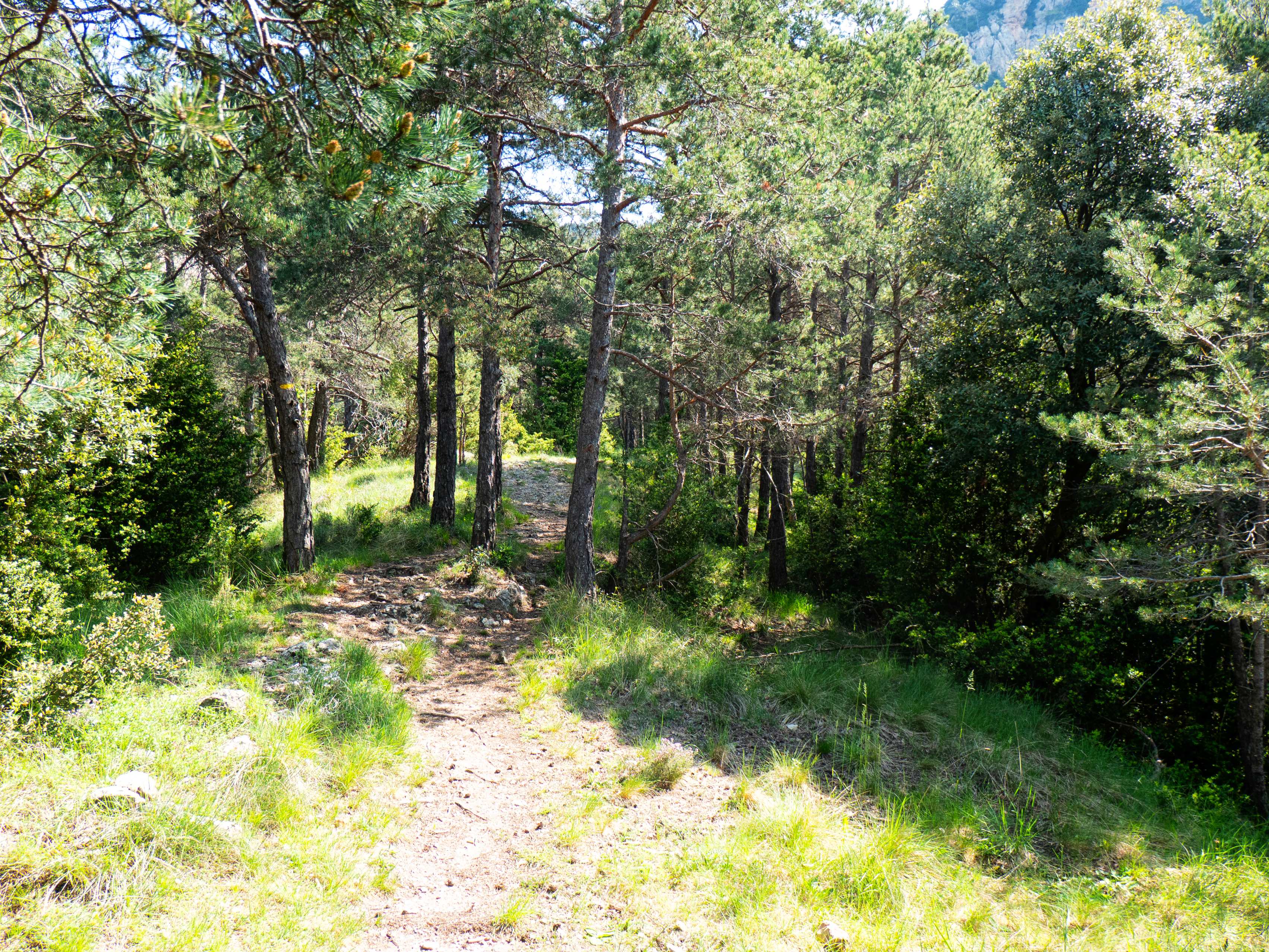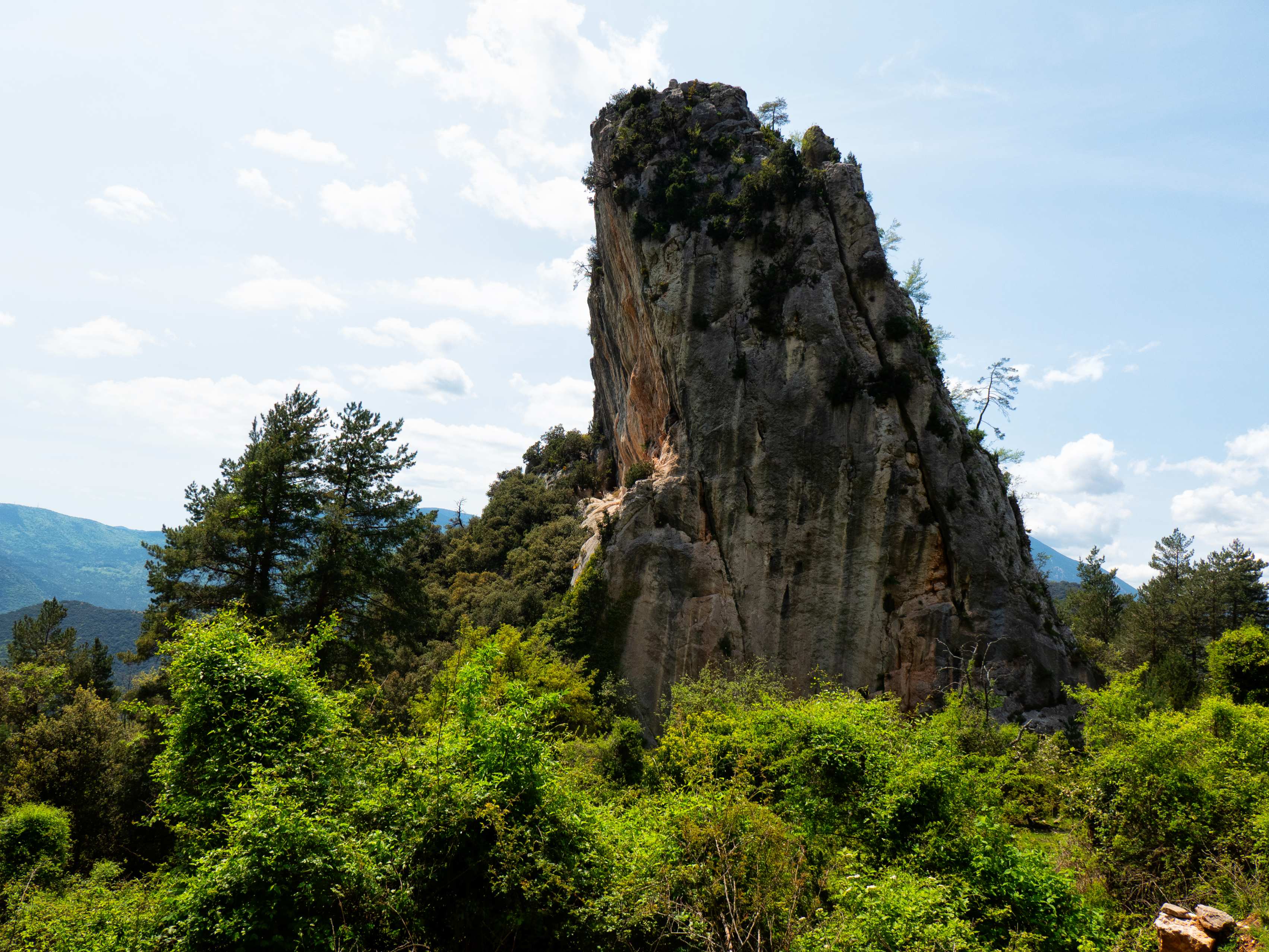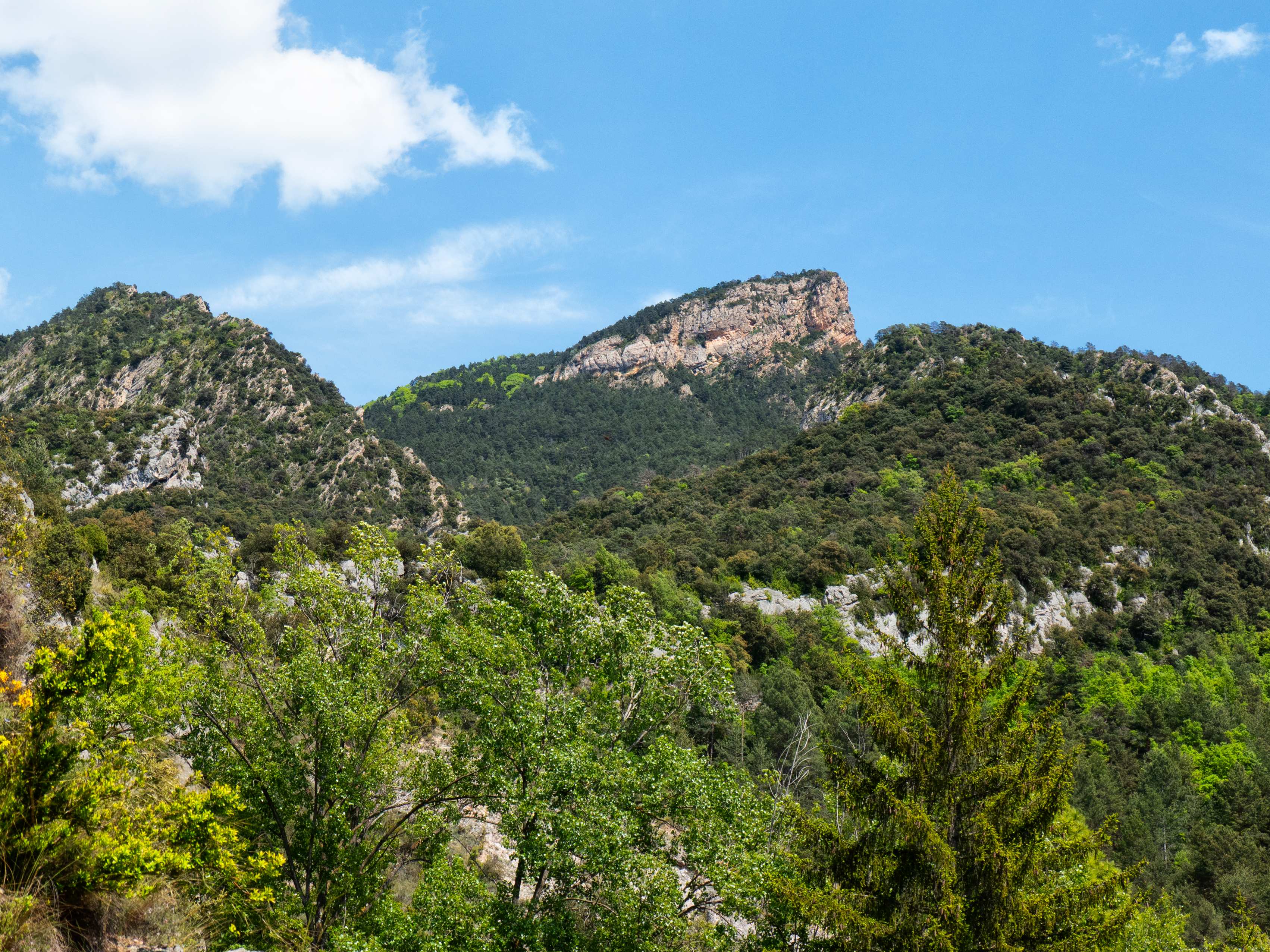 La bajada por el bosque es pronunciada y nos priva de panorámicas, aunque a media ladera aparece, entre las copas de los árboles, la punta de una impresionante aguja: la primera torre de les Agudes y la más alta y vertical, un torreón calizo de más de cincuenta metros.
