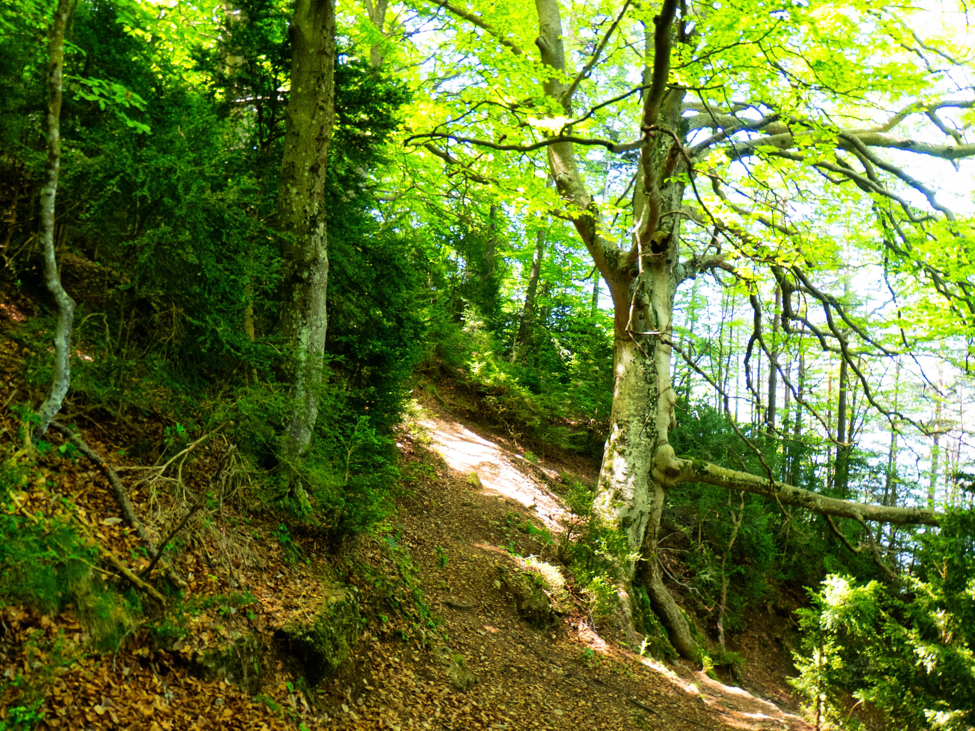 Volviendo al rellano, tomamos ahora el sendero que sube en dirección contraria, hacia el este, nuevamente por terreno muy pendiente.