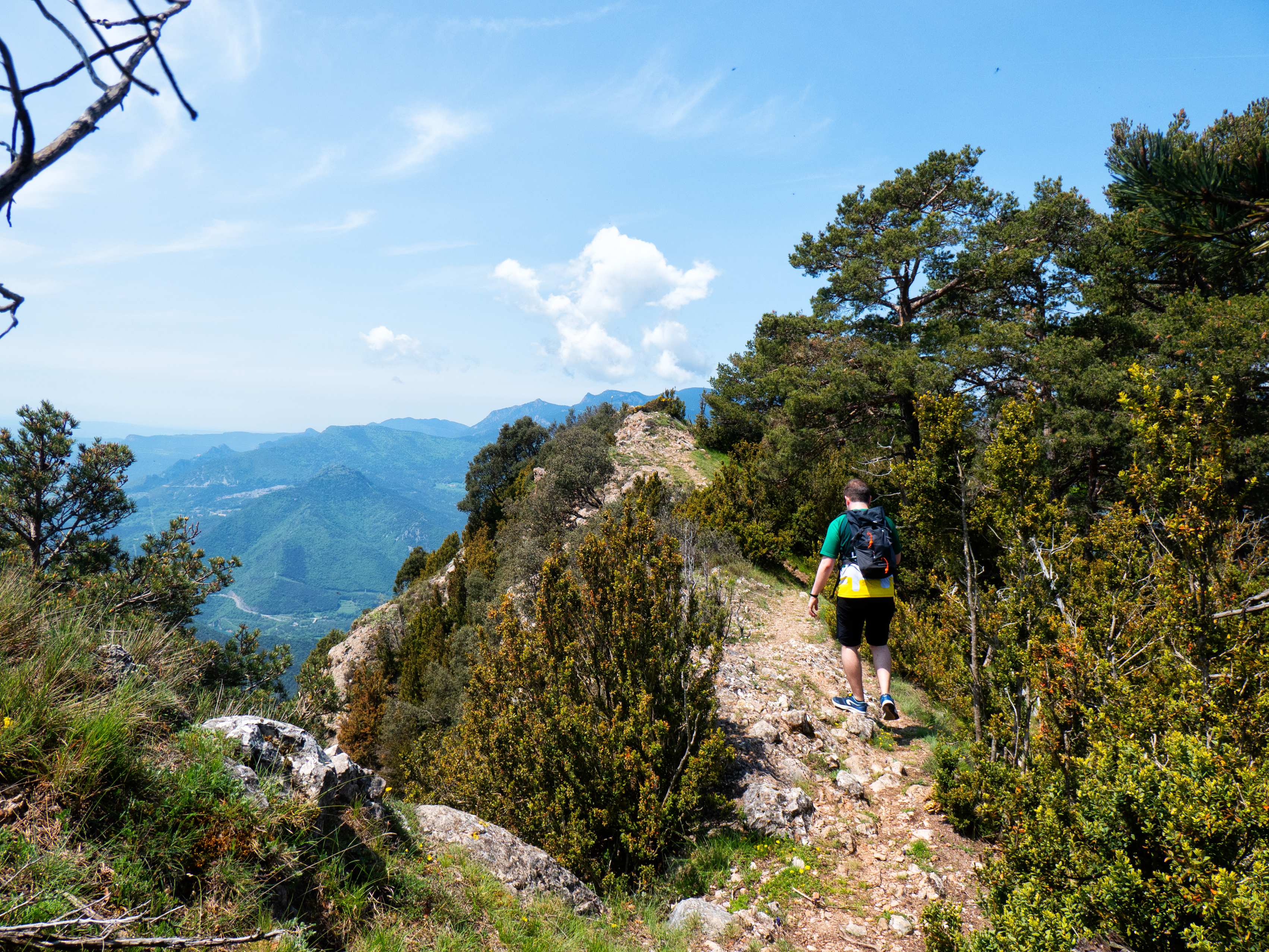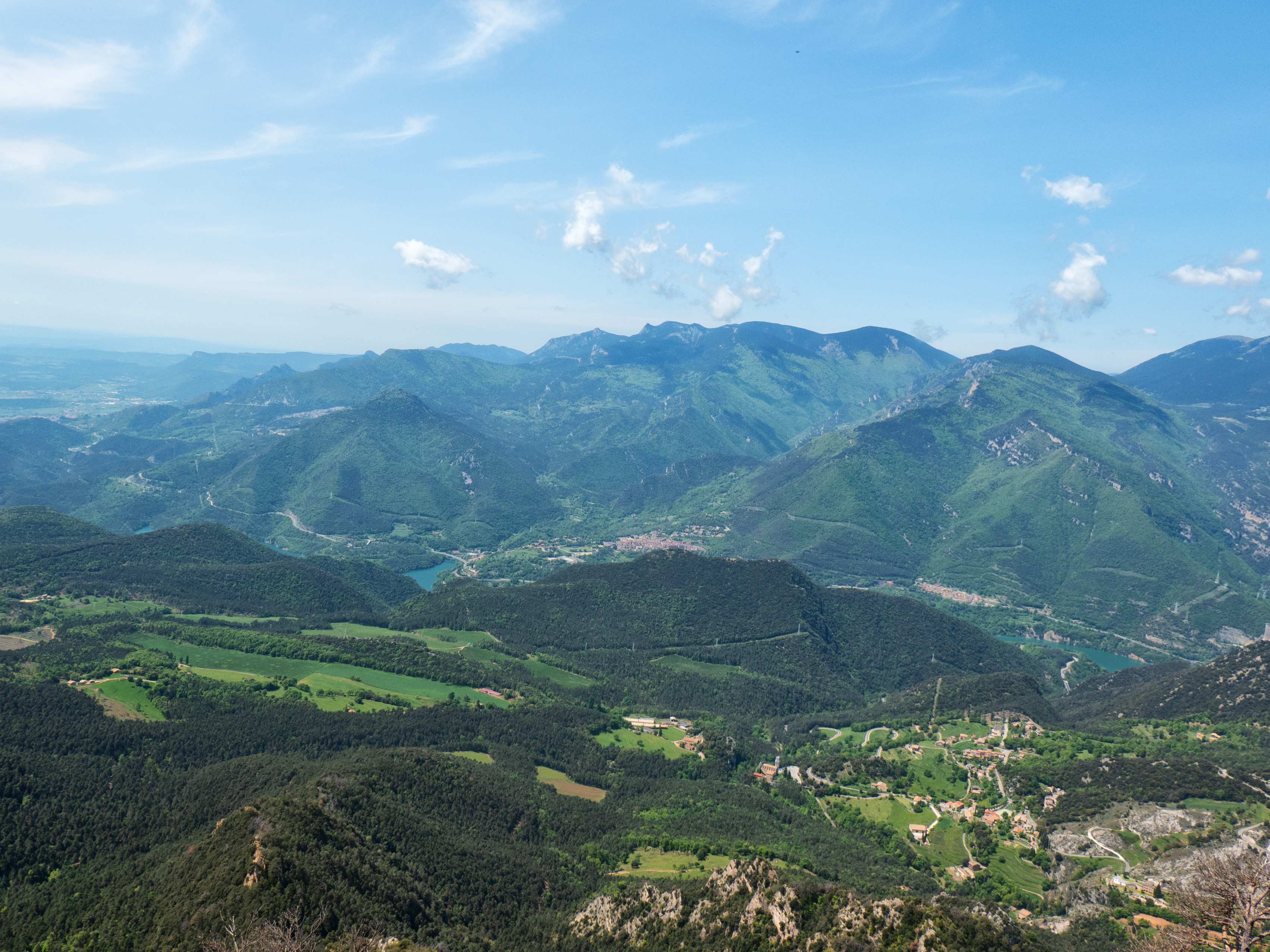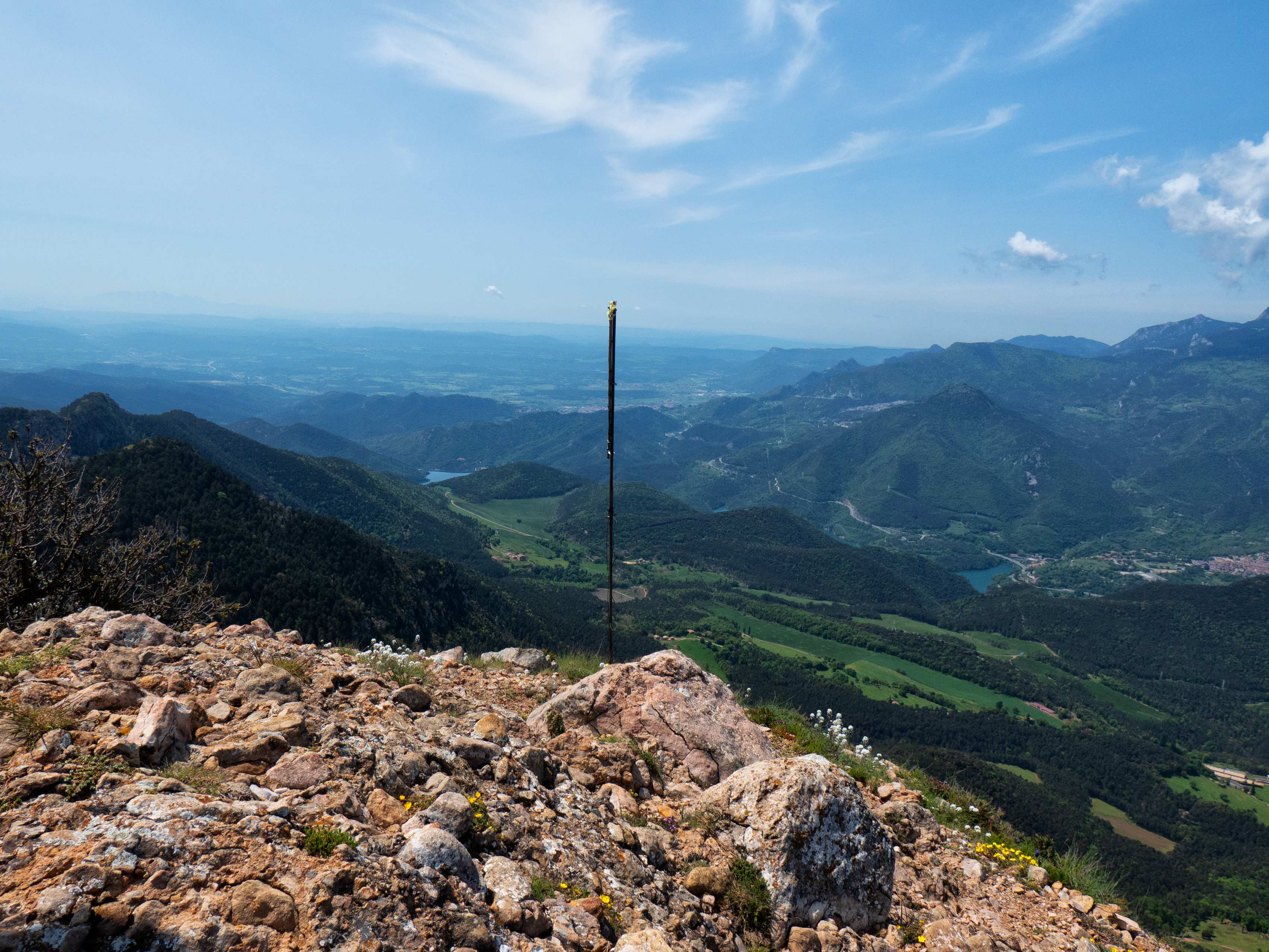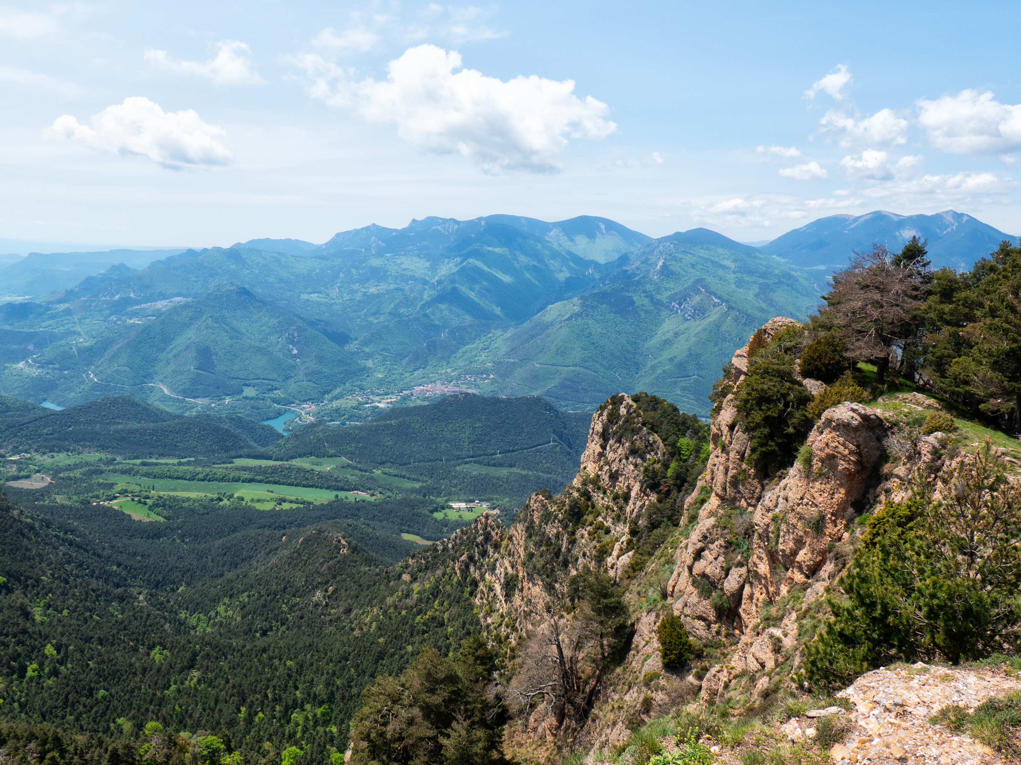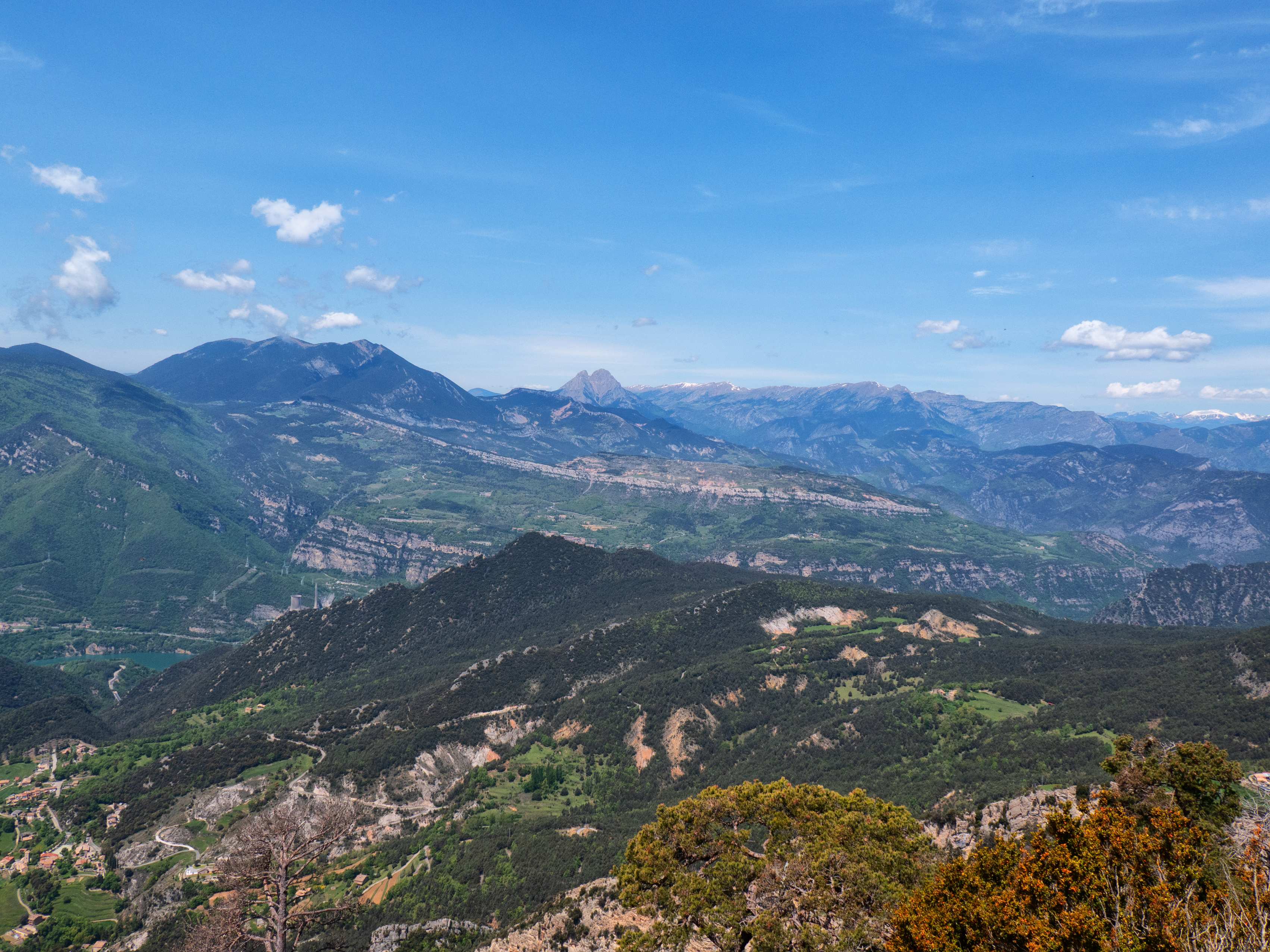 El Sobrepuny de Baix es, sin duda, uno de los mejores miradores de una de las mejores zonas de todo el Pirineo como es el Alt Berguedà, por su aislamiento, verticalidad y estratégica ubicación. La primera mirada se dirige inevitablemente hacia la Nou de Berguedà, el pequeño pueblo del que hemos partido y que, a pesar de quedar muy cerca en línea recta, está a un abismo de distancia, literalmente. Más allá, tras el río Llobregat, cuyas aguas están represadas por el pantano de la Baells, emergen los grandes colosos de la región, empezando por el boscoso macizo de los Rasos de Peguera y sus suaves domos.