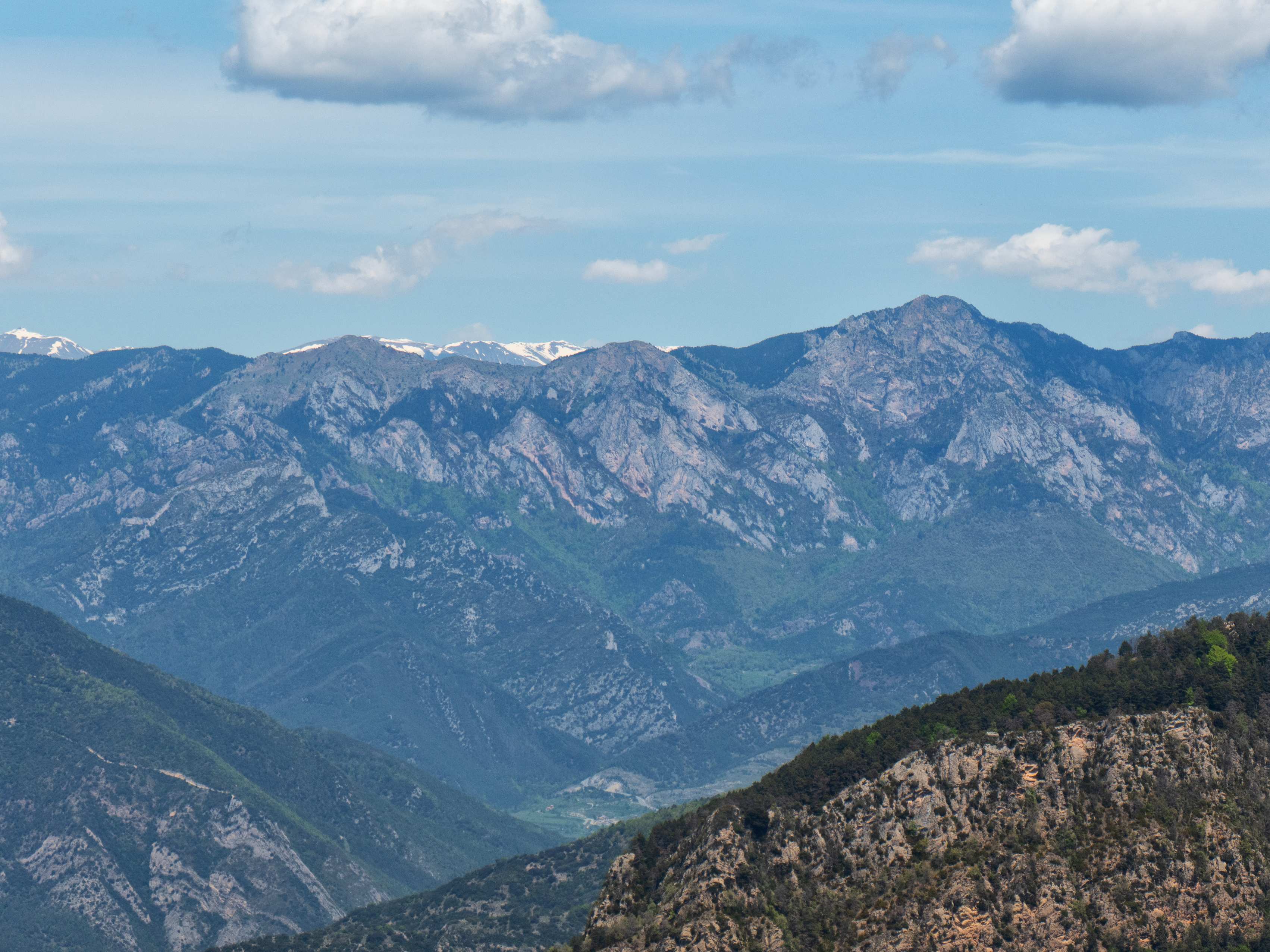 Por detrás del Coll del Pradell, que enlaza el Cadí con el Moixeró, aparecen las primeras montañas del Pirineo axial, coronadas por la Tossa Plana de Lles, uno de los grandes picos de la Cerdanya.