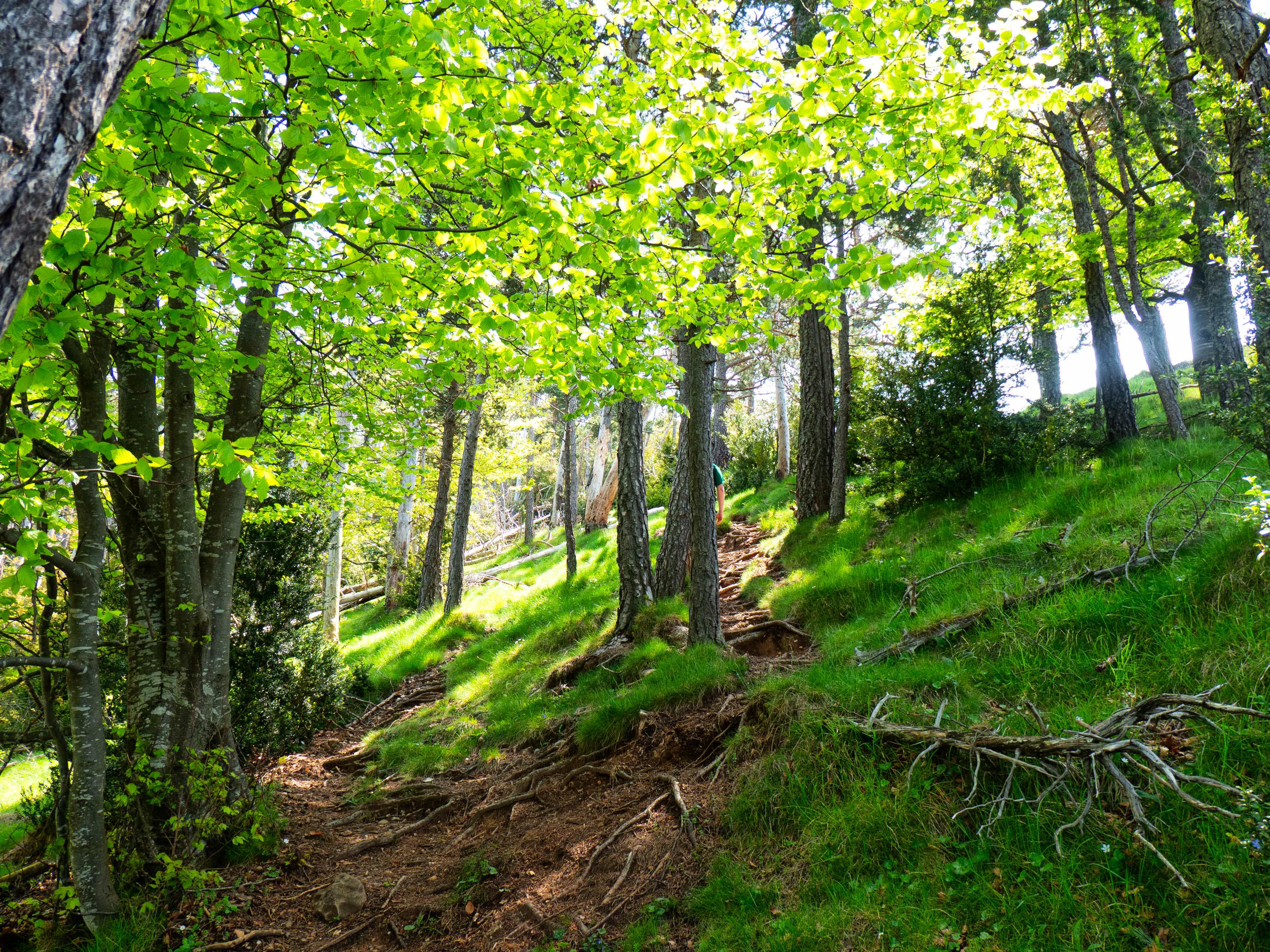 Después de un rato de andar por los Llisos de Caselles, la cara norte del Sobrepuny, llegamos a un pequeño rellano en el bosque, punto en el que nos unimos a la arista que enlaza los dos Sobrepunys.