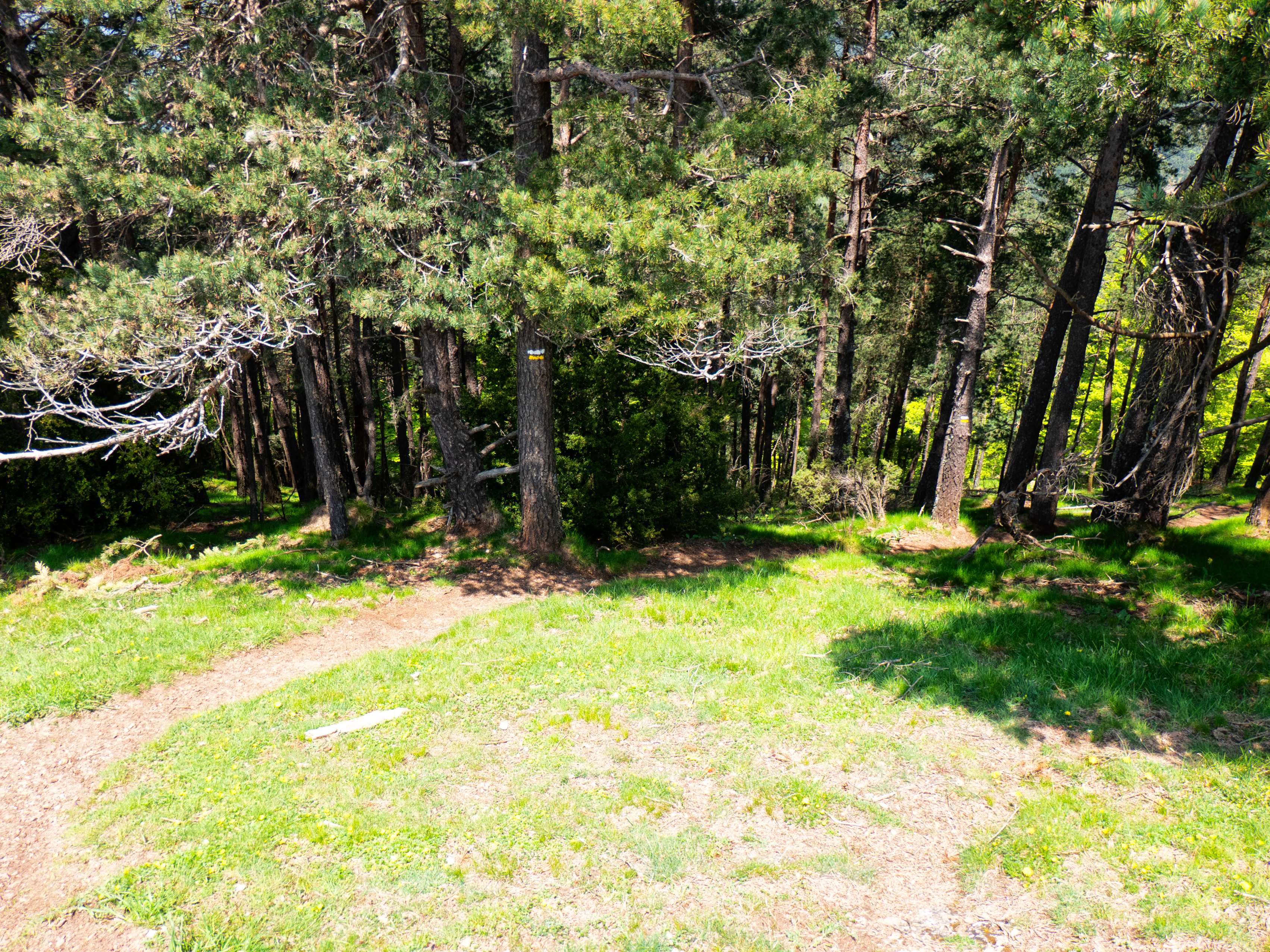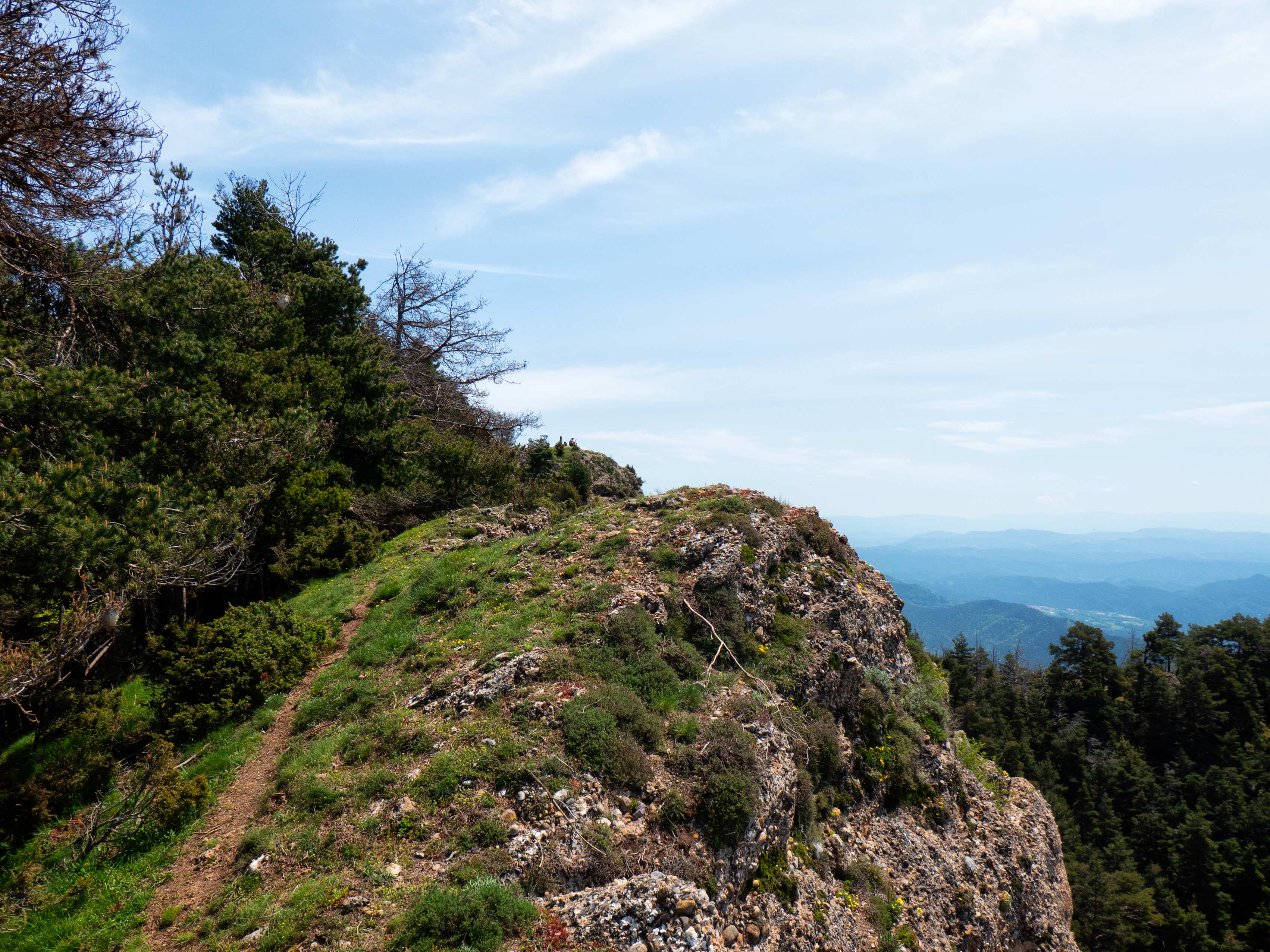 Después de ascender una cincuentena de metros, llegamos a un cruce de caminos, donde más adelante cerraremos la circular. De momento seguimos recto, guiados por las marcas amarillas que nos van a llevar hasta la misma cima, rumbo a...
