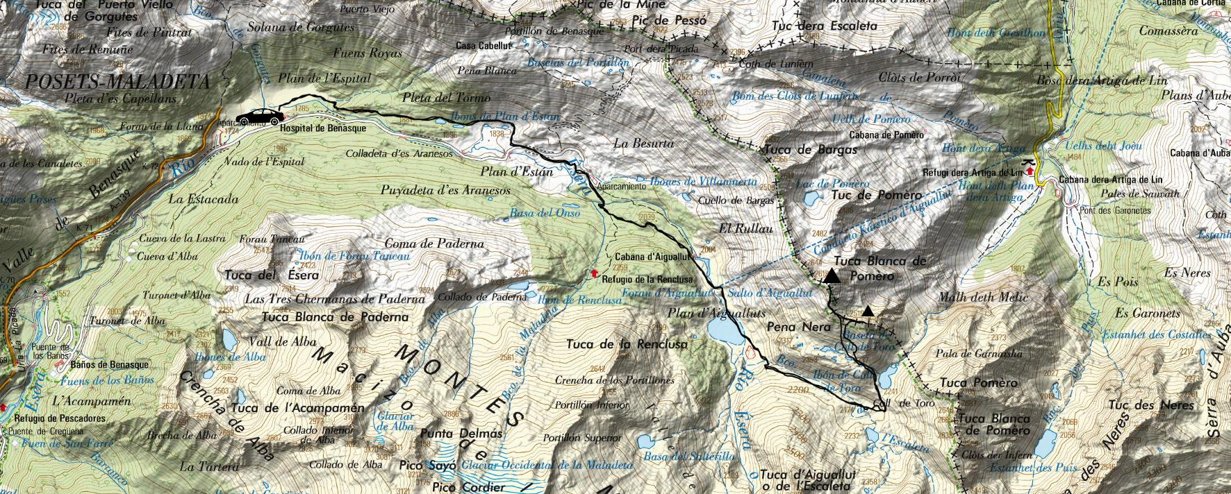La Tuca Blanca de Pomero es el pico que se sitúa en la vertical del archiconocido Plan d’Aigualluts, viéndose ya desde La Besurta como una ligera prominencia que destaca sobre la homogeneidad del cordal al que pertenece. El color viene dado por unas rocas de esa tonalidad que se encuentran presentes en su, parece, poco “destacada” vertiente oeste. Aun así, como se ve, a medida que nos vamos acercando a esta montaña vemos cómo sus formas se van afilando hasta formar un colmillo esbelto que, a pesar de su aspecto intimidante, no ofrece dificultad para hollar su cima pero que debido a su lejanía, resulta muy poco conocida por el público. Además, ofrece una panorámica extraordinaria sobre las Maladetas y sobre la Artiga de Lin y Aigualluts sin las multitudes que las ocupan, puesto que probablemente nos encontremos en absoluta soledad desde el Col de Toro hasta arriba. Todos estos factores convierten a la Tuca Blanca de Pomero en una cumbre muy atractiva para los montañeros amantes de la soledad y de las grandes panorámicas. Además, podemos aprovechar para hacer una cumbre secundaria que ofrece unas vistas inmejorables sobre el col de Toro y su ibón, la Pena Nera.