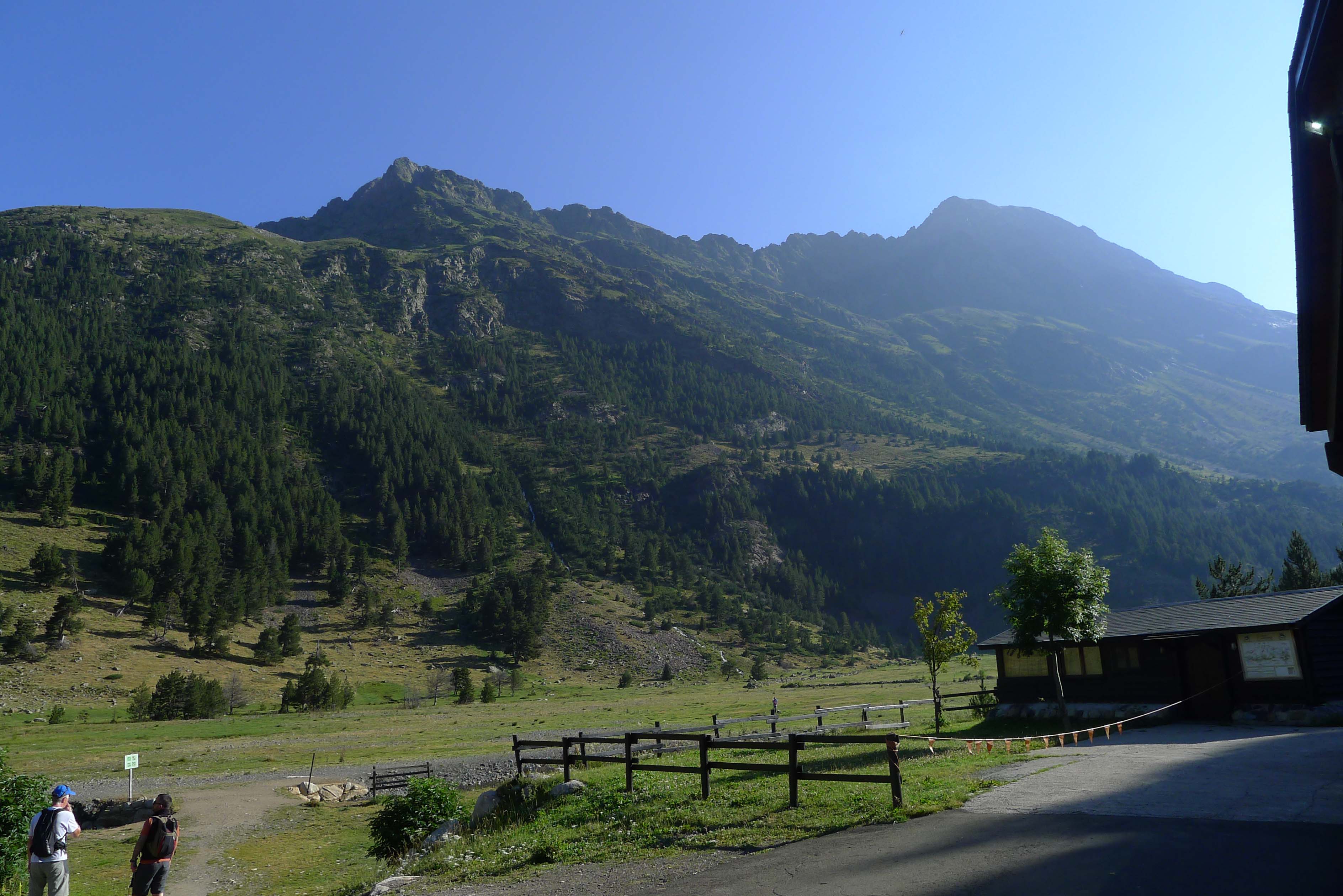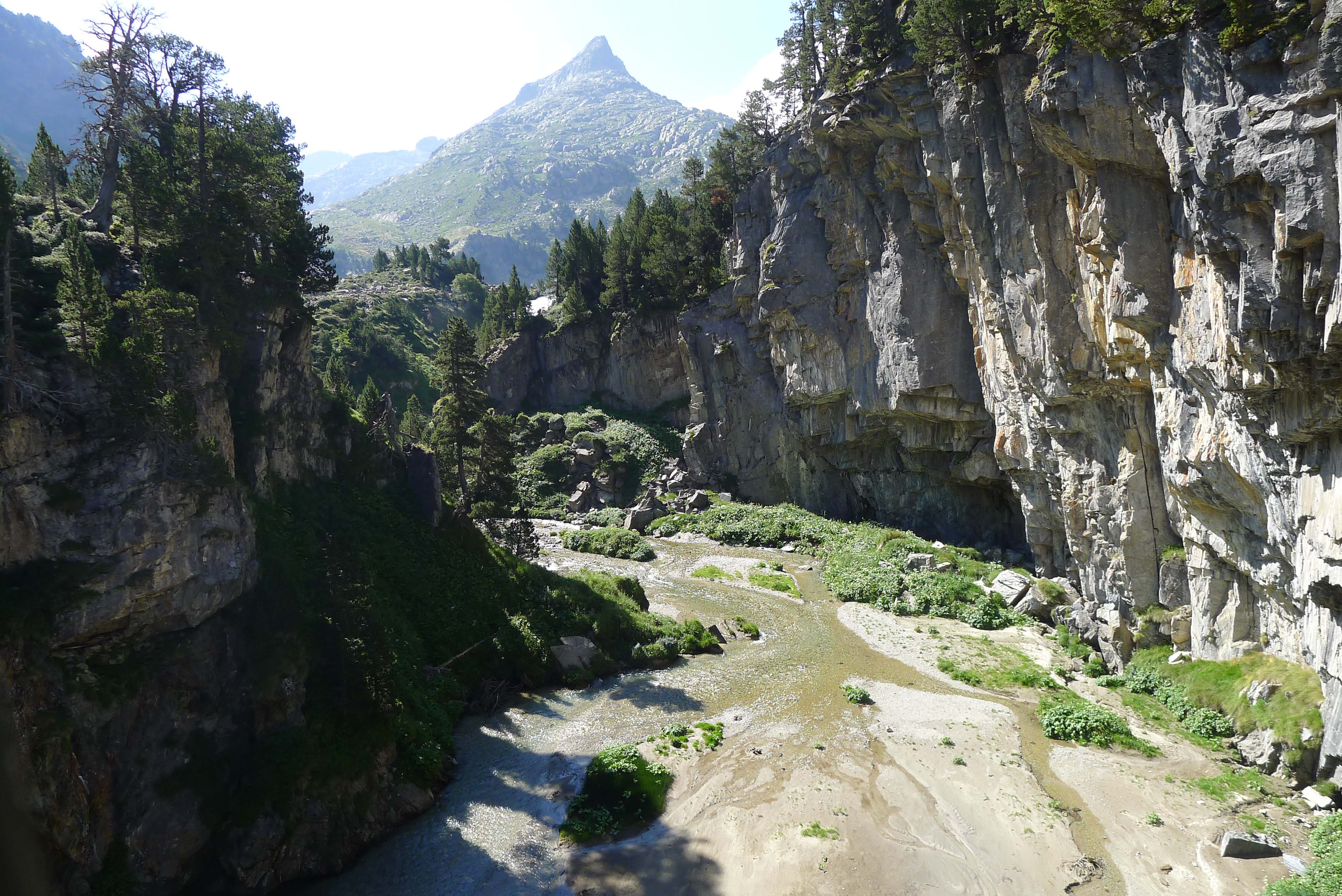 Un día más, el Salvaguardia observa desde las alturas como empezamos la ruta en los Llanos del Hospital. En primer lugar vamos por los prados de detrás del Hospital que es por donde se hace el esquí nórdico en invierno. El camino pasa por el lado de los antiguos hospitales, destruidos por los aludes procedentes del Salvaguardia, que se yergue inexpugnable sobre nosotros y luego entra en un bosque, que tiene partes arrasadas por los mismos aludes.