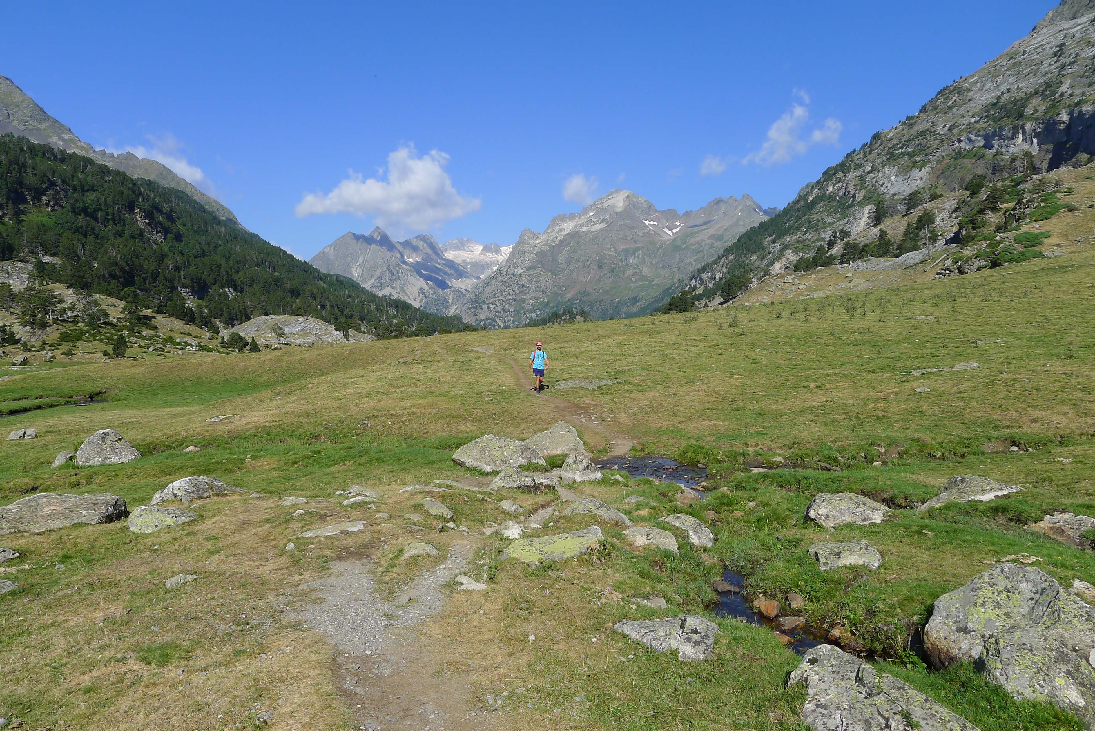 Poco a poco el bosque se va despejando y entra en el Plan de l’Están, donde nos encontramos con la carretera que va a la Besurta y que obviamos. No tardamos en llegar al parking de la Renclusa, donde tomaremos el trillado camino de Aigualluts y la Renclusa. En el Plan d'Están, con las cumbres de Remuñe en el horizonte.