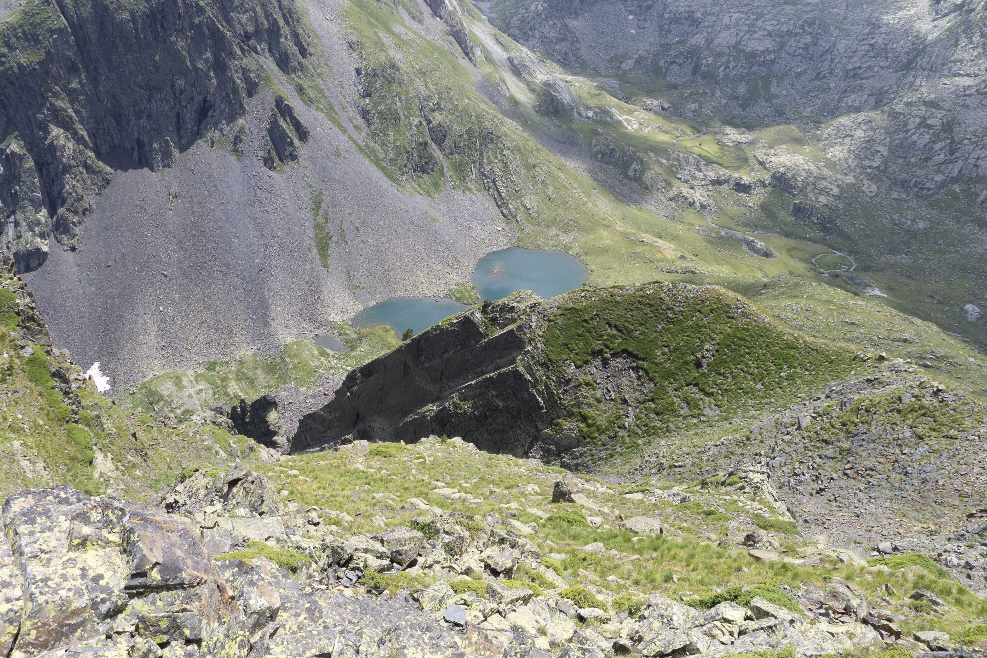El terreno se desploma hacia el este en dirección al profundo boquete donde se asiente el ibón de Coll deth Hòro.