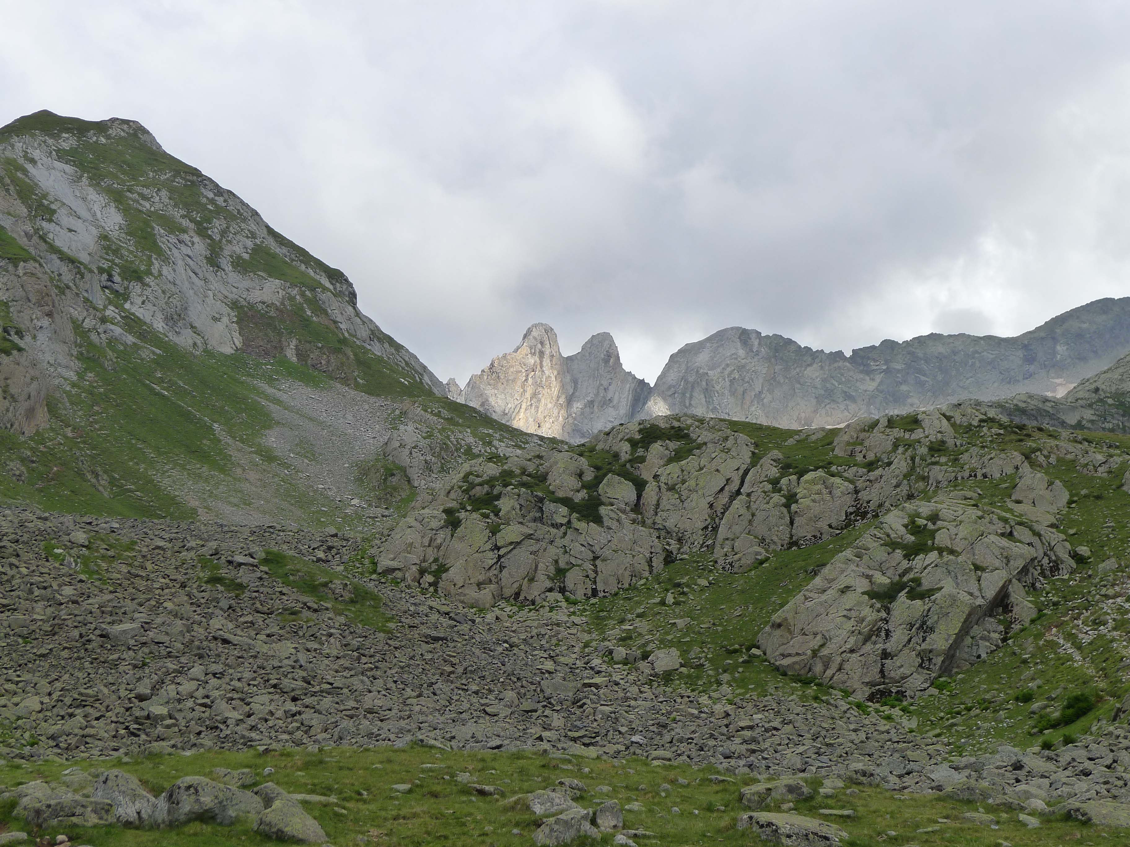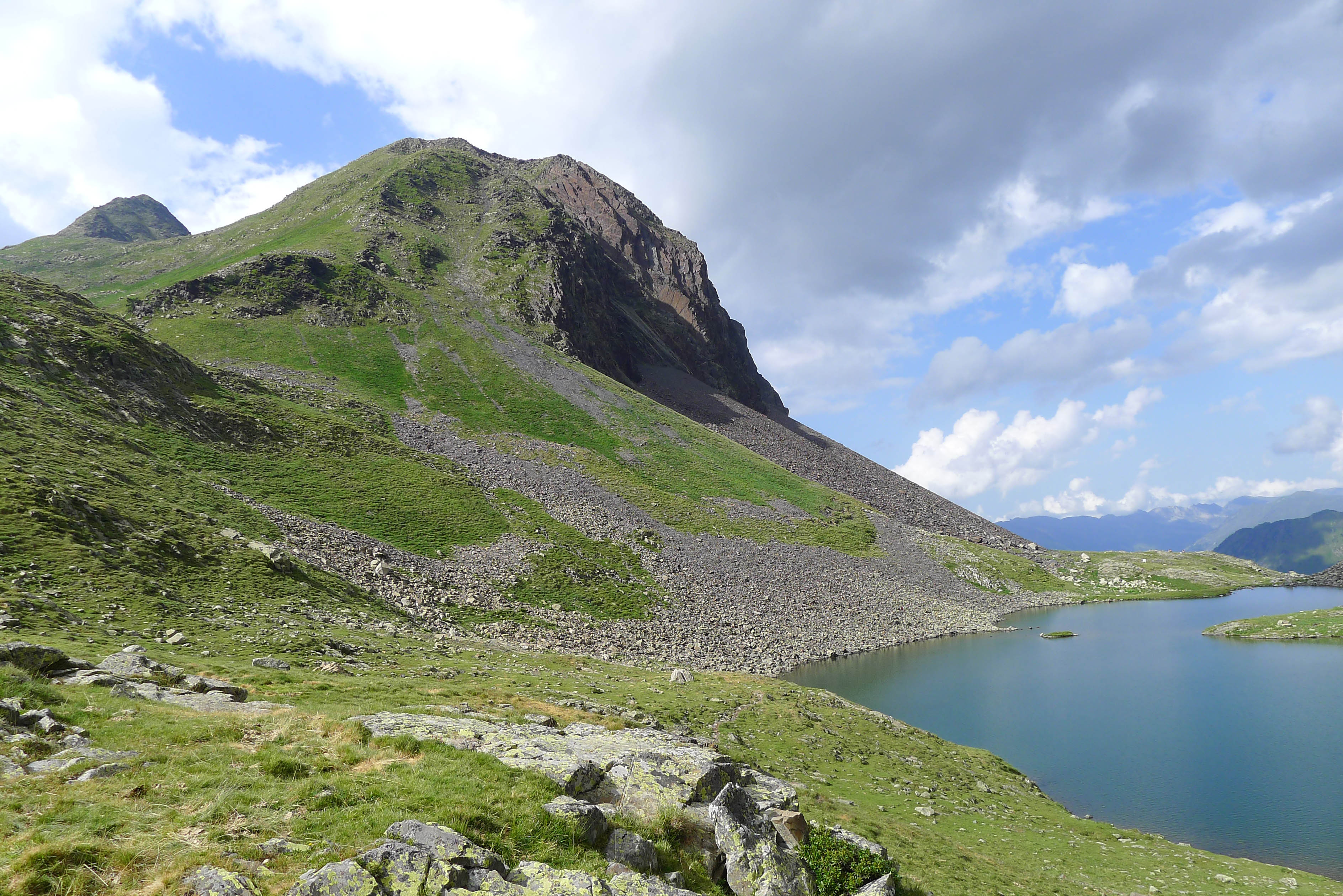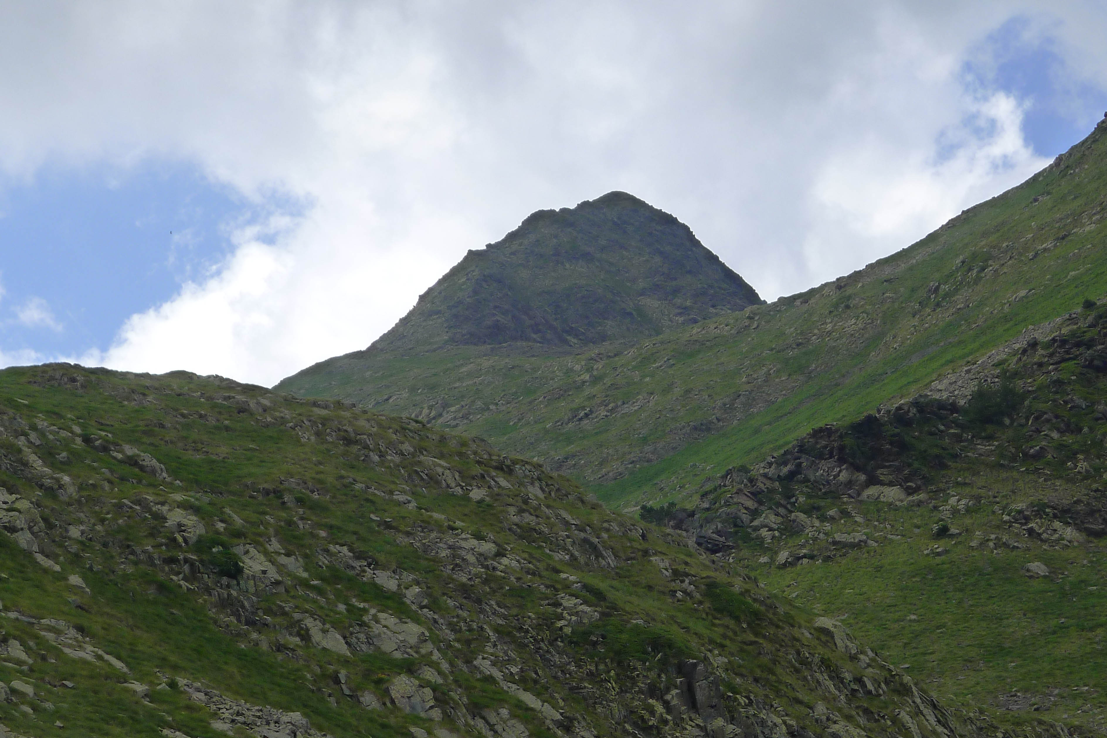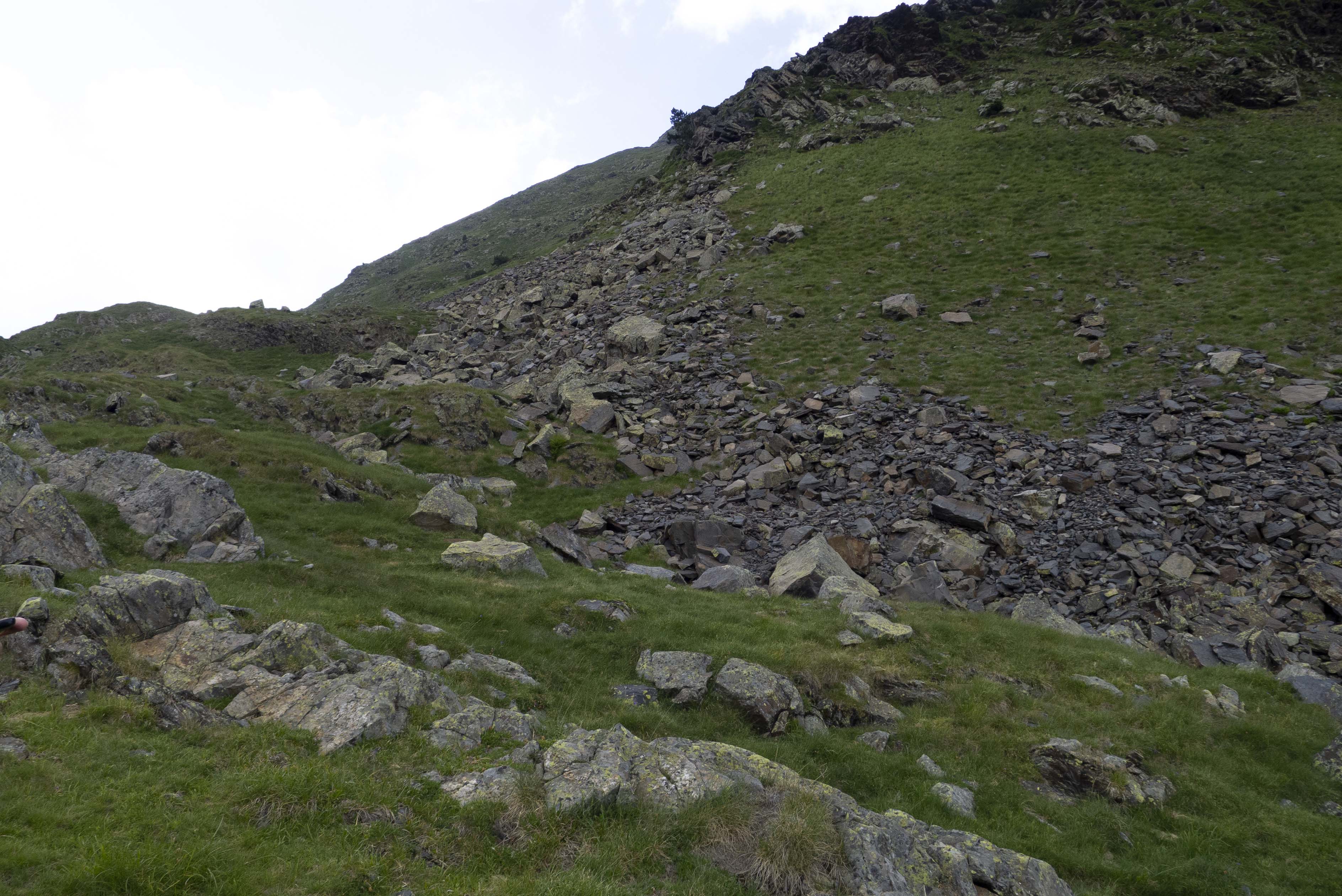 La Pena Nera impone desde el Coll deth Hòro. Pero nos fijamos más en el diente que asoma a su izquierda, la Tuca Blanca de Pomero. Primero ascenderemos por las pendientes herbosas de la izquierda, esquivando las pedreras.